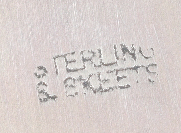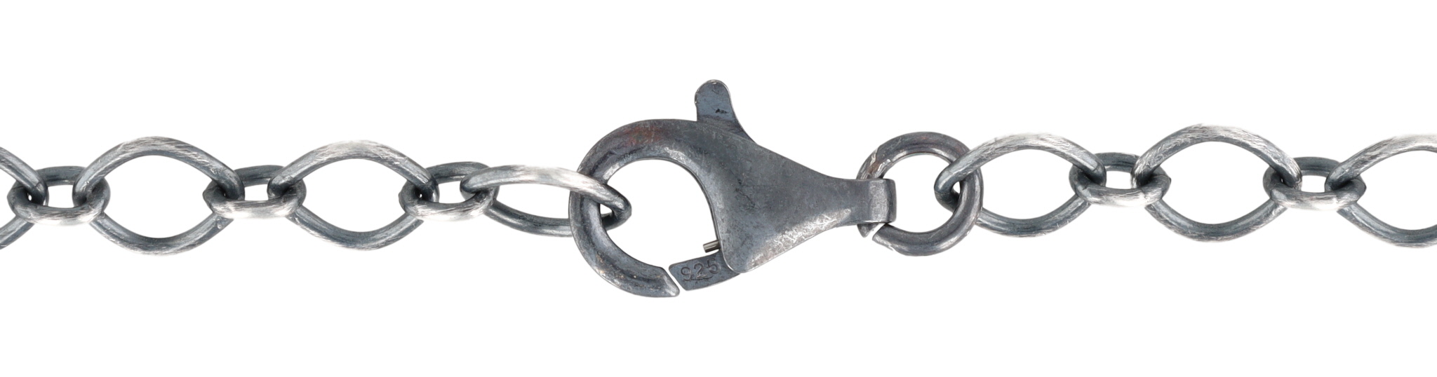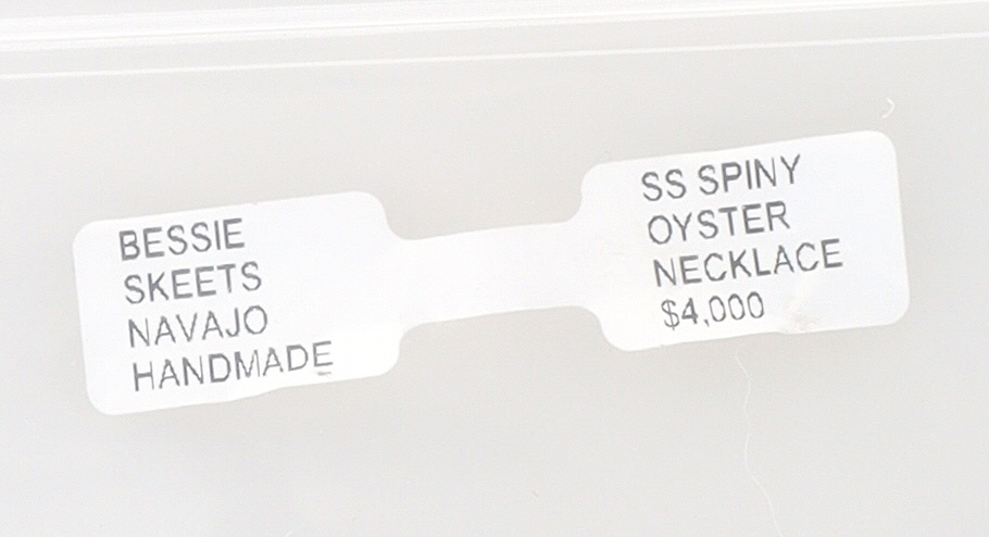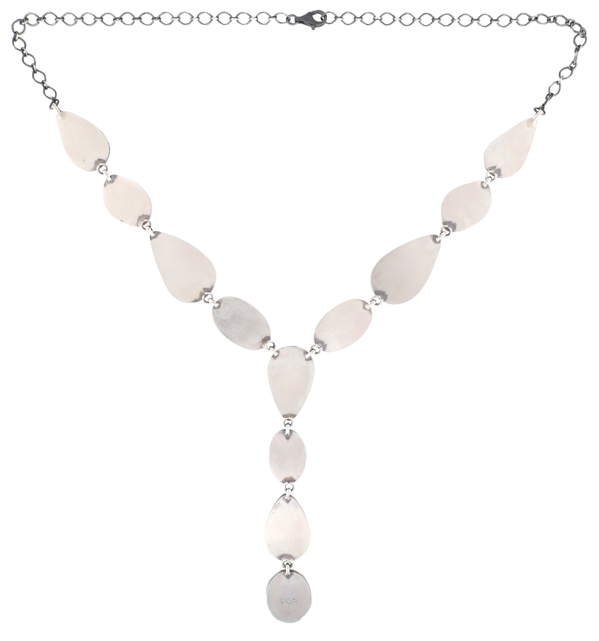 A Navajo sterling silver Y-shaped necklace by Bessie Skeets, featuring interconnected, bezel-set cabochons of varying teardrop and oval shapes. The stones display natural variations in color, predominantly orange and a mottled purplish-red, consistent with Spiny Oyster shell. The settings and rolo-style link chain are silver-toned metal, marked "925" on the lobster clasp. An impressed mark "STERLING B. SKEETS" is visible on the reverse of the lowest pendant. An attached tag further identifies the piece as an "SS SPINY OYSTER NECKLACE" by "BESSIE SKEETS NAVAJO HANDMADE."
