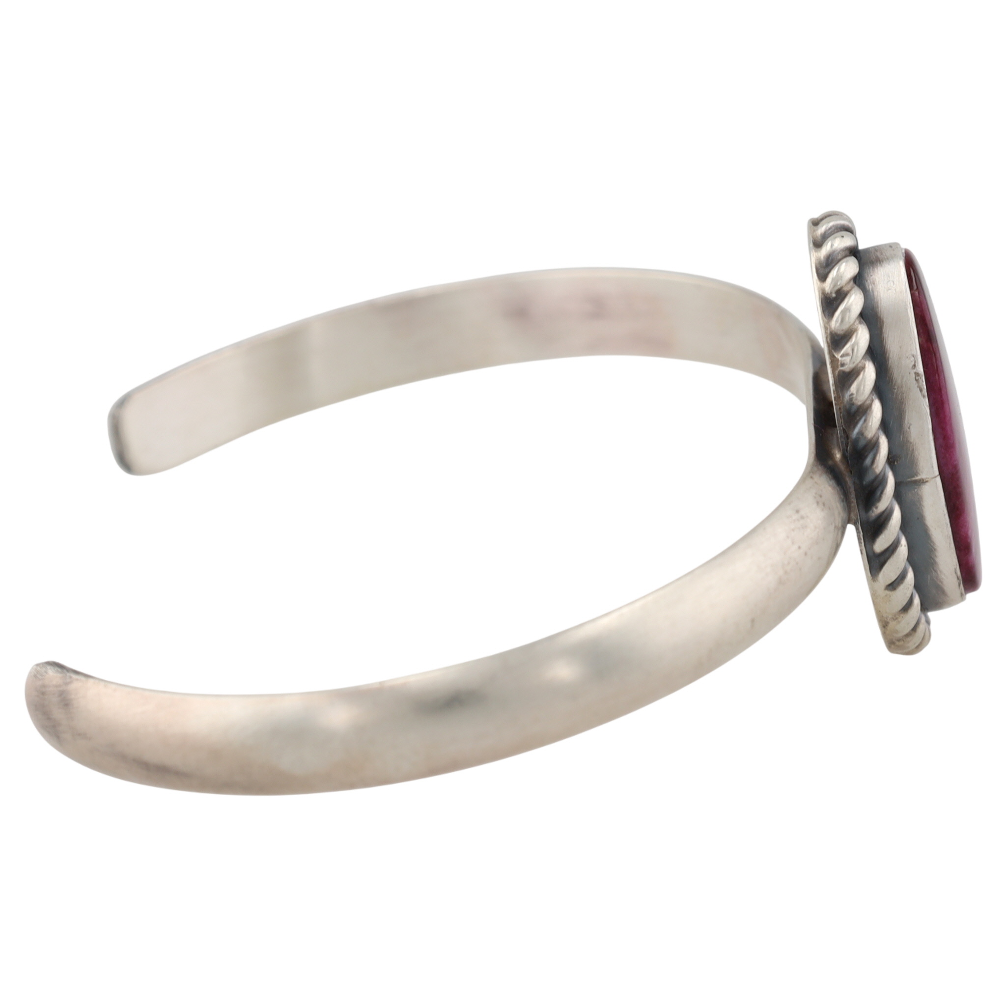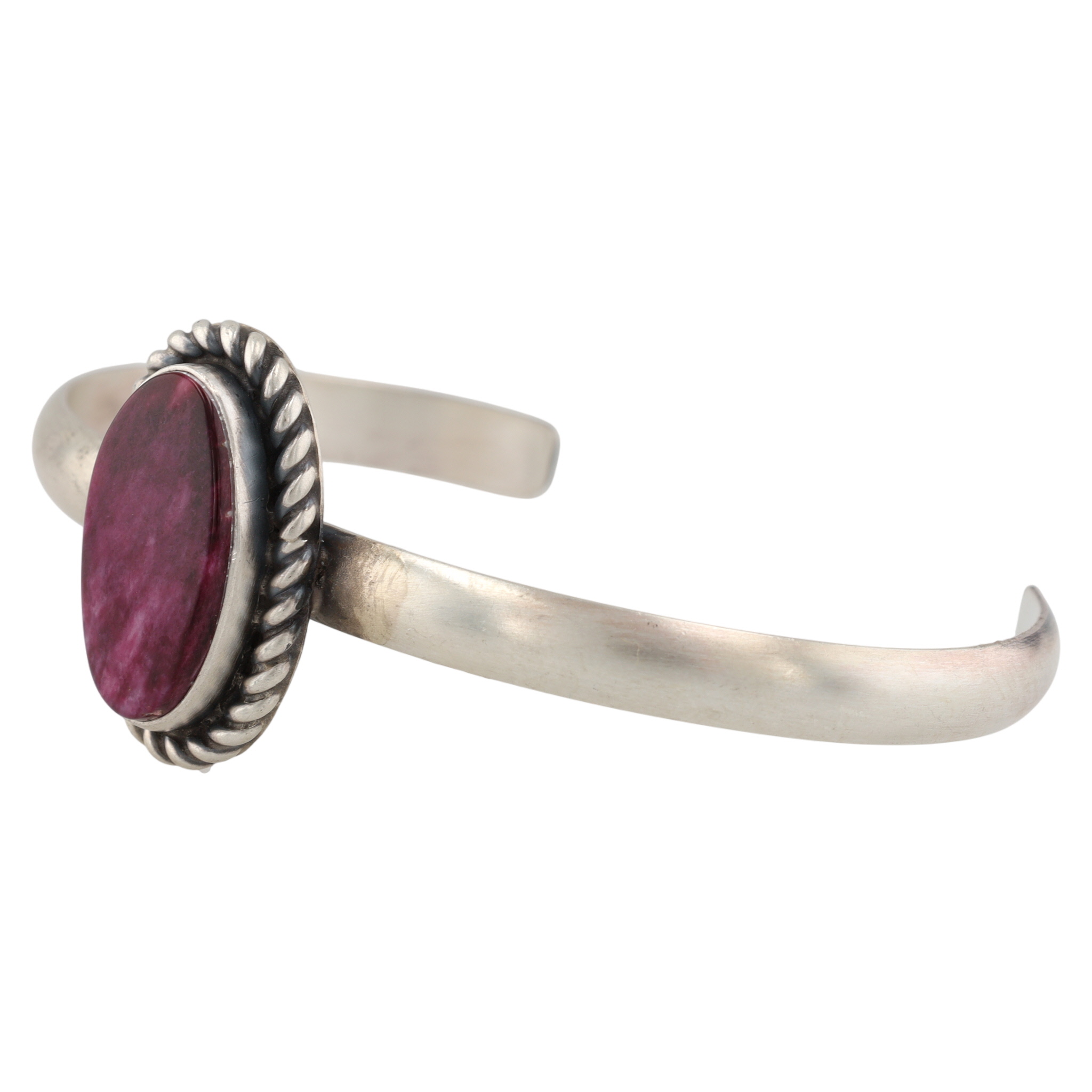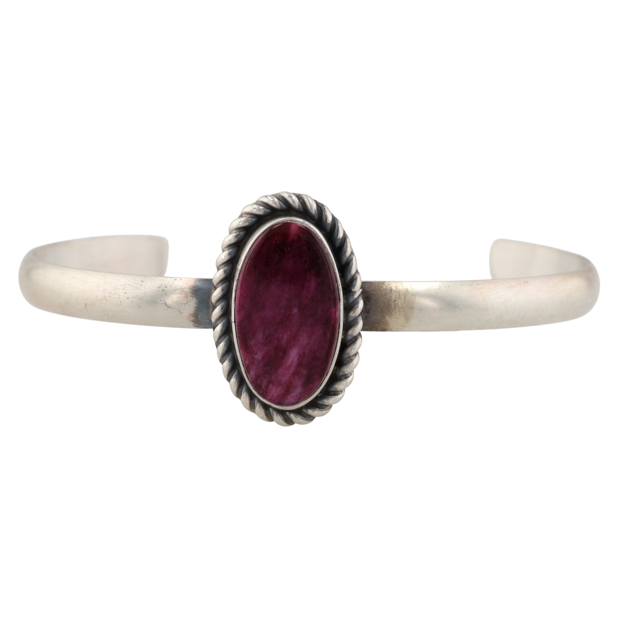 A Navajo handmade sterling silver cuff bracelet by Antionette Martinez, featuring a centrally mounted oval cabochon stone of a deep reddish-purple hue, identified as spiny oyster. The stone is set within a smooth bezel bordered by a twisted rope detail. The bracelet band is plain with open ends. The interior of the band is stamped with "Sterling" and an additional capital "A" mark.