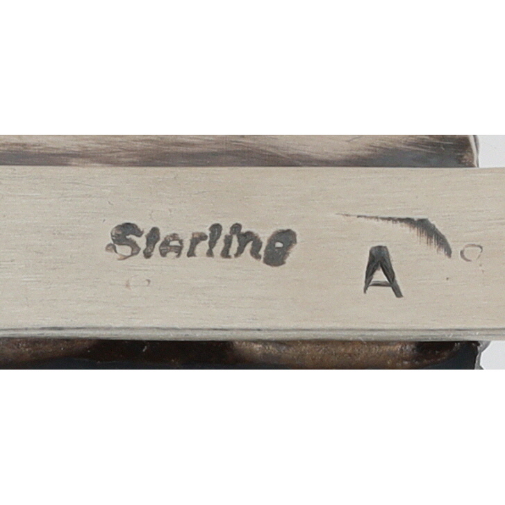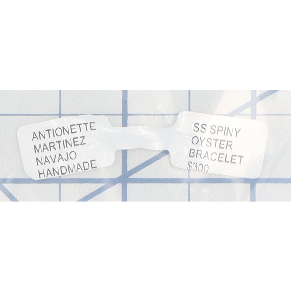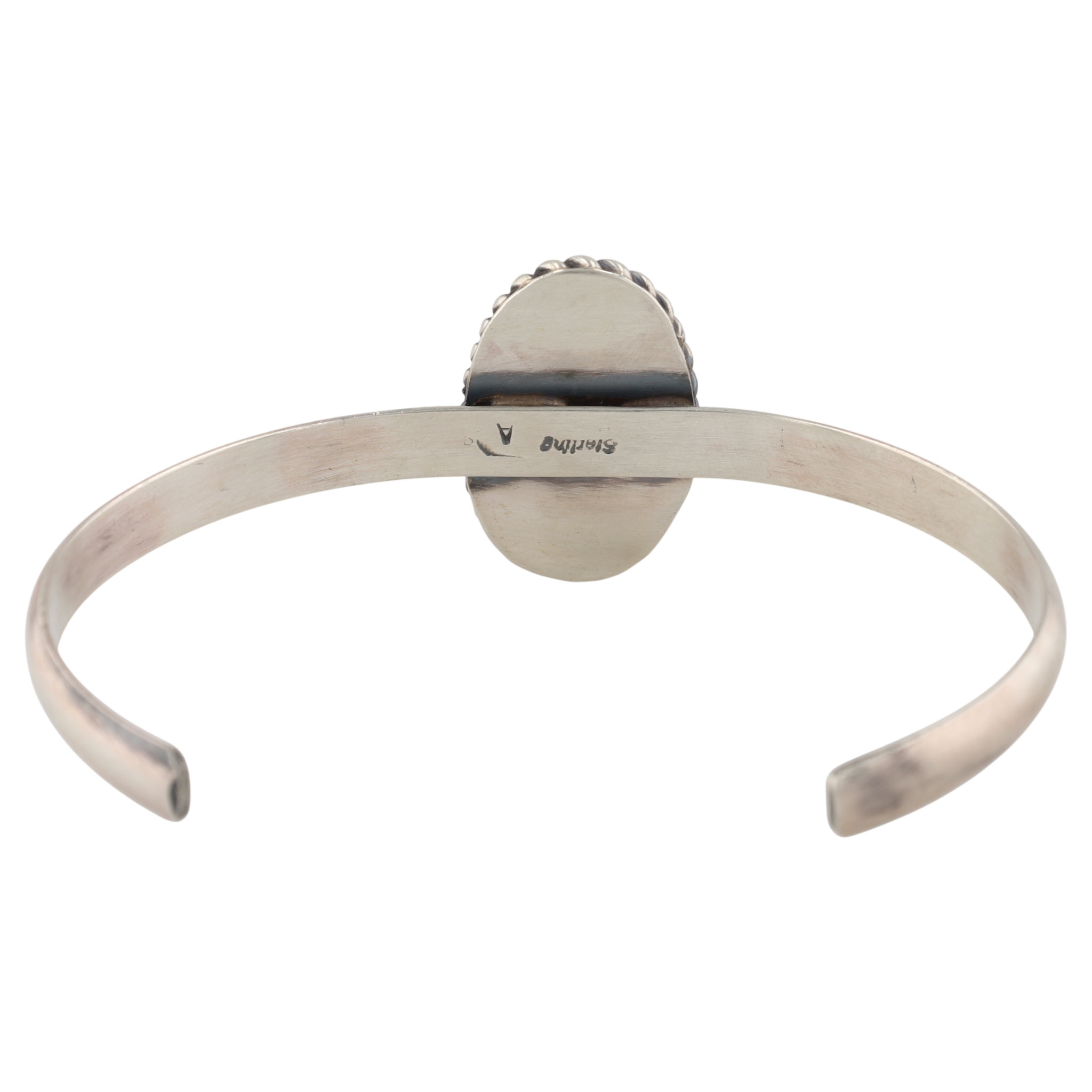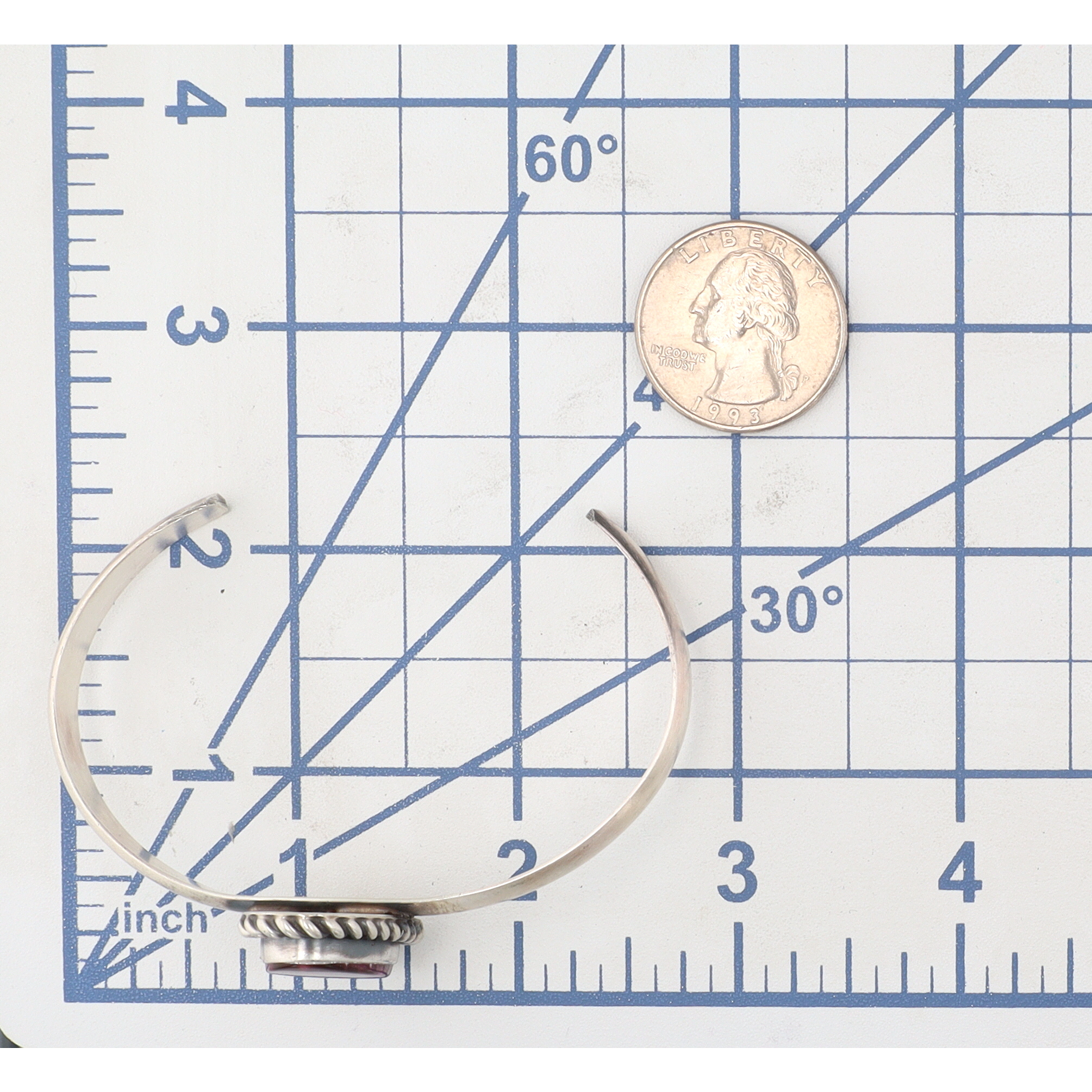 A Navajo handmade sterling silver cuff bracelet by Antionette Martinez, featuring a centrally mounted oval cabochon stone of a deep reddish-purple hue, identified as spiny oyster. The stone is set within a smooth bezel bordered by a twisted rope detail. The bracelet band is plain with open ends. The interior of the band is stamped with "Sterling" and an additional capital "A" mark.