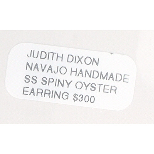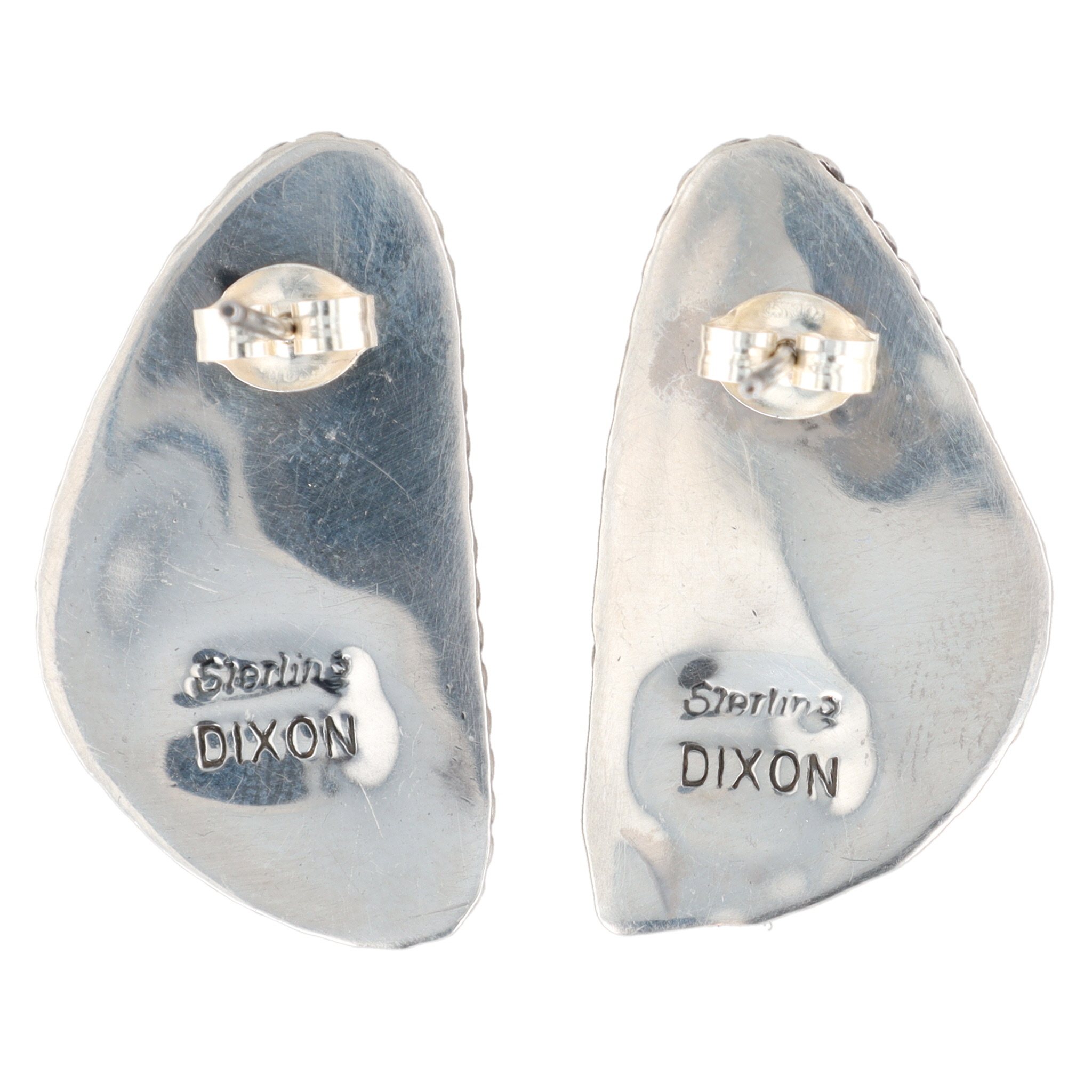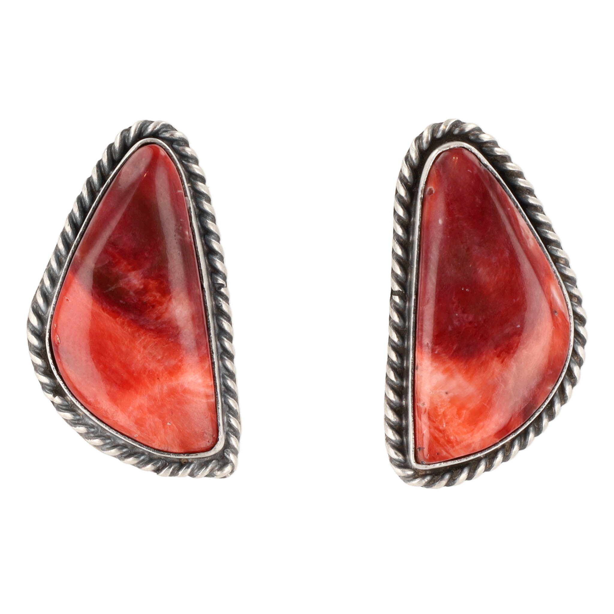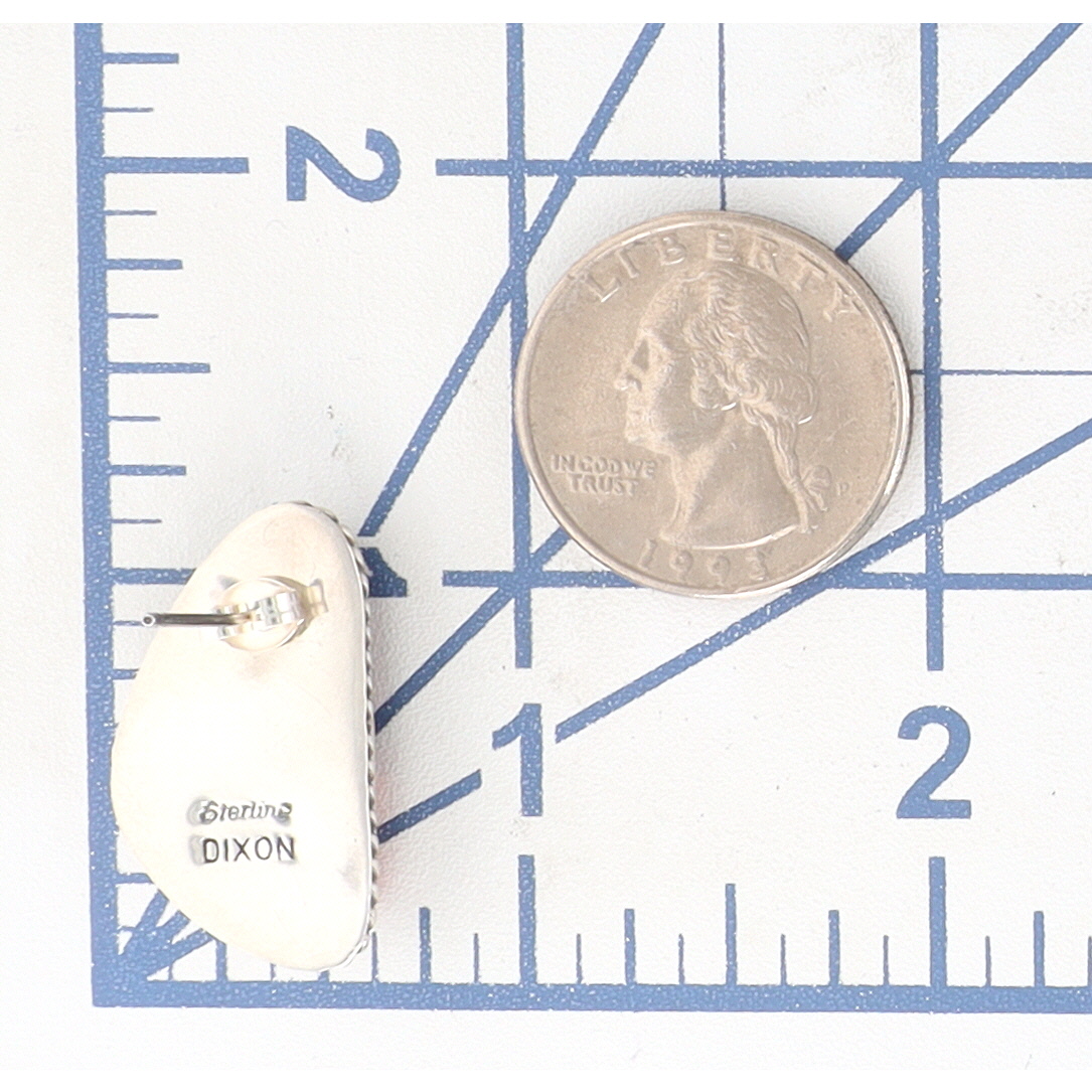 A pair of Navajo handmade sterling silver earrings by Judith Dixon, each featuring an irregularly shaped, polished red-orange spiny oyster cabochon with natural color variations and striations, set in a sterling silver bezel. The bezel is further accented with a twisted rope-style border. The earrings are equipped with posts and butterfly backings. The reverse of each earring is clearly stamped with the marks "Sterling" and "DIXON".