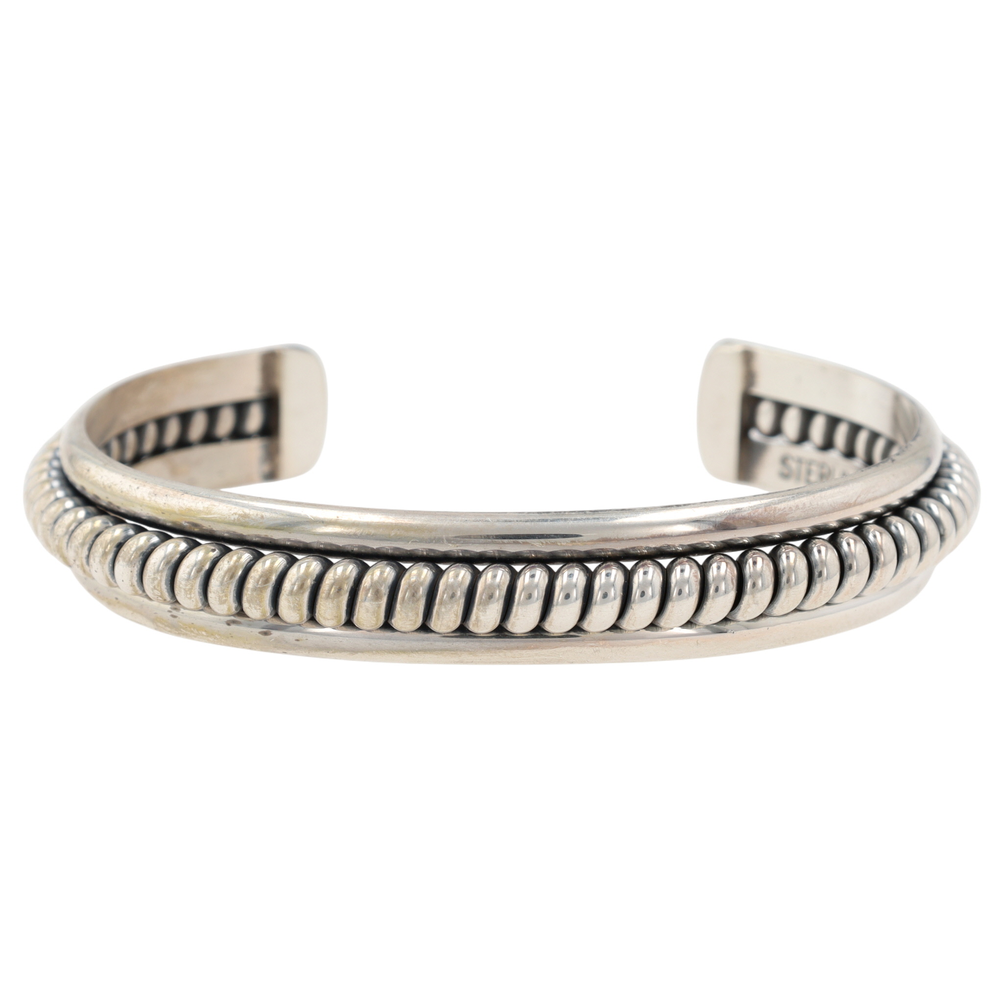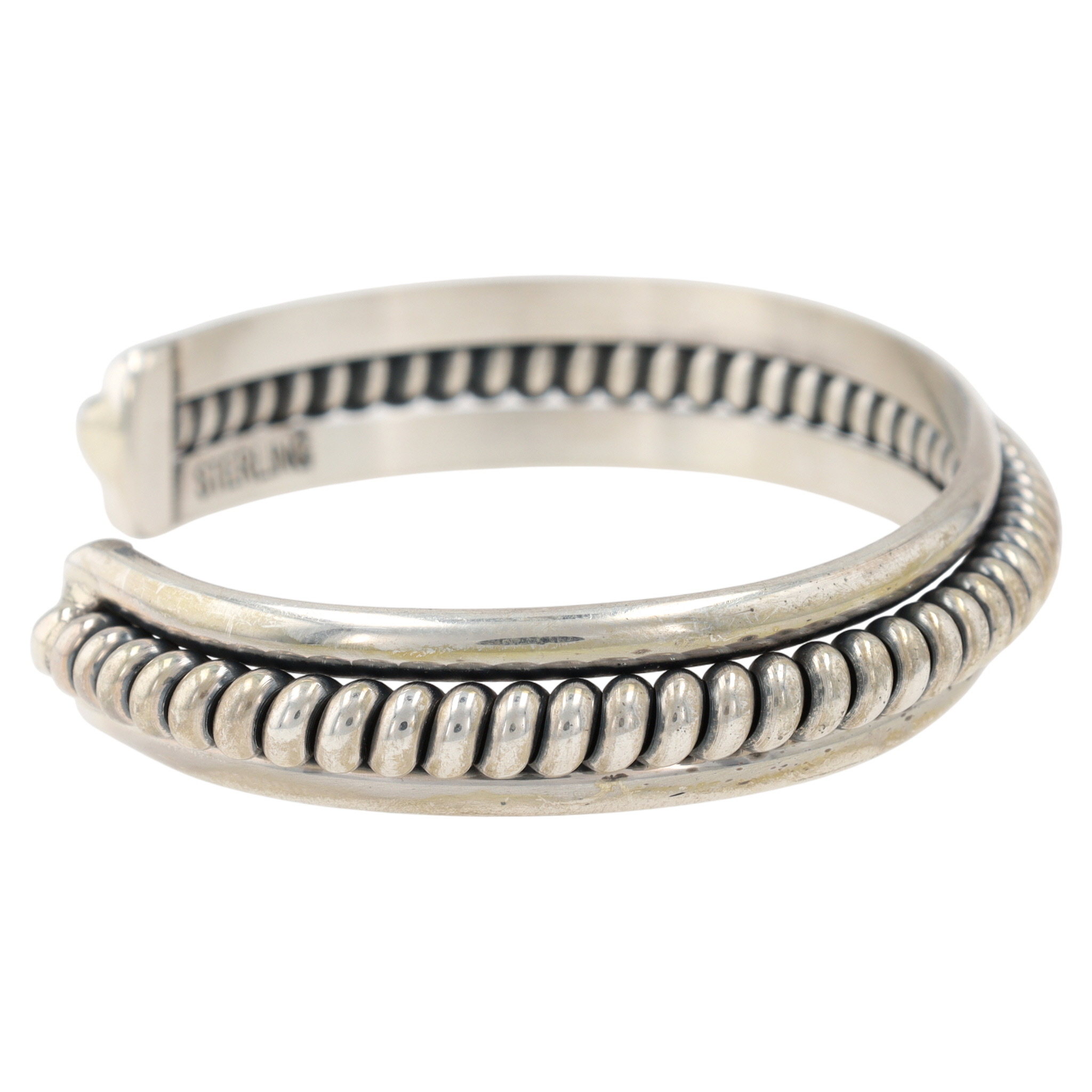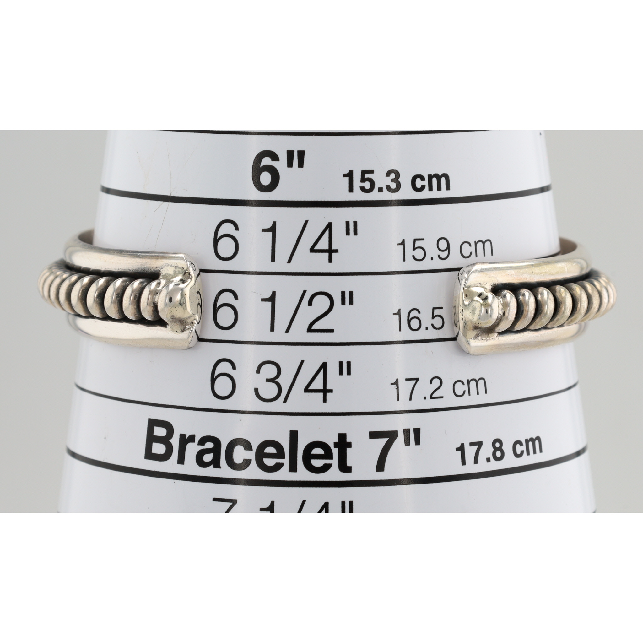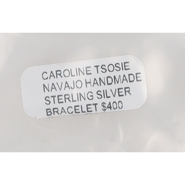 A Navajo sterling silver cuff bracelet by Caroline Tsosie, featuring a prominent central twisted rope design flanked by smooth outer bands. The interior of the bracelet is clearly marked "STERLING."