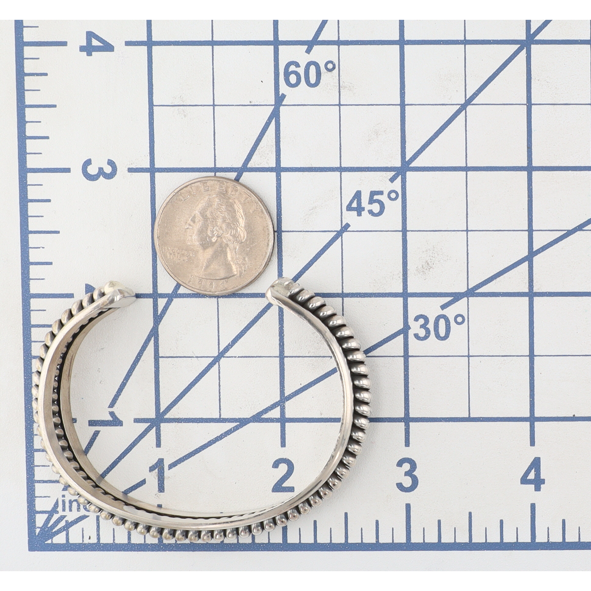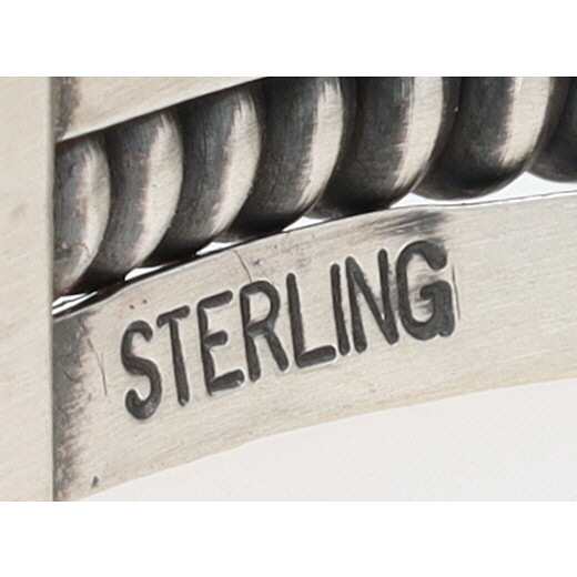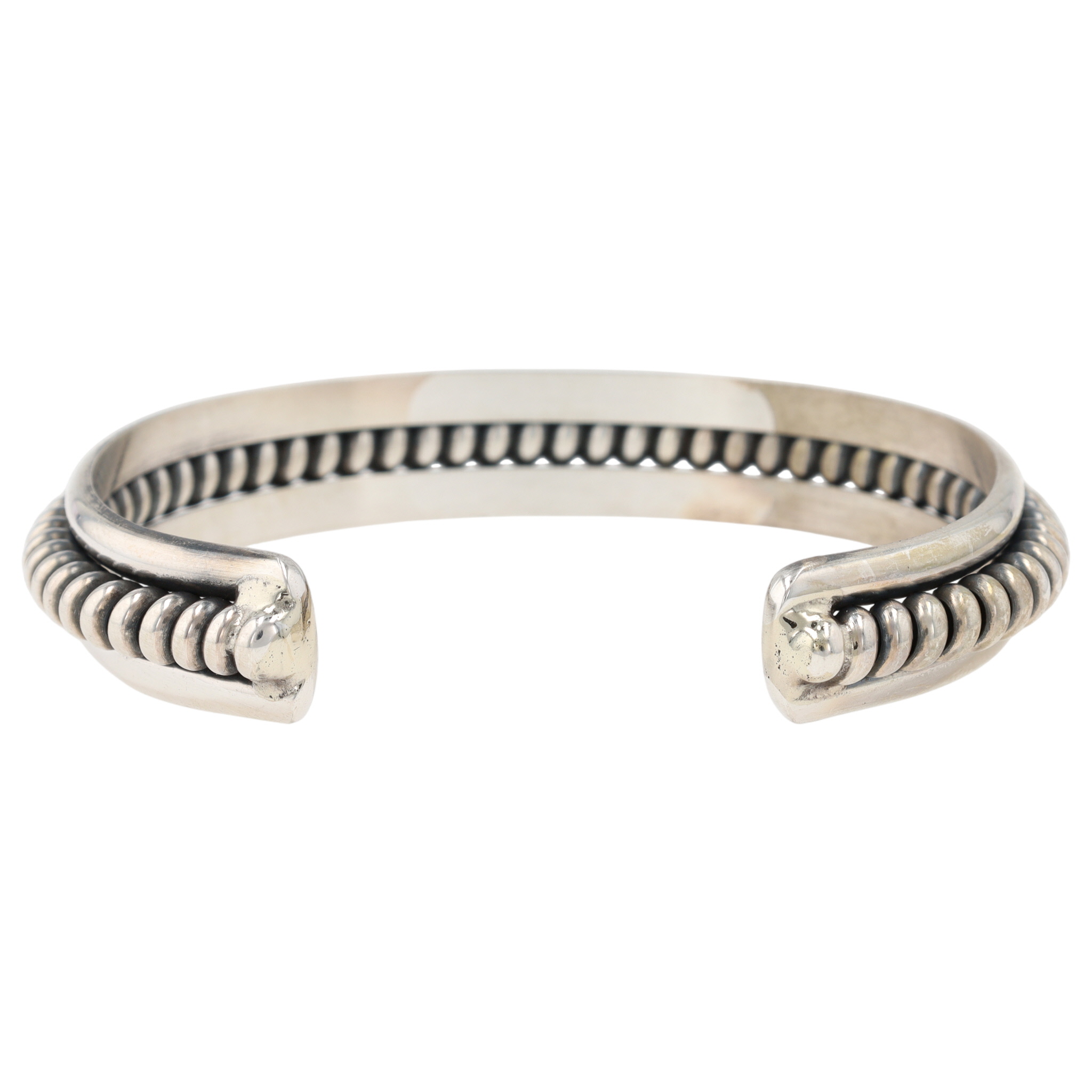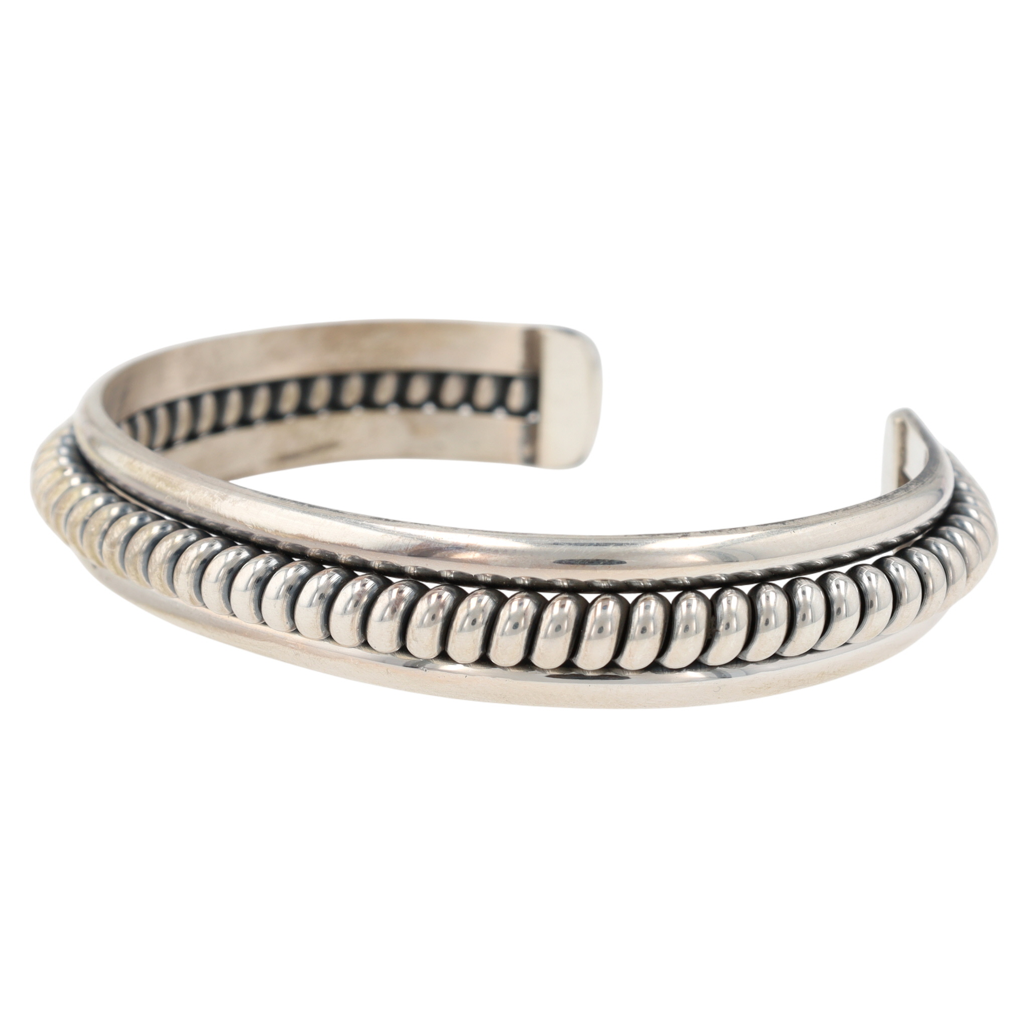 A Navajo sterling silver cuff bracelet by Caroline Tsosie, featuring a prominent central twisted rope design flanked by smooth outer bands. The interior of the bracelet is clearly marked "STERLING."