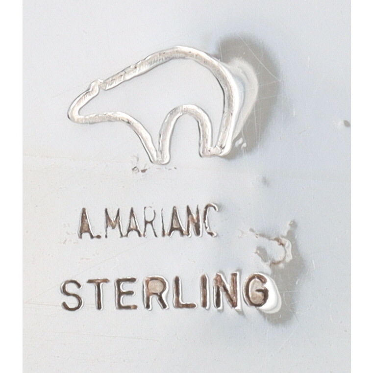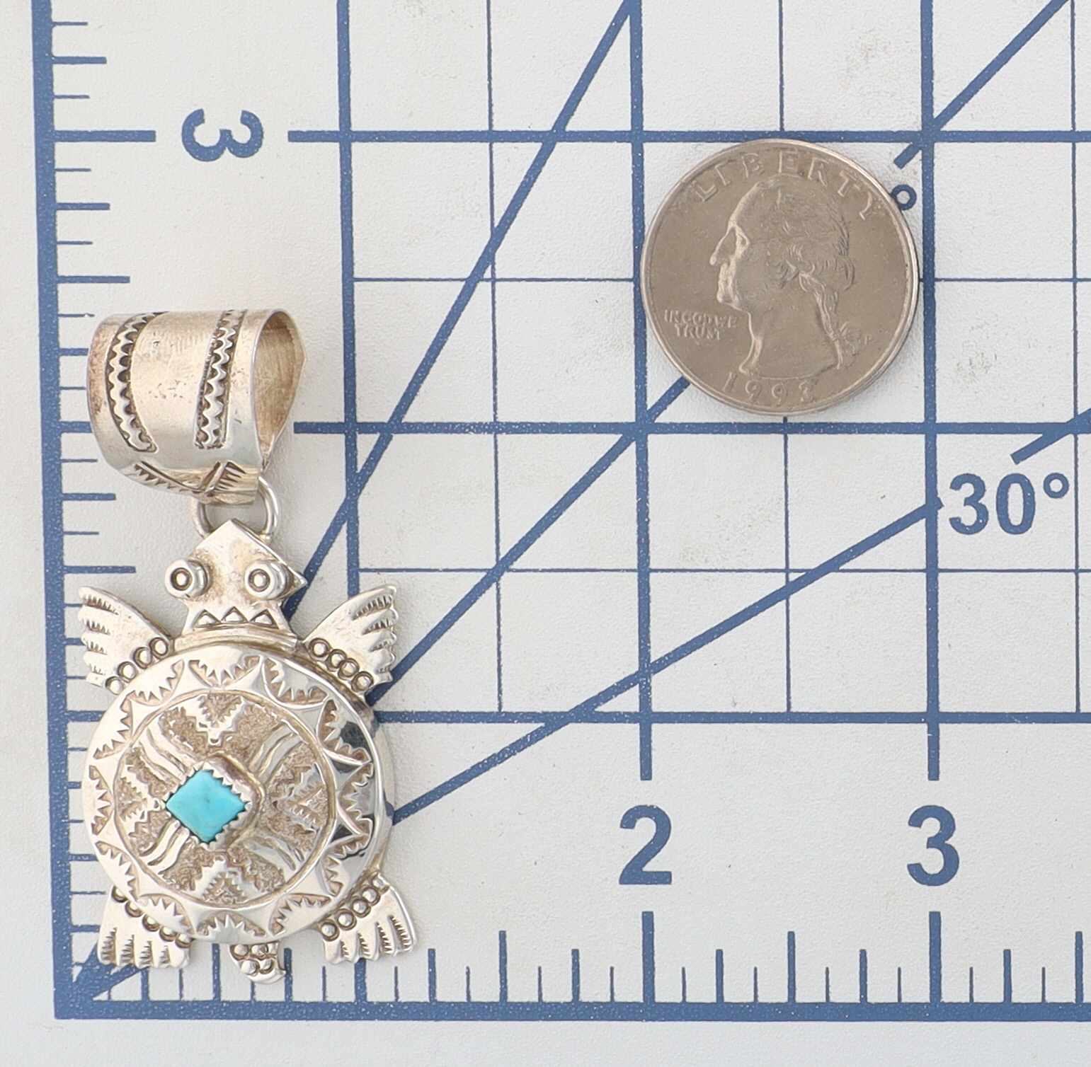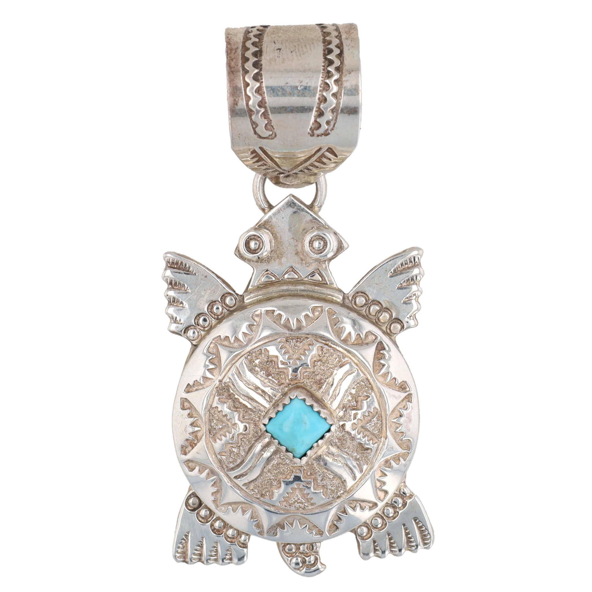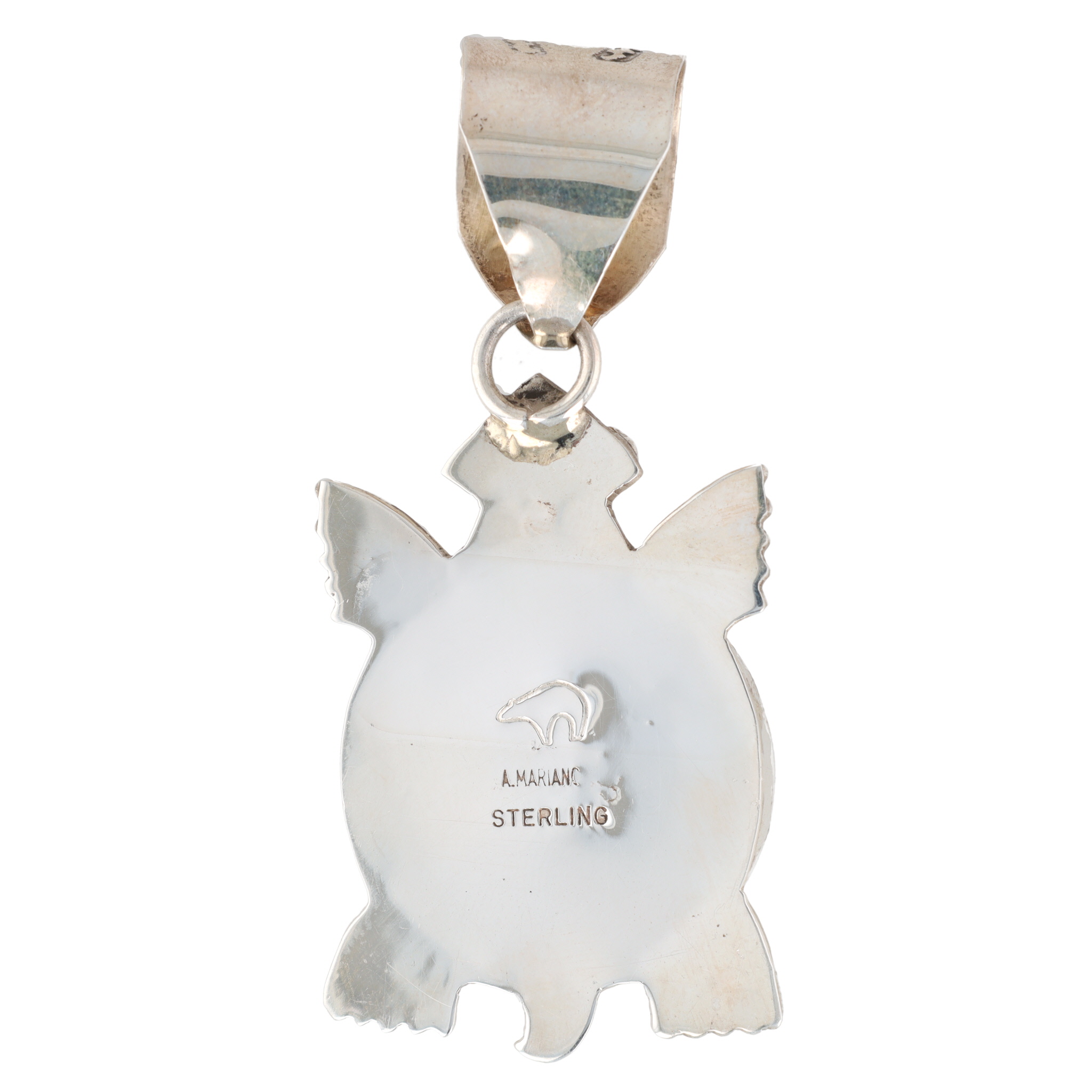A Navajo sterling silver pendant by Alonzo Mariano, crafted in the form of a stylized turtle. It features a central bezel-set, square turquoise cabochon on its domed shell, which is extensively adorned with stamped geometric and dot motifs. Additional stamped details define the turtle’s flippers and head. A large, patterned bail with an incised zigzag design is attached at the top. The reverse of the pendant is marked with a stylized bear hallmark, the inscription "A. MARIANO, " and "STERLING."