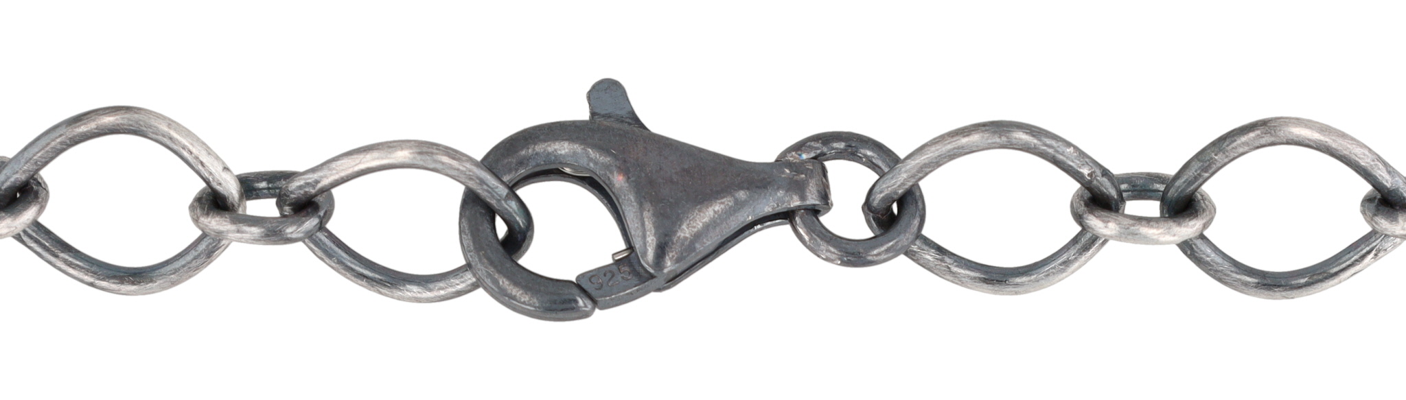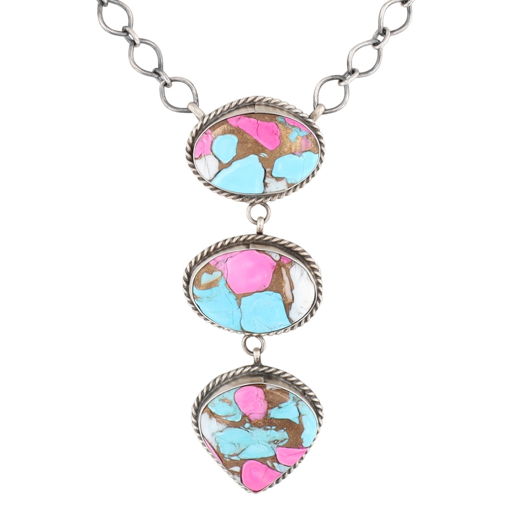 A Navajo sterling silver lariat necklace by Donovan Nez, featuring an oxidized oval-link chain terminating in a lobster clasp marked ‘925’. A graduated drop pendant suspends three bezel-set cabochon stones, oval at the top two positions and pear-shaped at the bottom, each displaying mottled patterns of bright pink, sky blue, and brown matrix, commonly referred to as ‘Cotton Candy’ stone. The reverse of the lowest setting bears a ‘DN, ‘ and a modern adhesive label on the back of the middle setting identifies the item as ‘DONOVAN NEZ NAVAJO HANDMADE COTTON CANDY NECKLACE $750’.