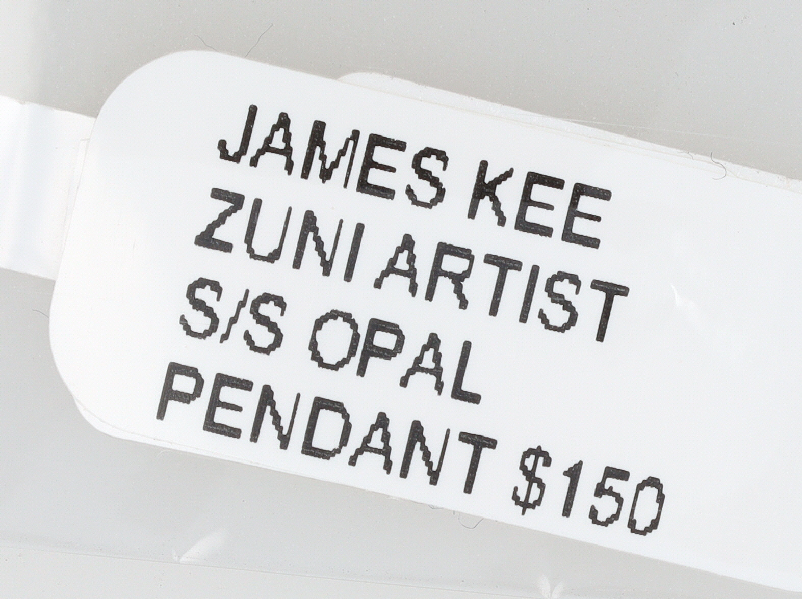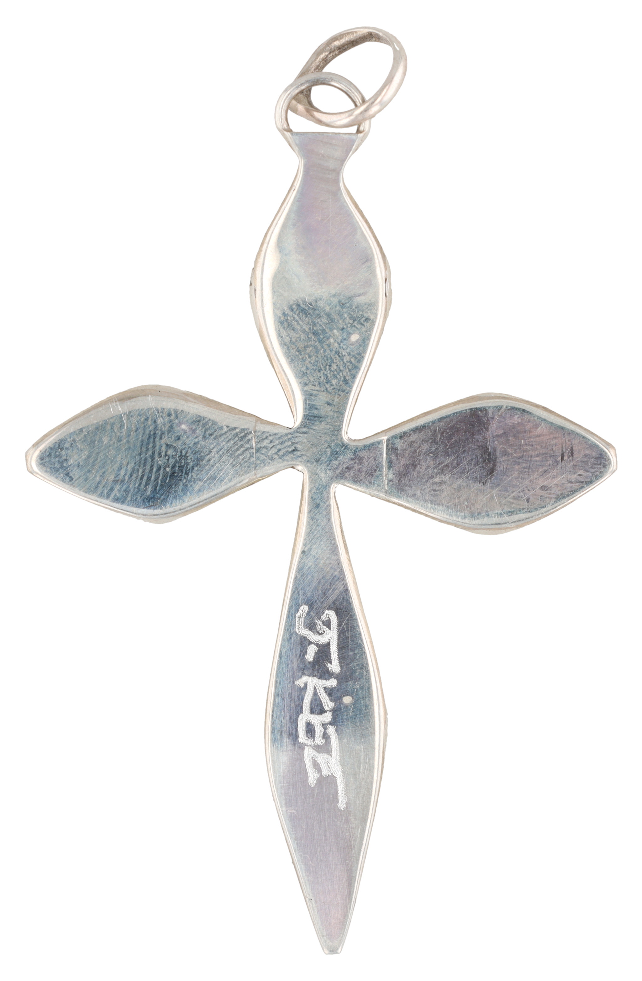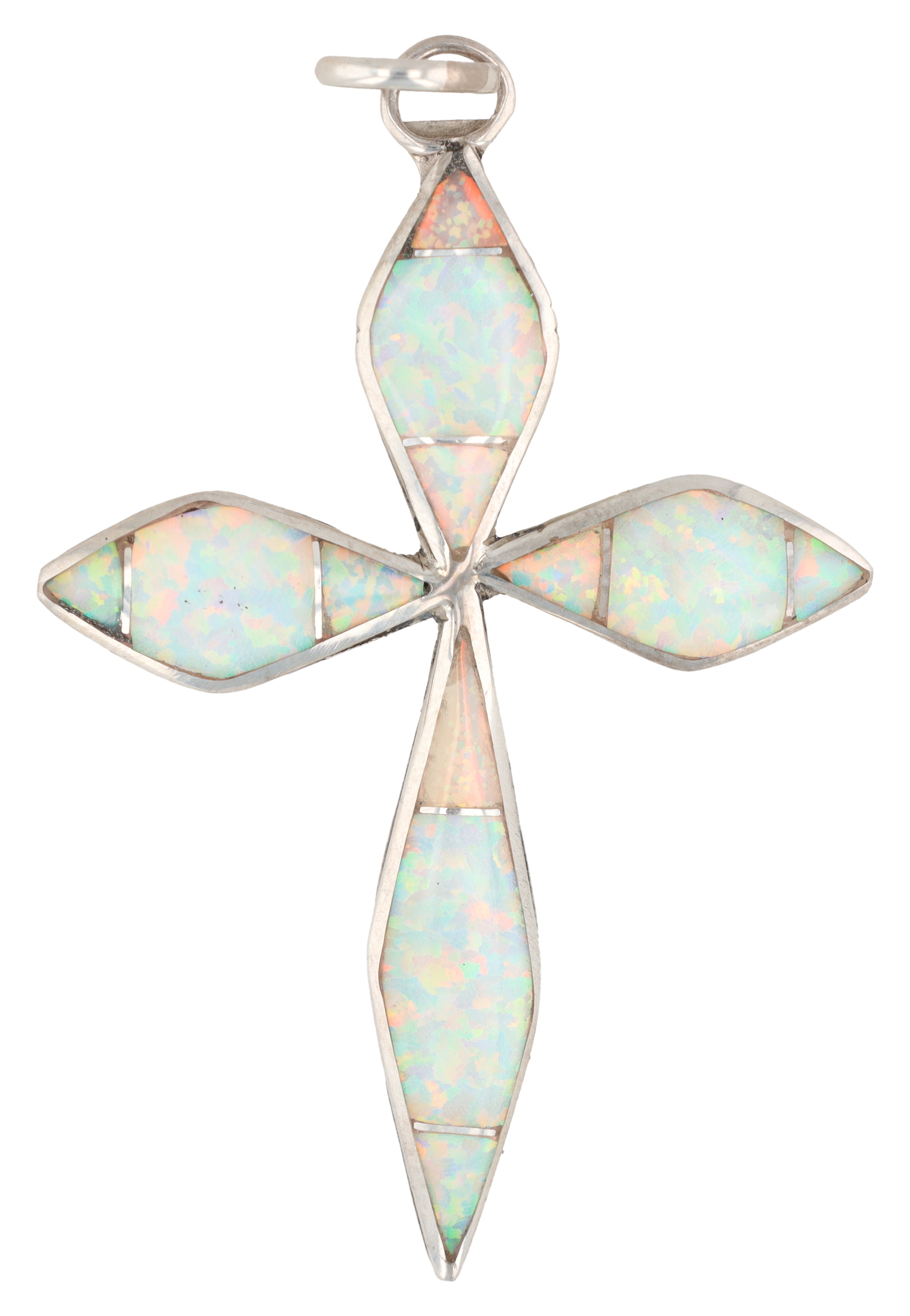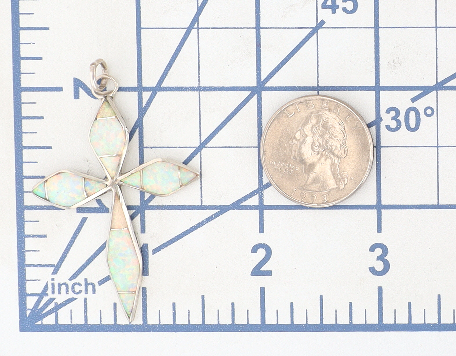 A Zuni sterling silver cross pendant by artist James Kee, featuring intricate inlay work. The cross-shaped pendant is crafted from sterling silver, with four tapering arms radiating from a central point. Each arm, the central segment, and the bail are inlaid with multiple shaped pieces of iridescent opal, displaying a milky white body color with flashes of pink, green, and blue. The reverse side bears a prominent, vertically oriented maker’s mark, consistent with the signature of James Kee.