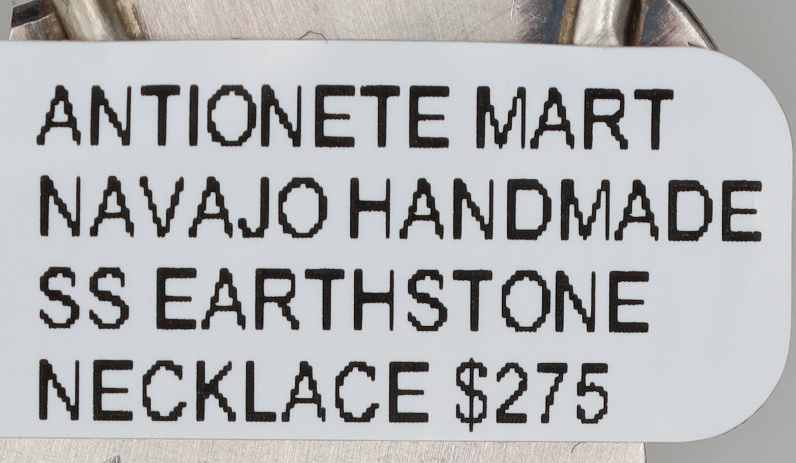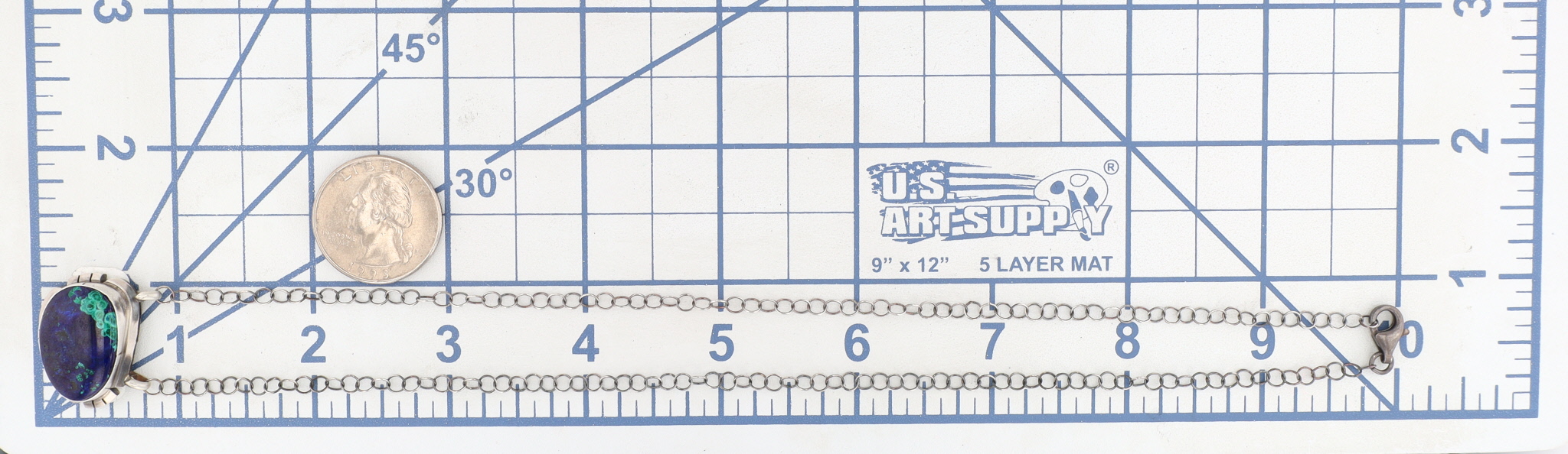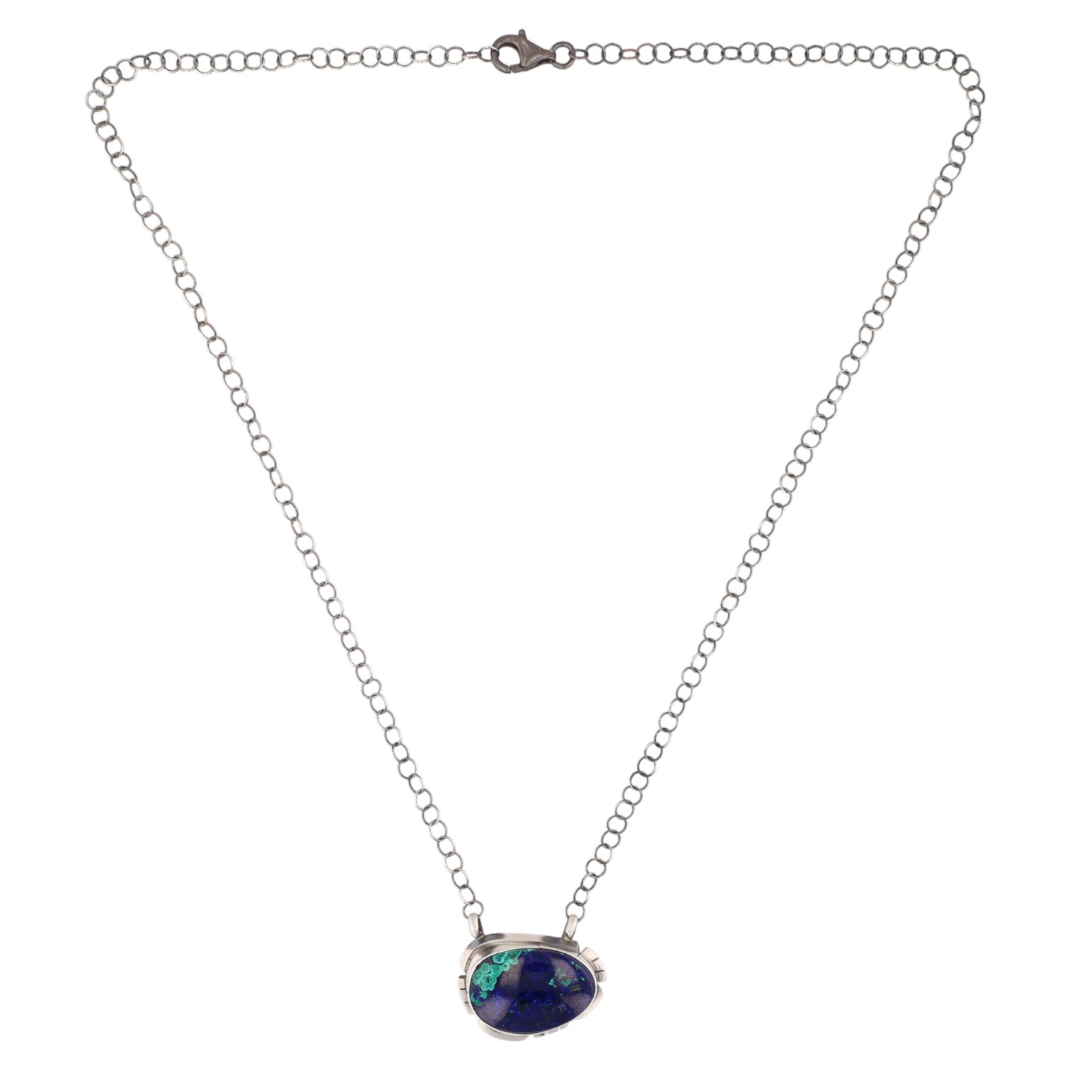 A Navajo sterling silver pendant necklace by Antionette Martinez, featuring an irregularly shaped oval cabochon stone of azurite and malachite. The stone exhibits a distinctive blend of deep blue and mottled green coloration. The stone is set within a silver-toned bezel pendant with an organic, handcrafted appearance. The reverse of the pendant is stamped with the mark "A Sterling." The pendant is suspended from a matching silver-toned rolo chain, which secures with a lobster clasp. An attached tag identifies the piece as "ANTIONETE MART NAVAJO HANDMADE SS EARTHSTONE NECKLACE."
