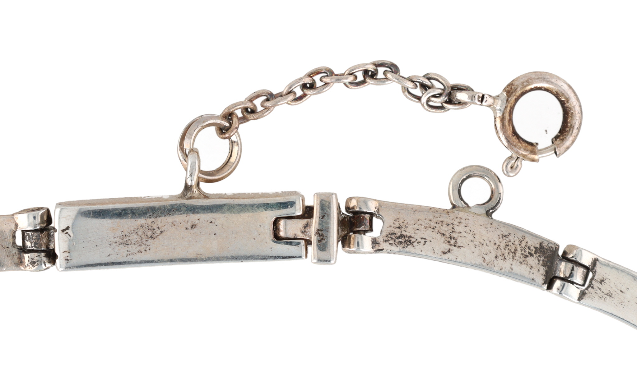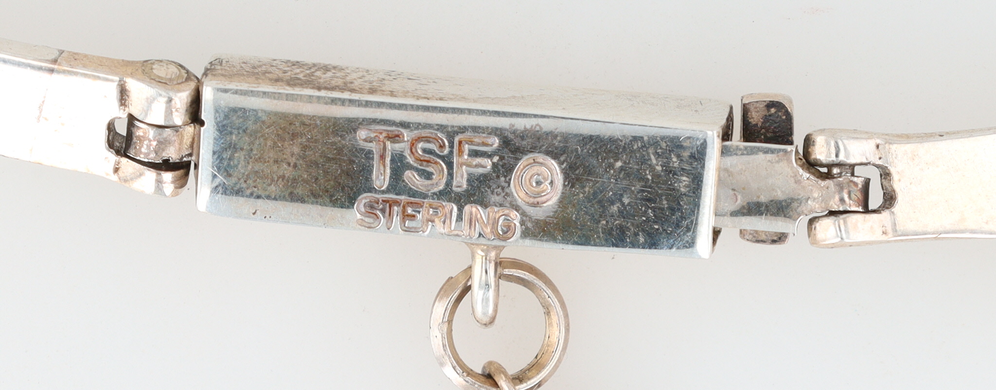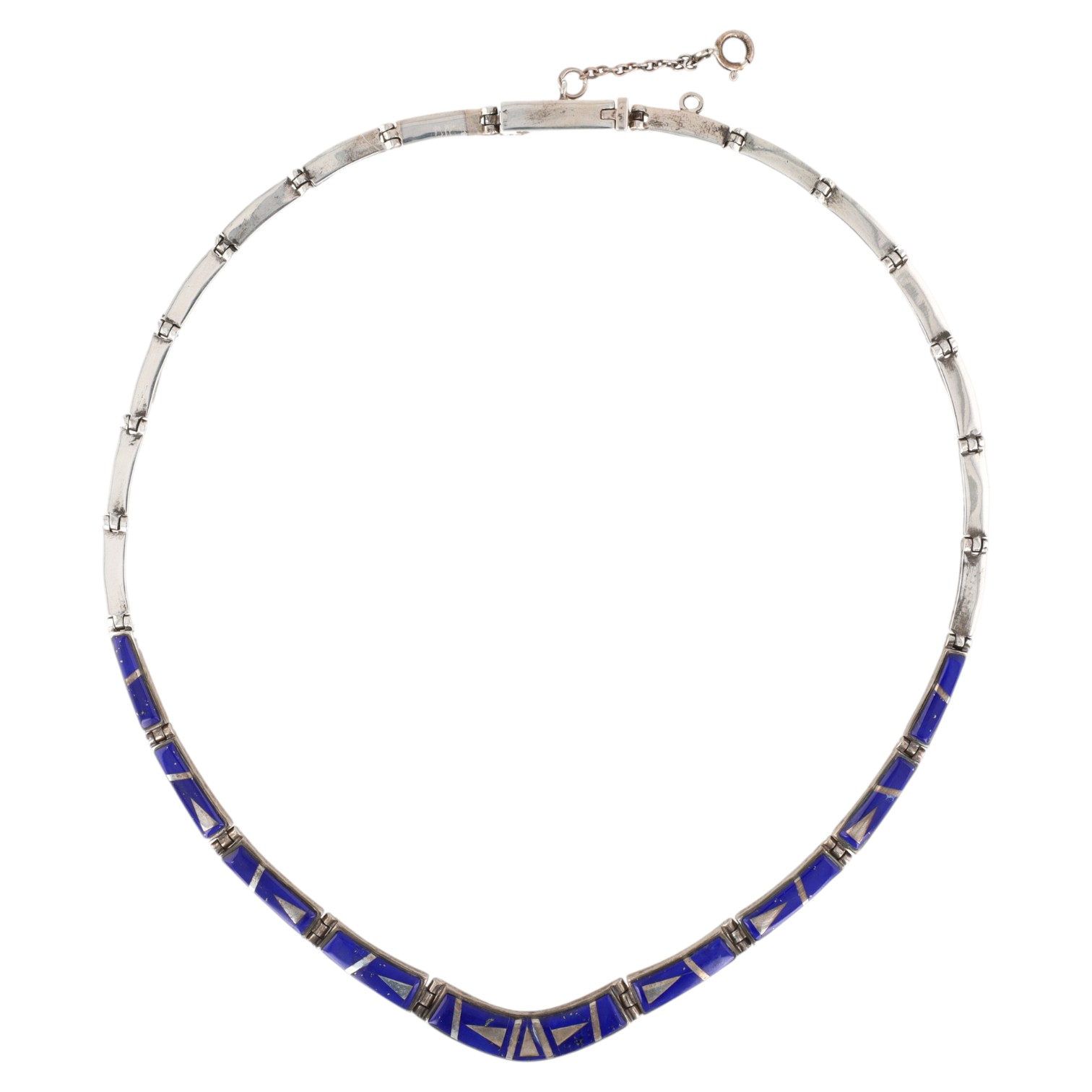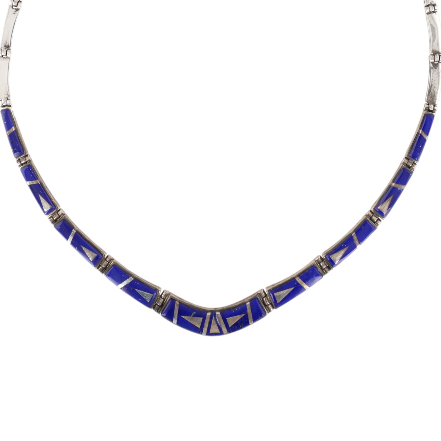 This articulated sterling silver necklace by Navajo artist Tully Gustine, features a geometric Modernist style design, forming a collar or choker. The front section is adorned with vibrant blue stone inlay, consistent with lapis lazuli, precisely cut into trapezoidal and triangular shapes that form a central V-motif, transitioning to simpler rectangular links along the back. The clasp is marked "TSF" for Touch of Santa Fe with a copyright symbol and "STERLING", while the reverse of the central V-section bears the etched signature "T. Gustine".