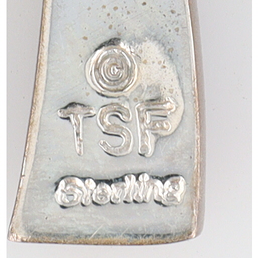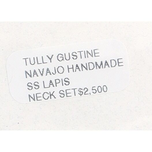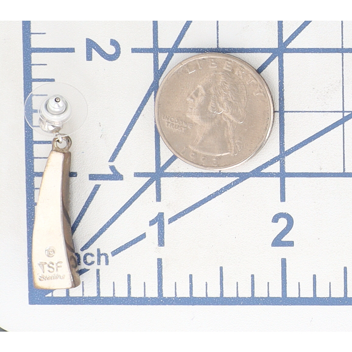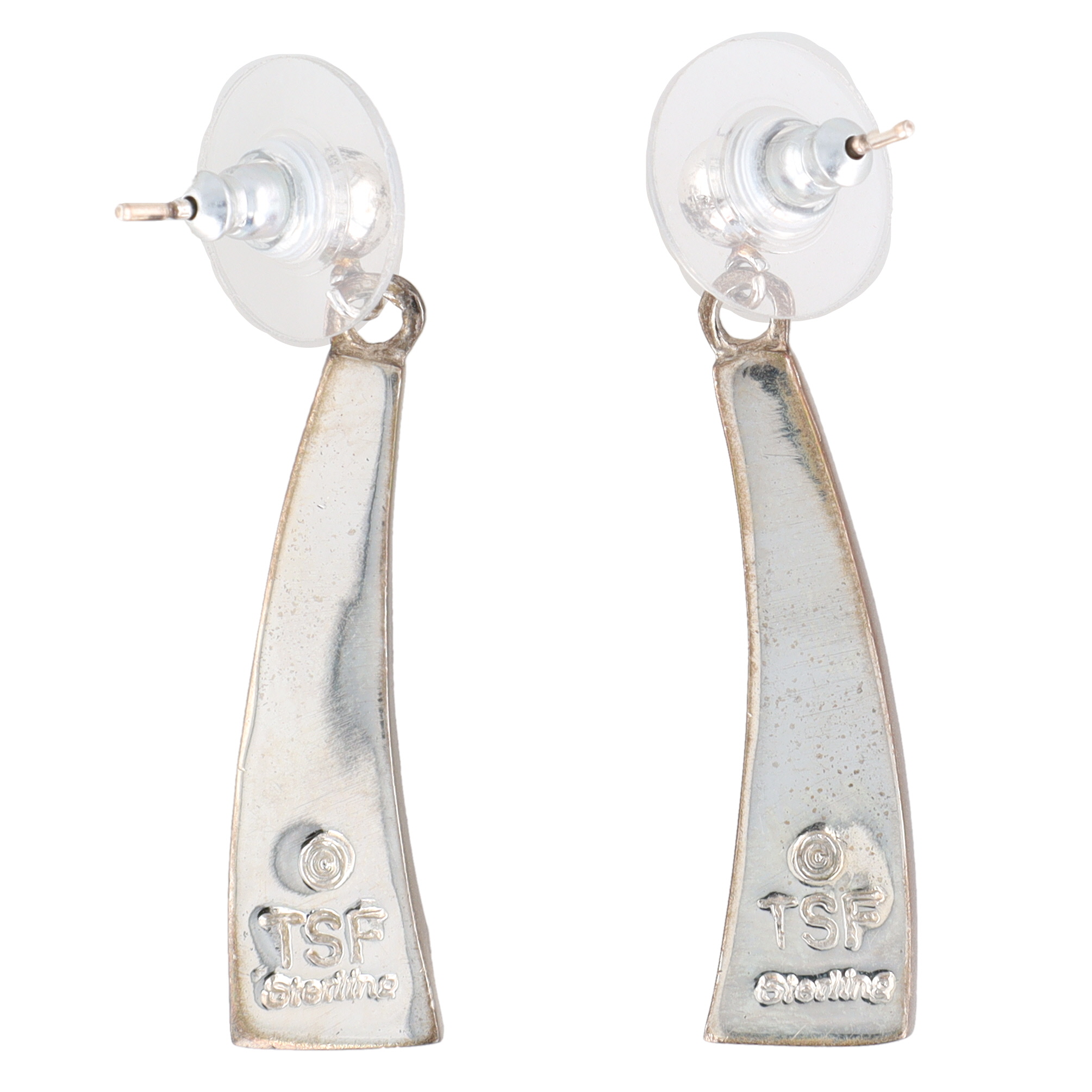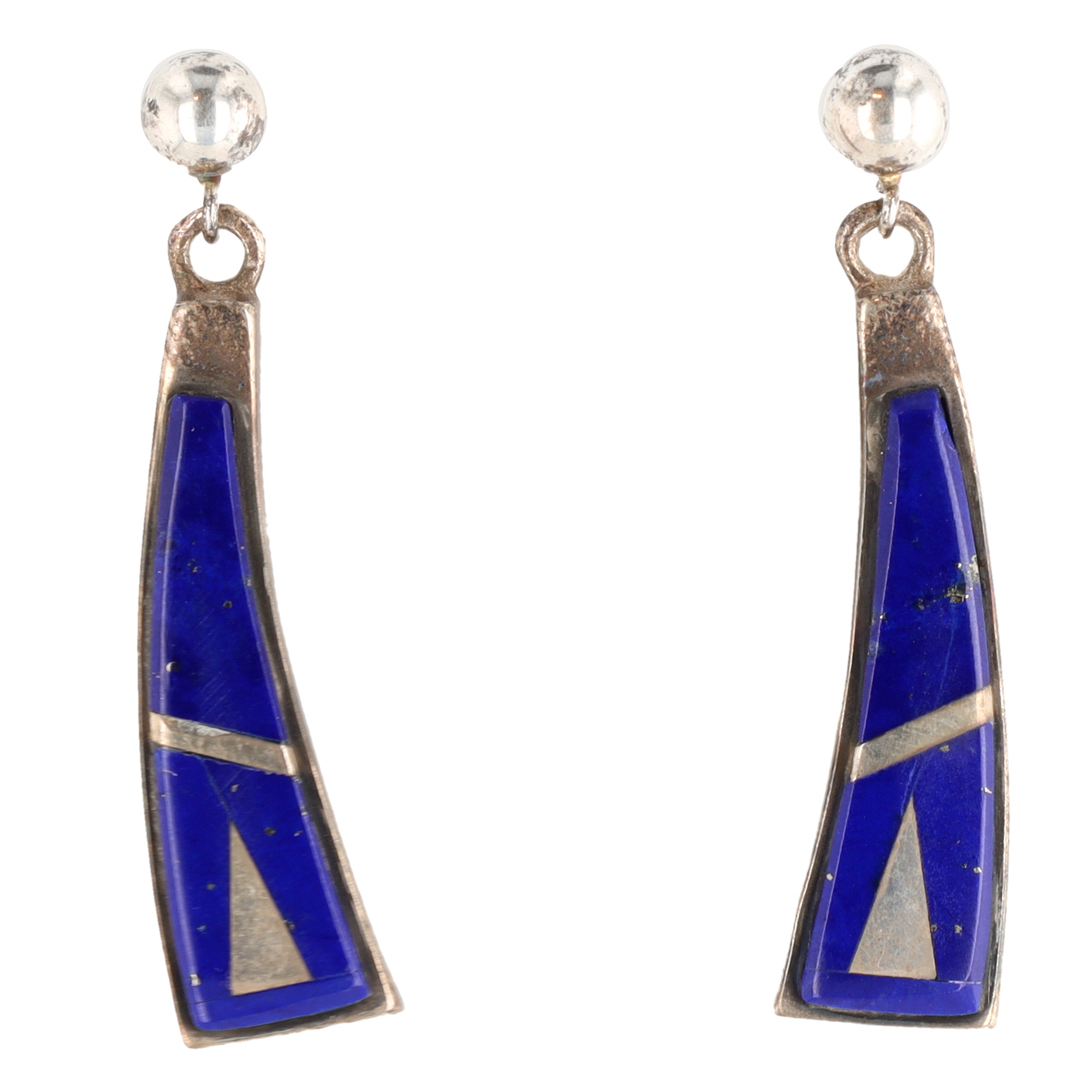 A pair of Navajo sterling silver and lapis lazuli inlay dangle earrings by Tully Gustine. Each earring features a sterling silver ball stud from which a tapering, slightly curved dangle is suspended. The dangles are crafted from sterling silver, with a geometric inlay design composed of deep blue stone, identified as lapis lazuli due to its color and visible flecks, interspersed with triangular and linear sections of polished sterling silver. The reverse of each dangle is marked "TSF" for Touch of Stanta Fe above "Sterling" .