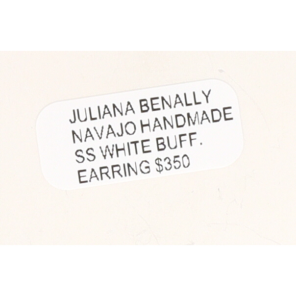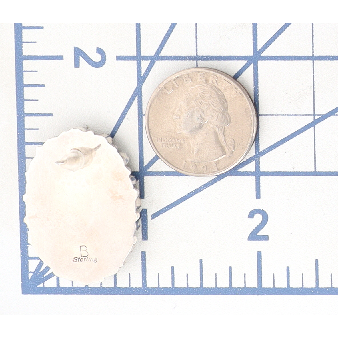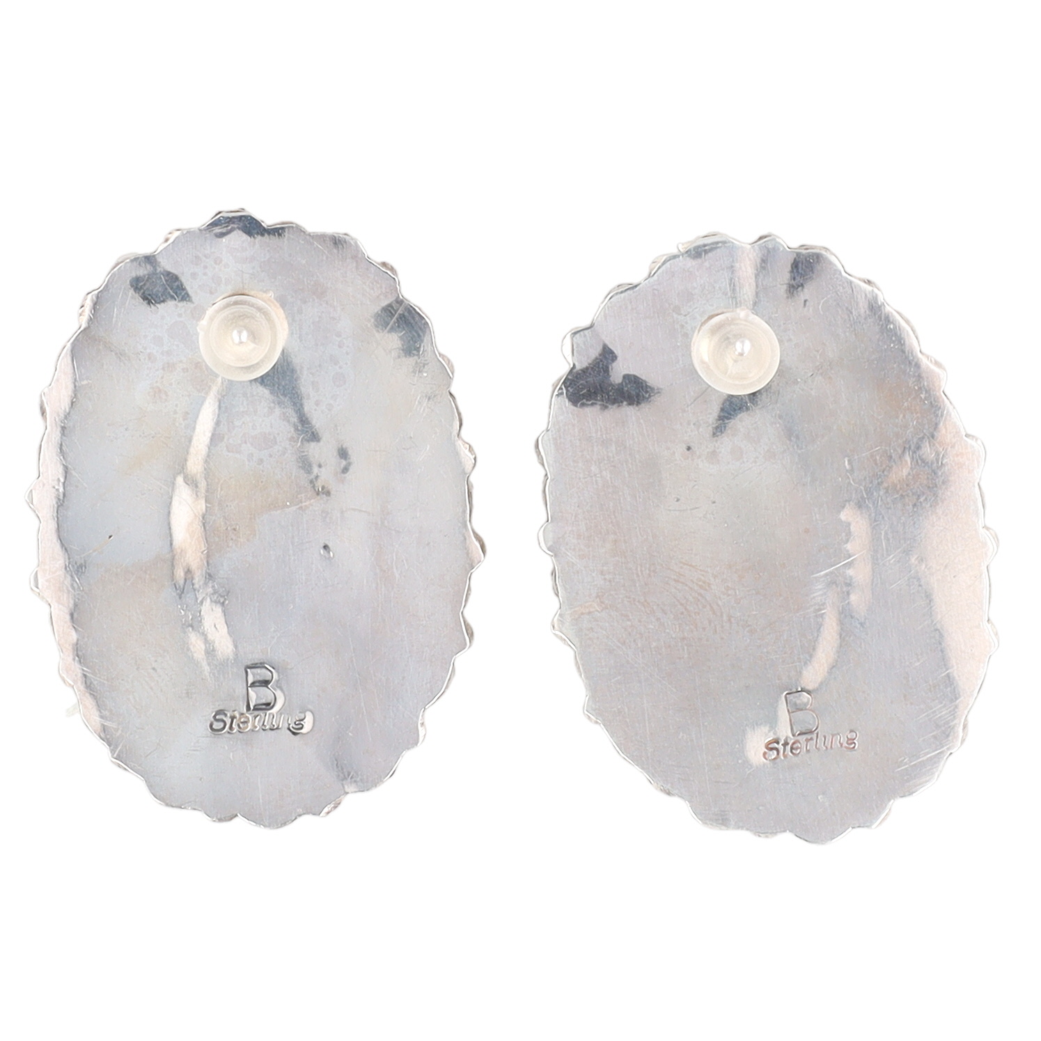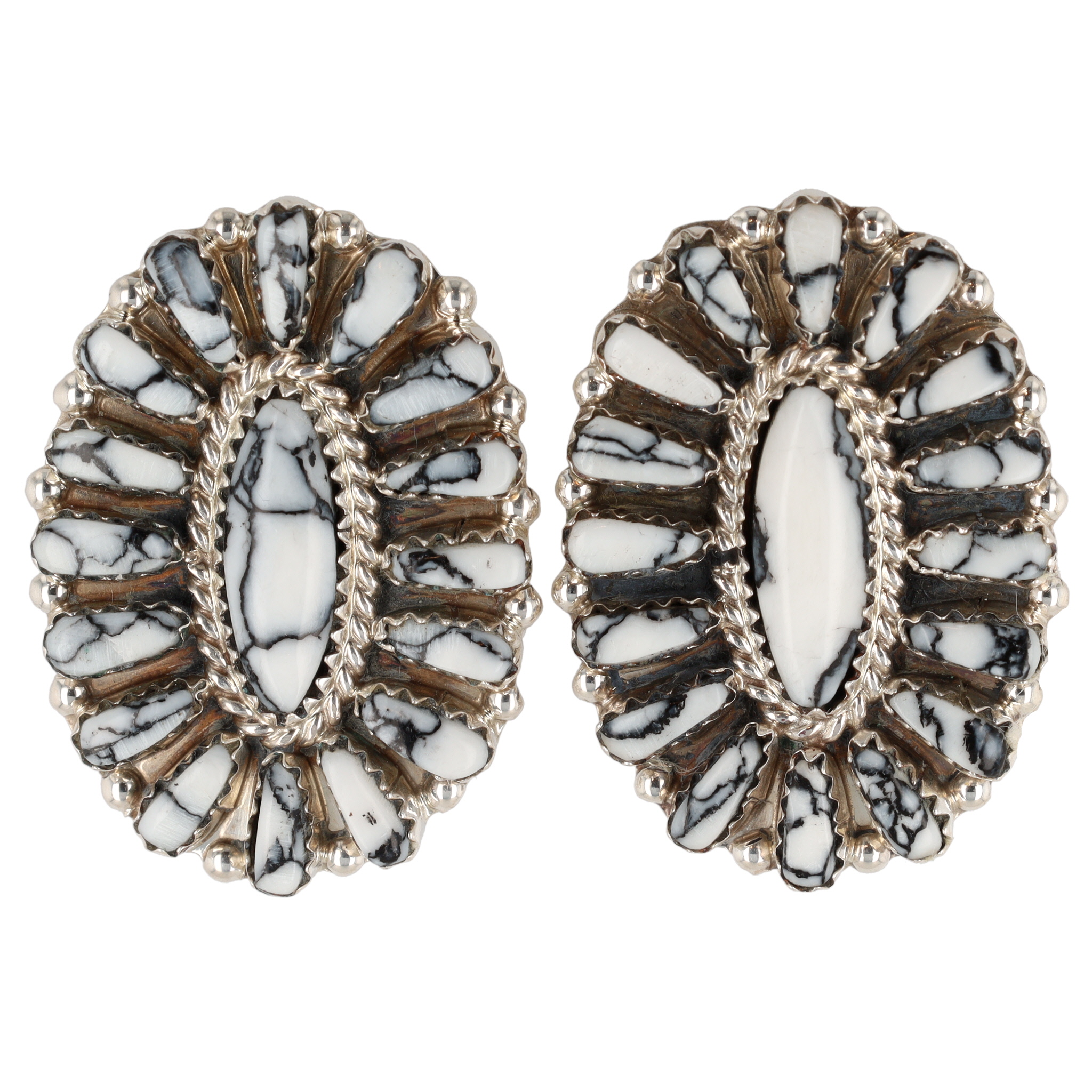 A pair of Navajo Sterling Silver and White Buffalo Turquoise cluster earrings by Juliana Benally. Each oval-shaped earring is centered with a larger, elongated cabochon White Buffalo Turquoise stone surrounded by numerous smaller, irregular-shaped stones. All stones exhibit a distinctive white color with prominent black matrixing. They are set in polished sterling silver, featuring scalloped bezels, a twisted wire border around the central stone, and a twisted rope detail along the outer edge. The reverse of each earring is marked with a capital "B" above the word "Sterling" and is fitted with a sterling silver post for pierced ears, accompanied by clear plastic push-backs.