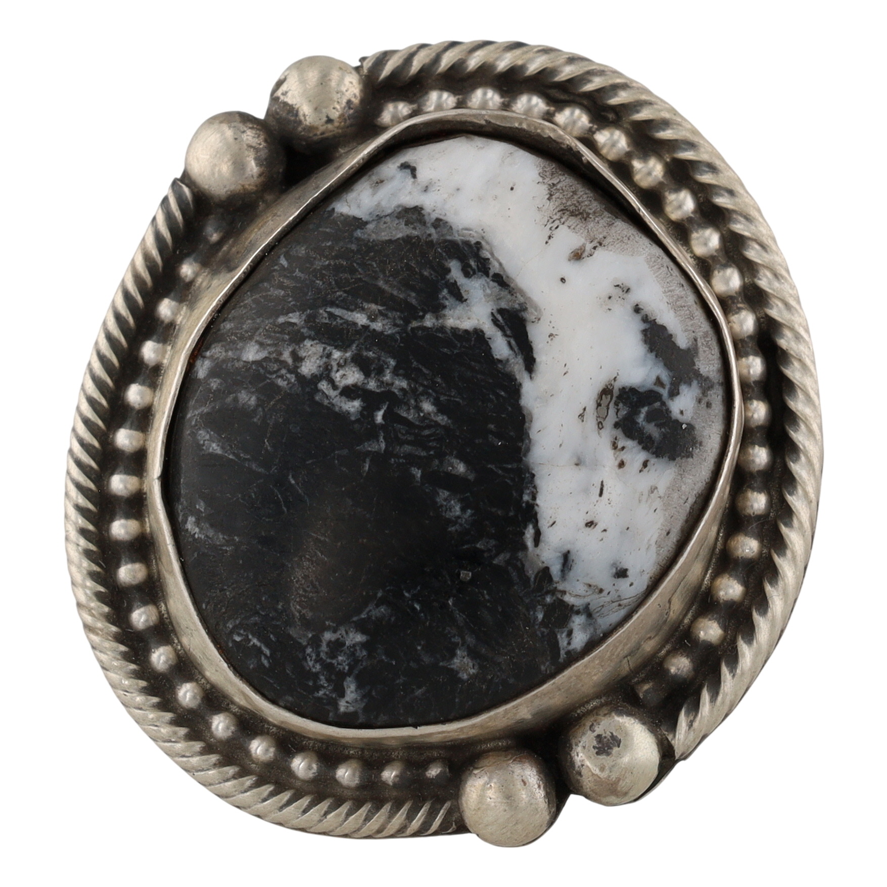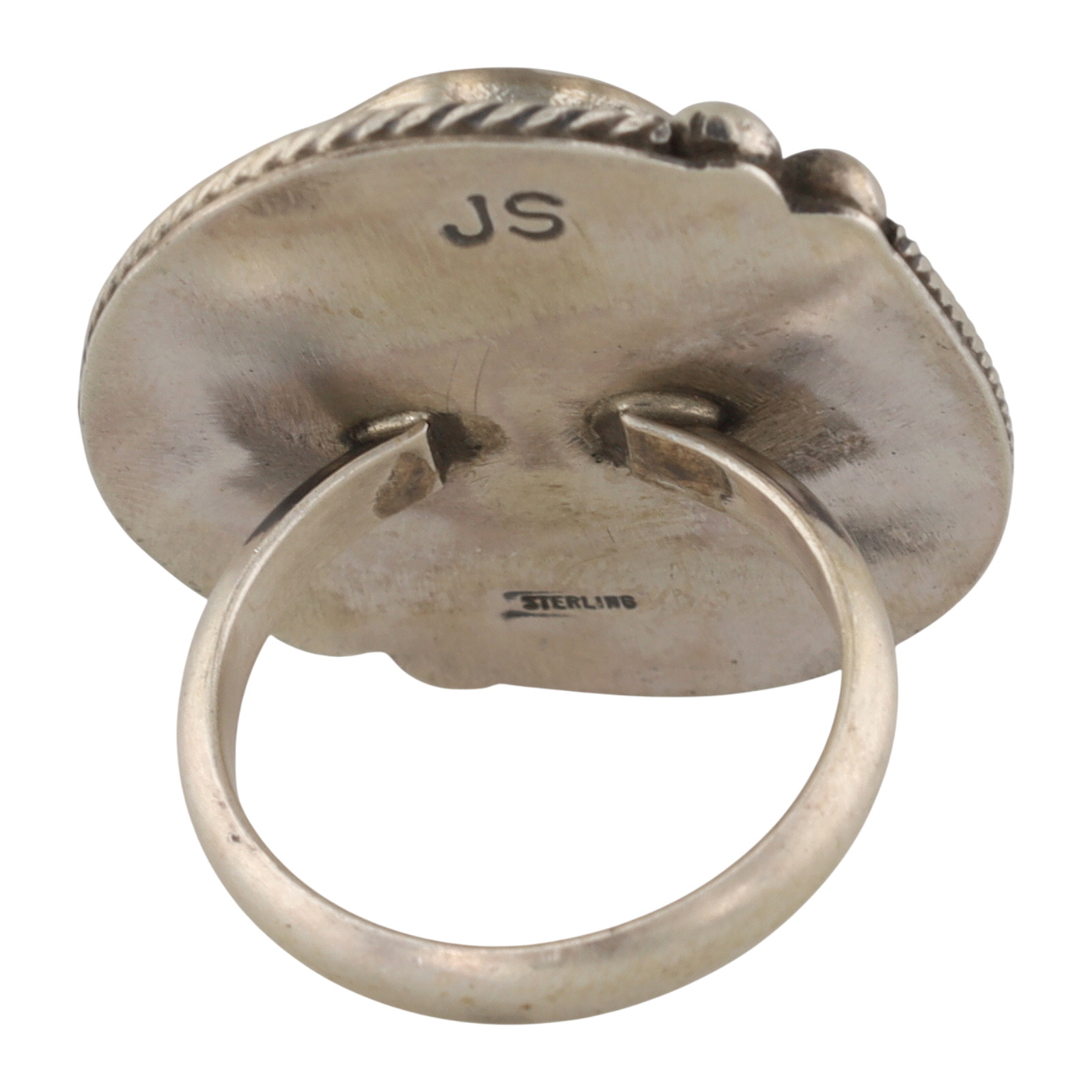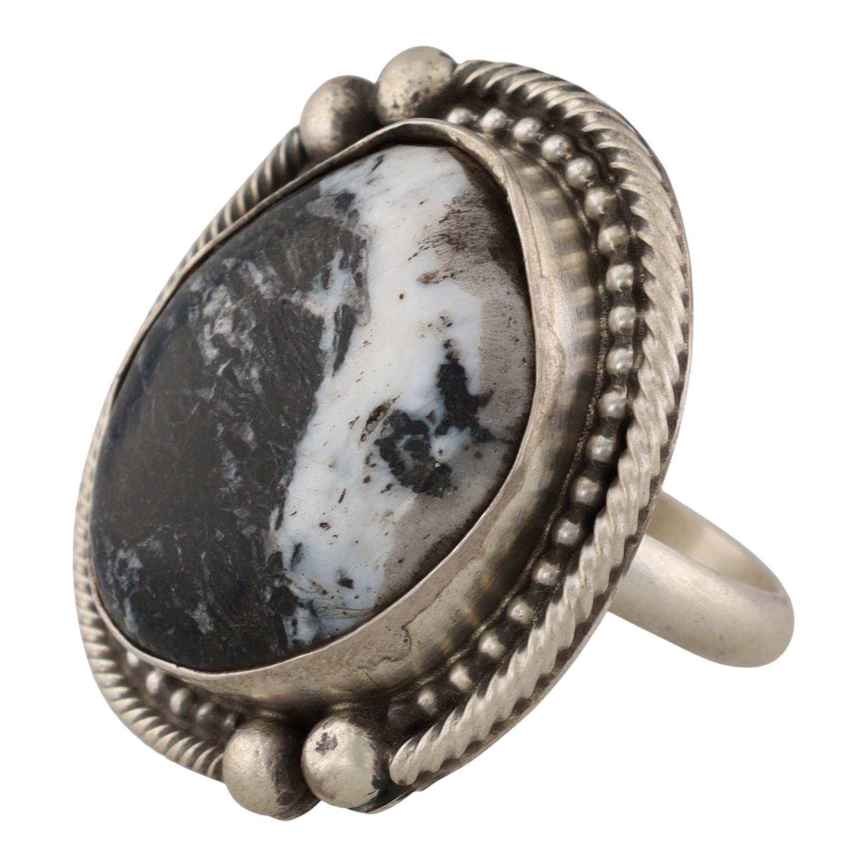 A Navajo sterling silver ring by John Skeets, featuring a prominent, oval, cabochon-cut white buffalo turquoise gemstone with a distinct black and white marbled pattern, securely set within a plain bezel. The bezel is further adorned with a twisted rope-like border and four applied spherical silver beads. The reverse of the ring’s head is stamped with the initials ‘JS’ and the word ‘STERLING’.