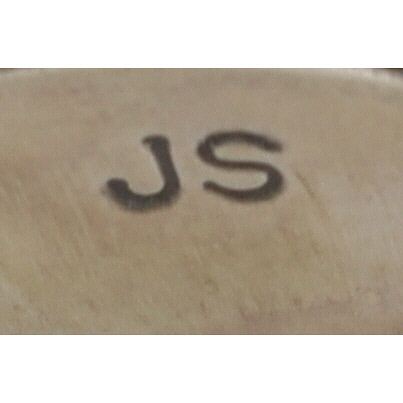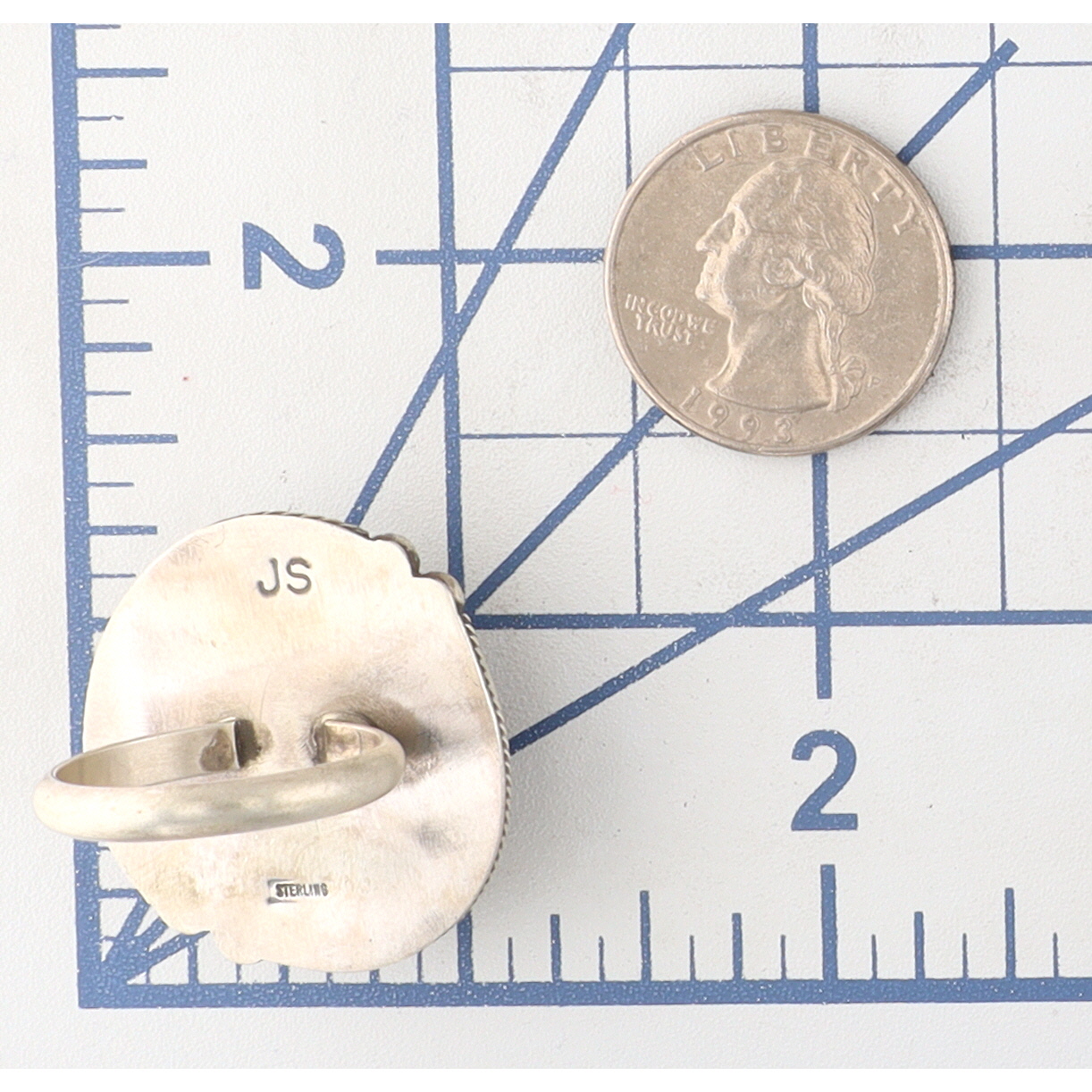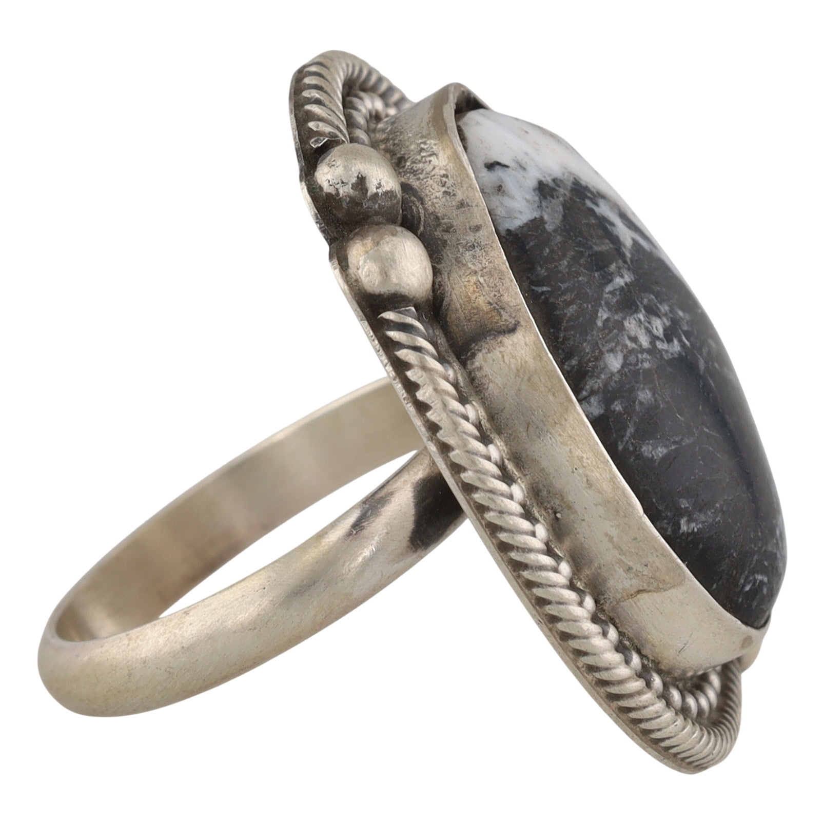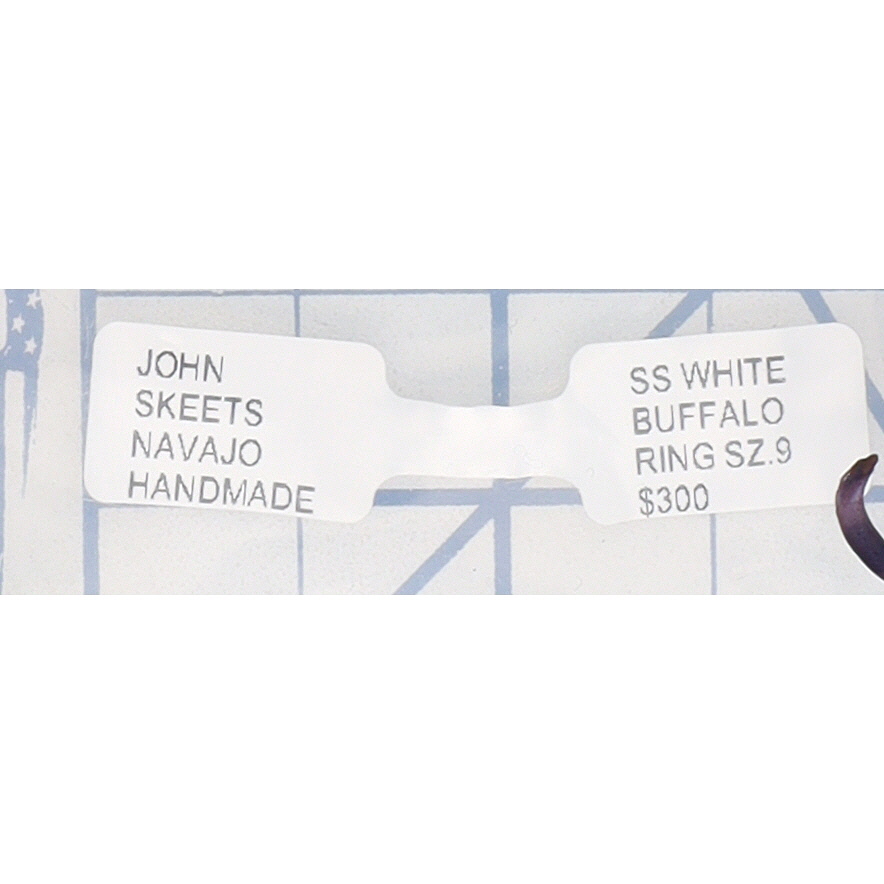 A Navajo sterling silver ring by John Skeets, featuring a prominent, oval, cabochon-cut white buffalo turquoise gemstone with a distinct black and white marbled pattern, securely set within a plain bezel. The bezel is further adorned with a twisted rope-like border and four applied spherical silver beads. The reverse of the ring’s head is stamped with the initials ‘JS’ and the word ‘STERLING’.