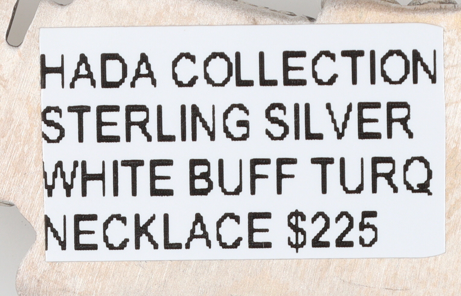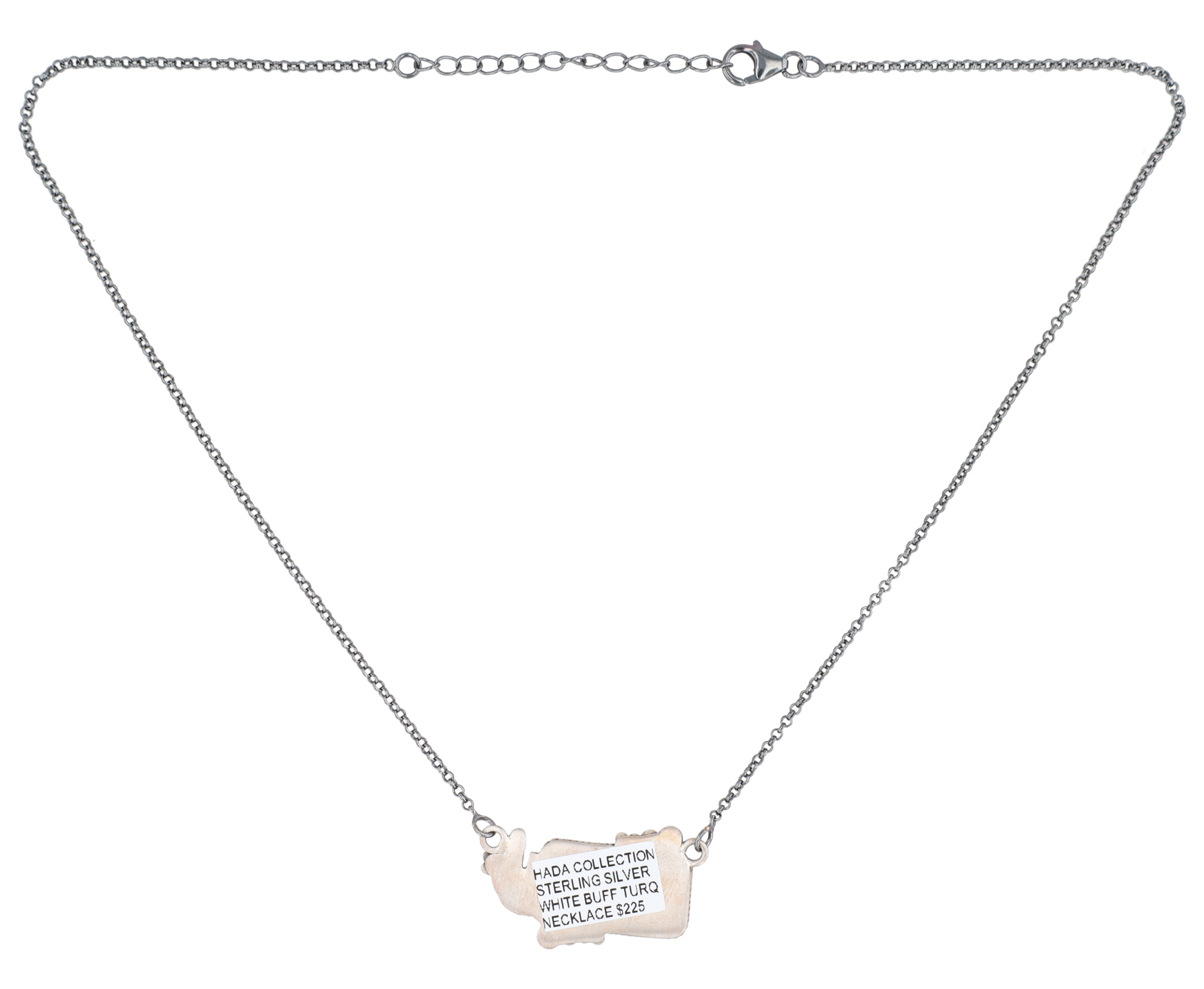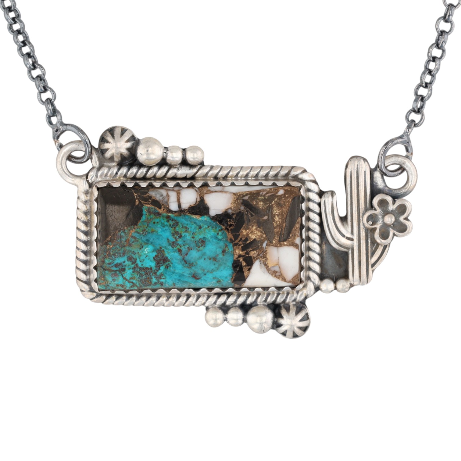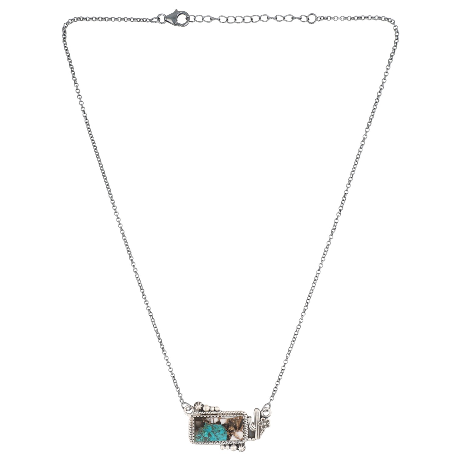 A Hada Collection sterling silver necklace featuring a rectangular pendant set with a composite stone, prominently displaying turquoise, white, brown, and black minerals within a rope-twist bezel. The pendant is designed with a saguaro cactus and a floral motif on one side, complemented by small beaded and star-like silver accents. The accompanying oxidized oval link chain secures with a lobster clasp stamped "925." The reverse of the pendant bears "Sterling" and a script "HaDa" mark.