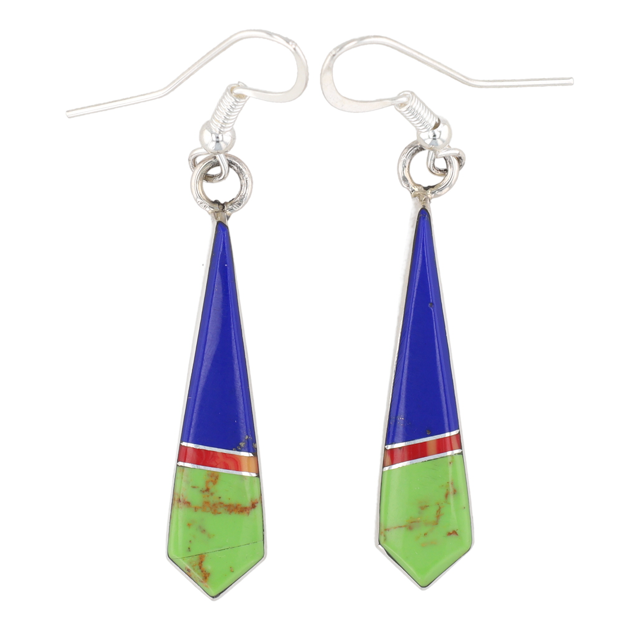 A pair of Navajo multi-stone inlay sterling silver dangle earrings by Mary Yazzie, featuring tapering, multi-faceted geometric drops. Each earring is inlaid with three distinct sections of polished stone: a prominent upper section of lapis, coral, and gaspeite. The reverse of one earring is clearly stamped "Z sterling" consistent with Mary Yazzie’s hallmark.