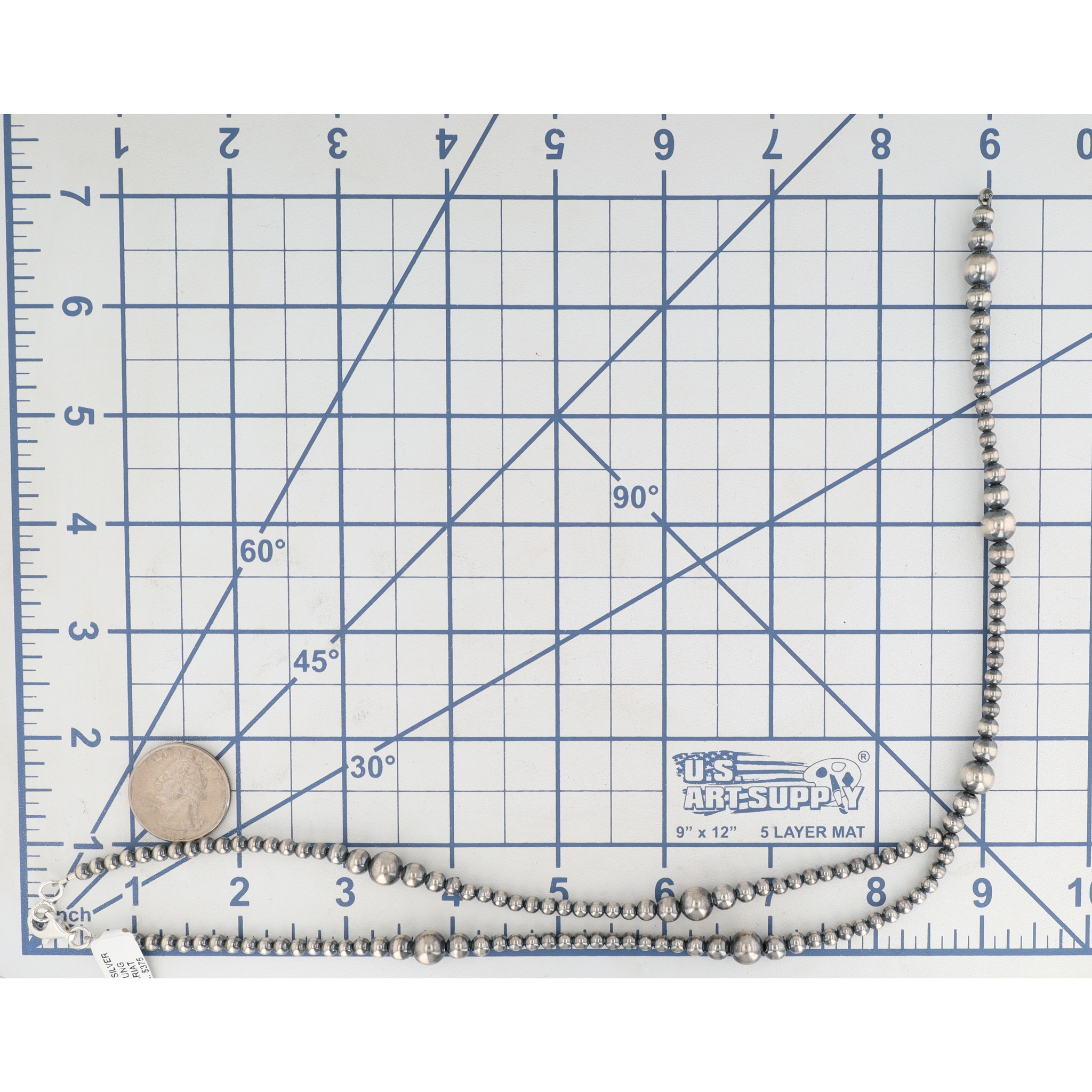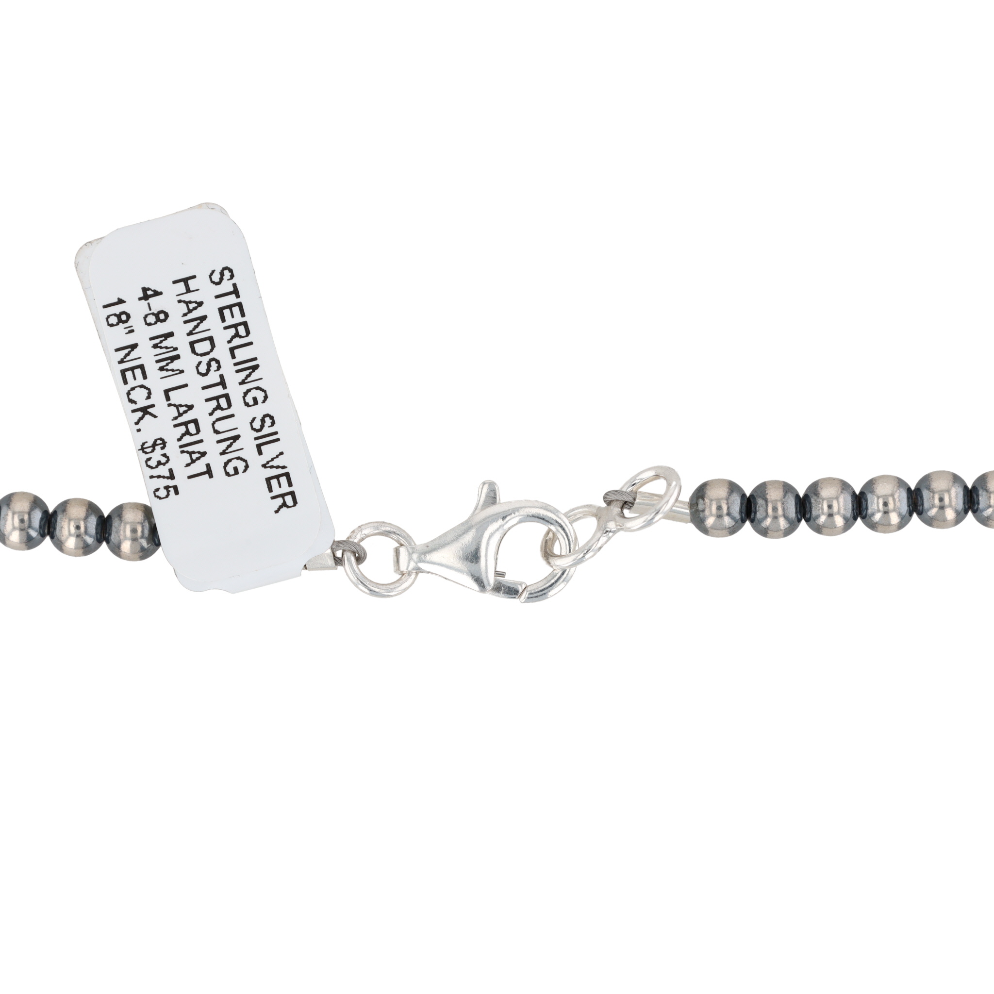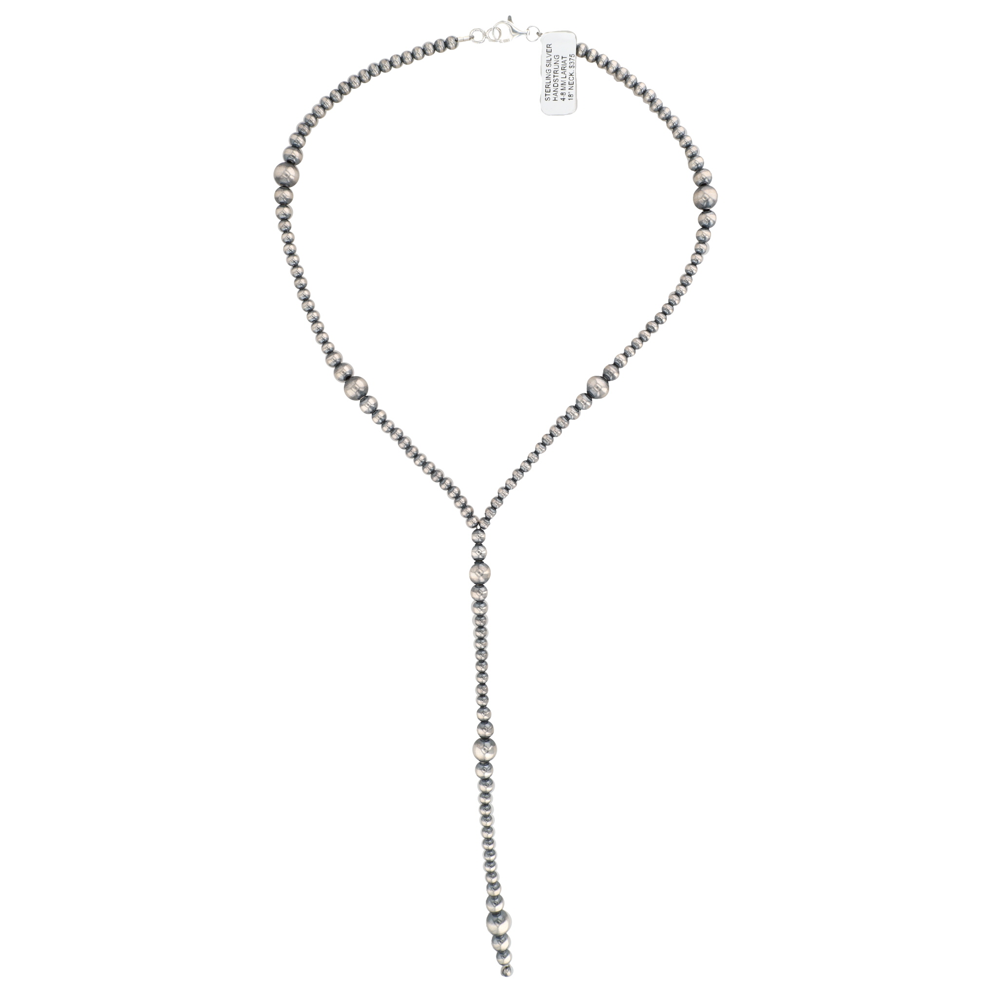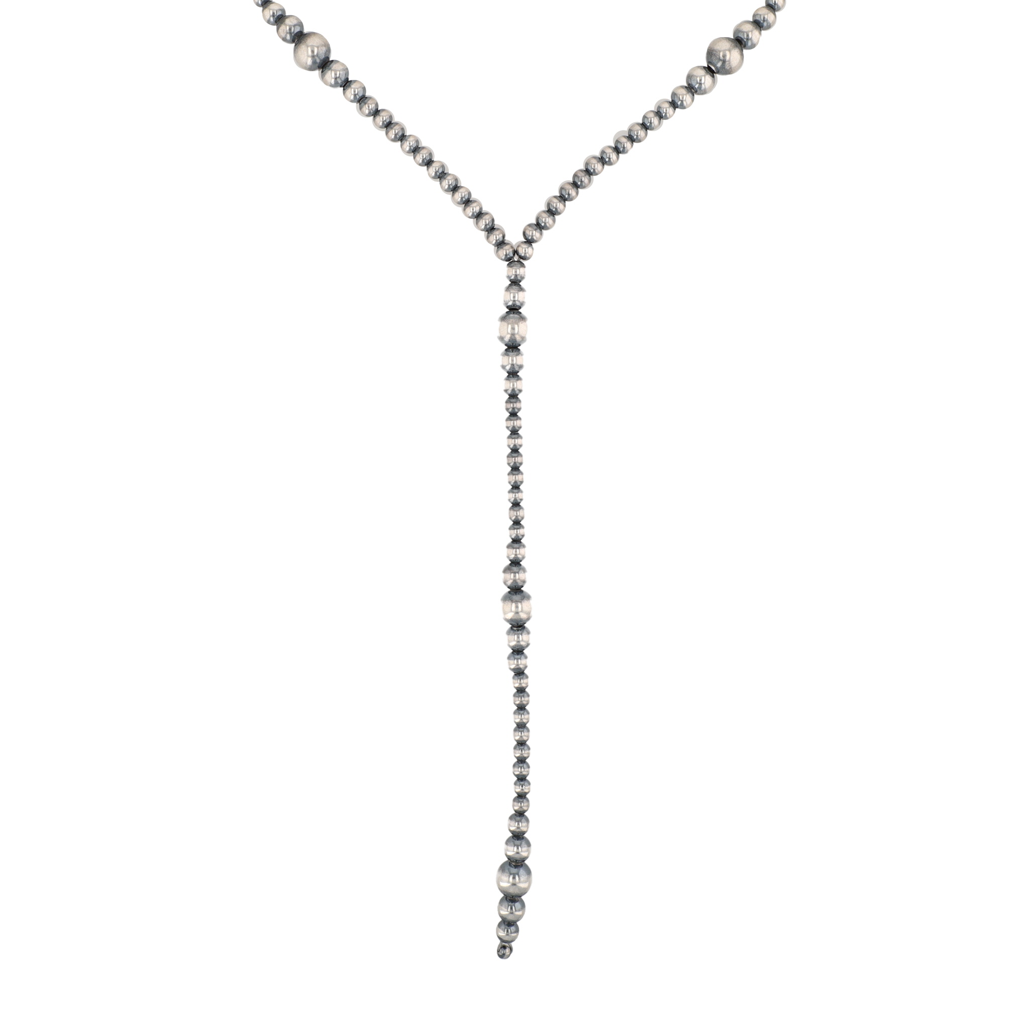 A Navajo sterling silver beaded lariat necklace, handstrung, featuring a graduated design of spherical beads ranging from approximately 4mm to 8mm in diameter, forming a Y-drop configuration. It secures with a lobster clasp.