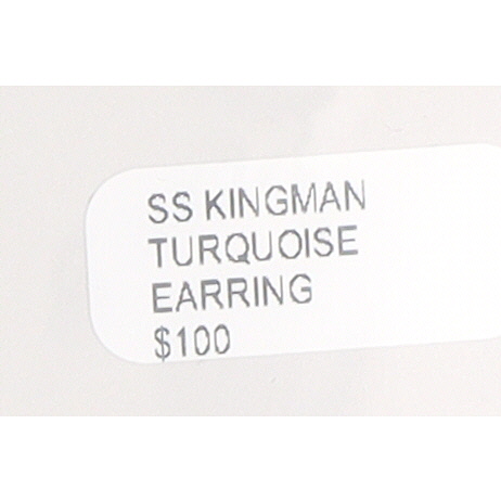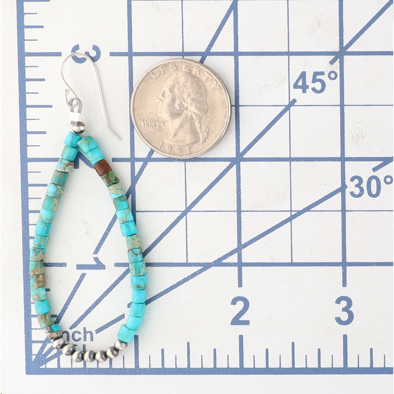 A pair of Navajo Sterling Silver Kingman turquoise teardrop dangle earrings. Each earring features a teardrop-shaped dangle composed of numerous small, irregular square-cut beads of blue-green turquoise, exhibiting natural brown matrixing. The dangle is strung with small spherical silver-toned beads, commonly referred to as Navajo Pearls, at its base. Each earring is suspended from a silver-toned French hook earwire. An accompanying label identifies the material as Kingman turquoise and Sterling Silver.
