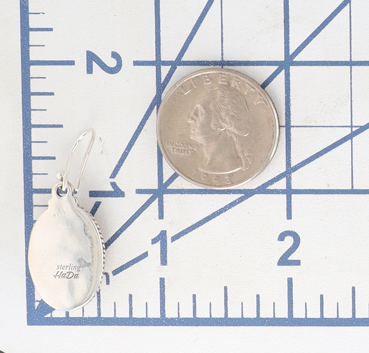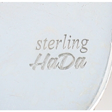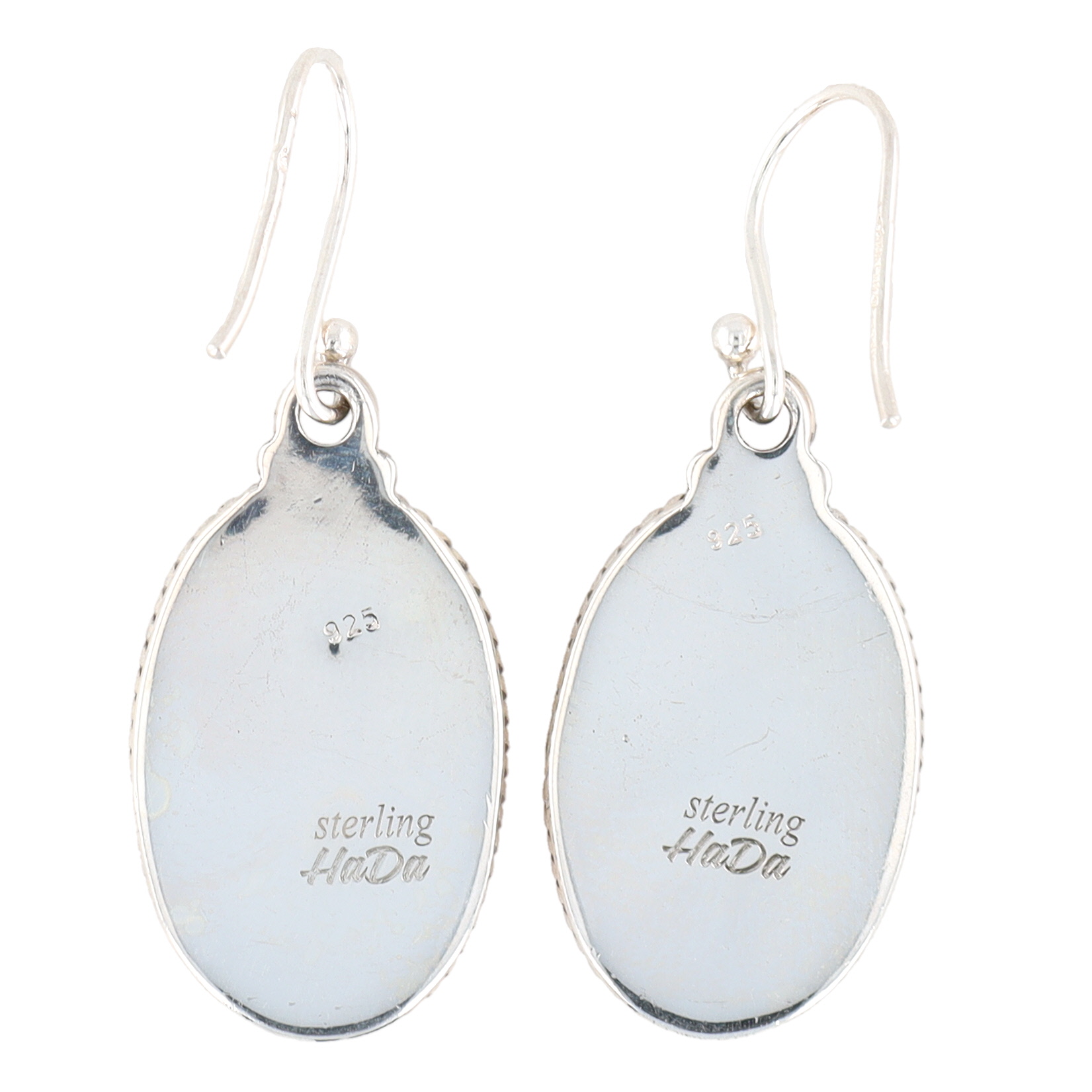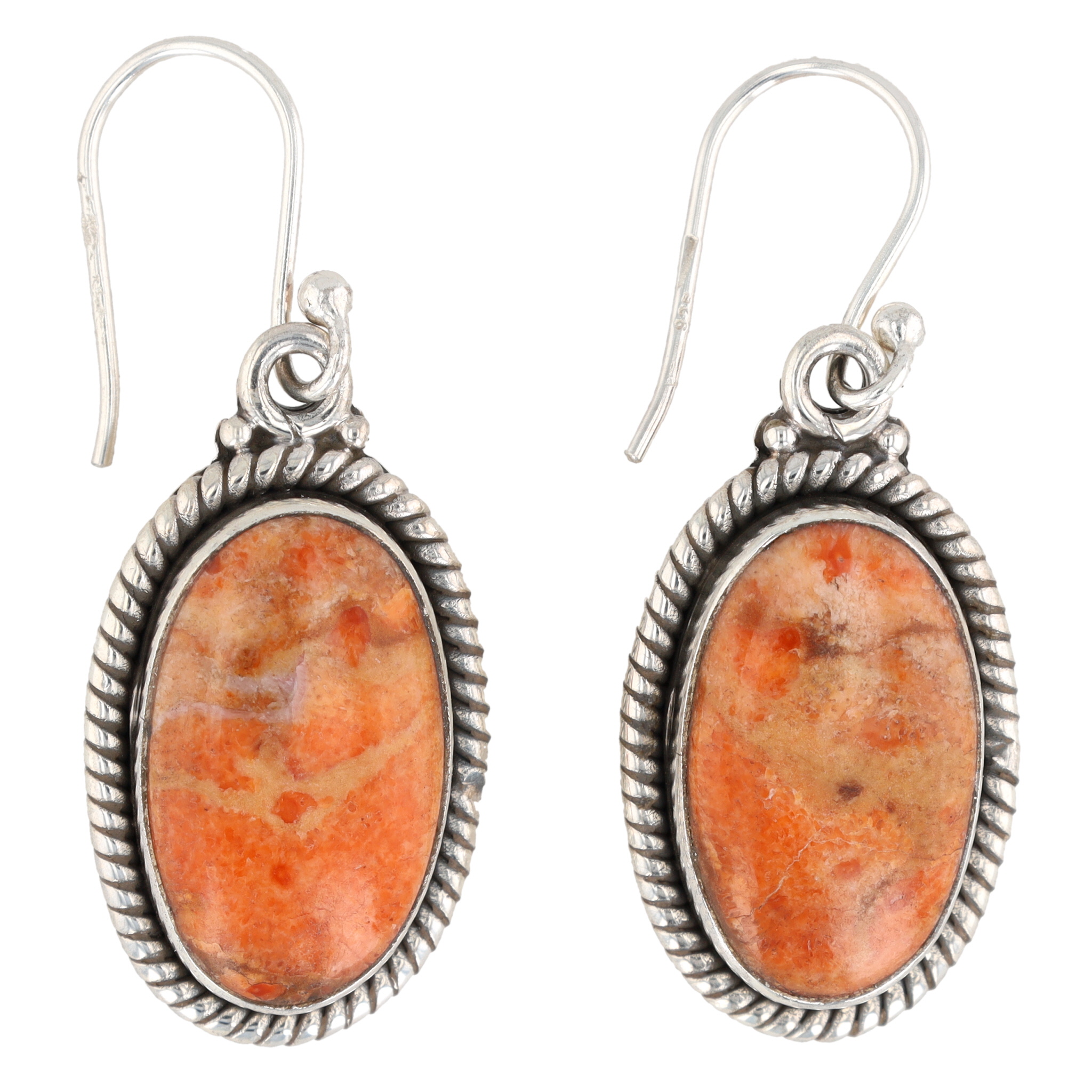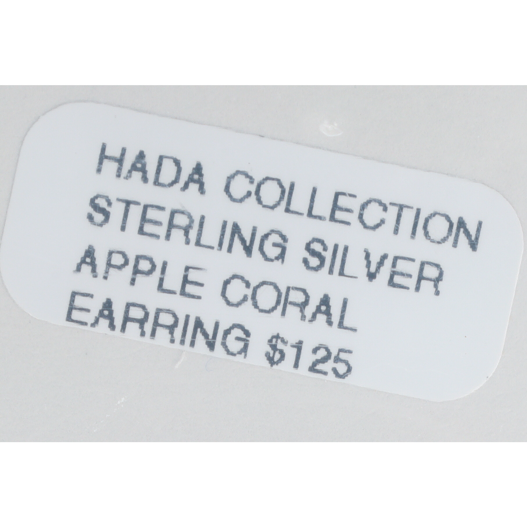 A pair of HaDa Collection sterling silver and apple coral drop earrings. Each earring features an oval, domed cabochon stone of mottled orange hue, bezel-set within a silver-toned metal frame. The frame is accented with a rope-twist border, and a scrolled design element connects the main body to a shepherd’s hook ear wire. The reverse of each earring is clearly stamped with "925", "sterling", and the maker’s mark "HaDa" in a script font. An accompanying retail tag identifies the materials as "Apple Coral" and "Sterling Silver" from the "HADA COLLECTION".