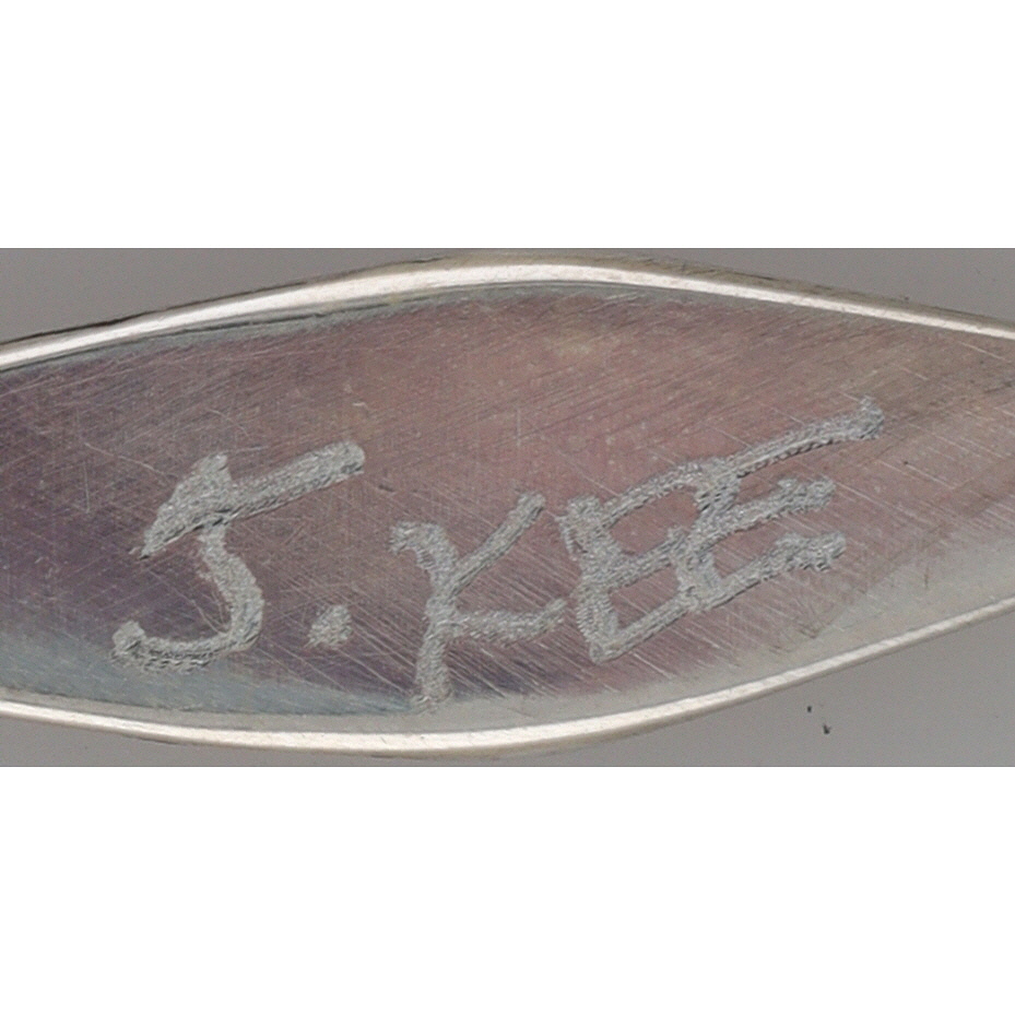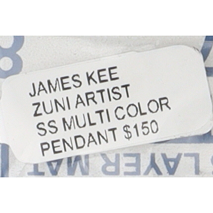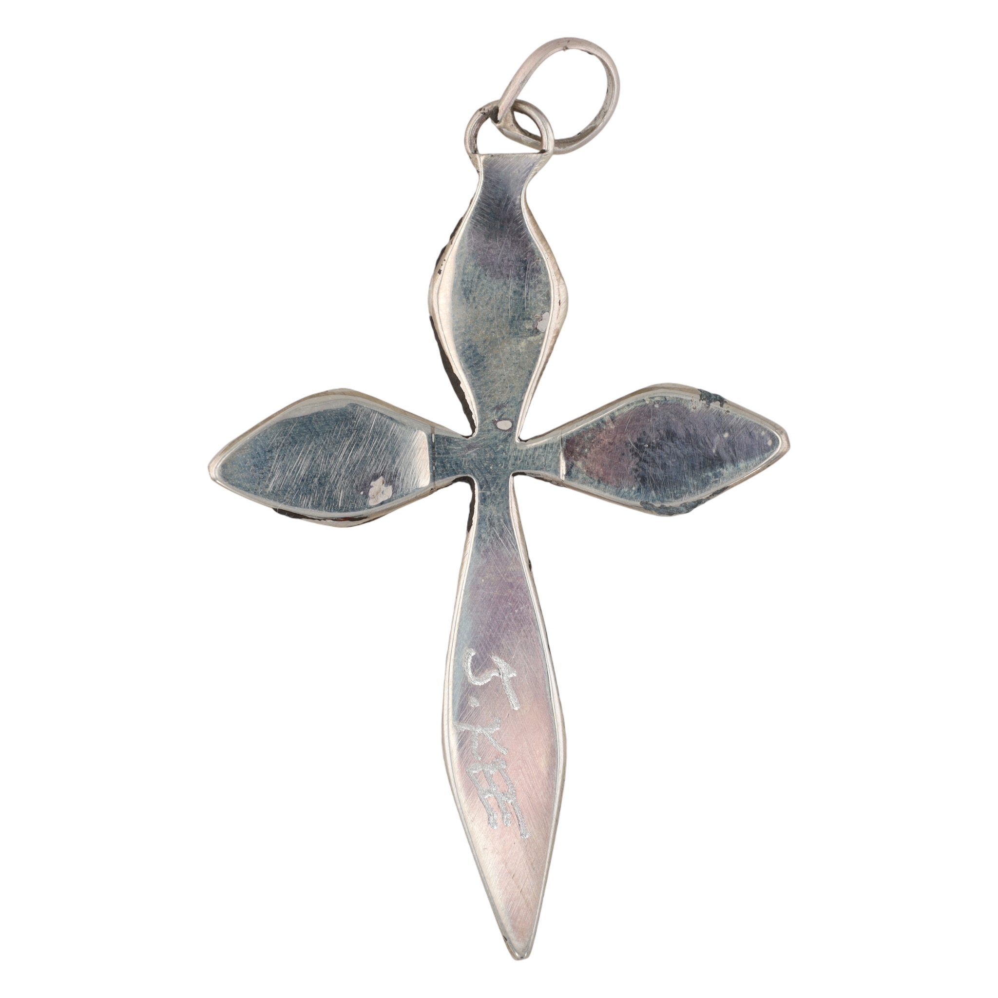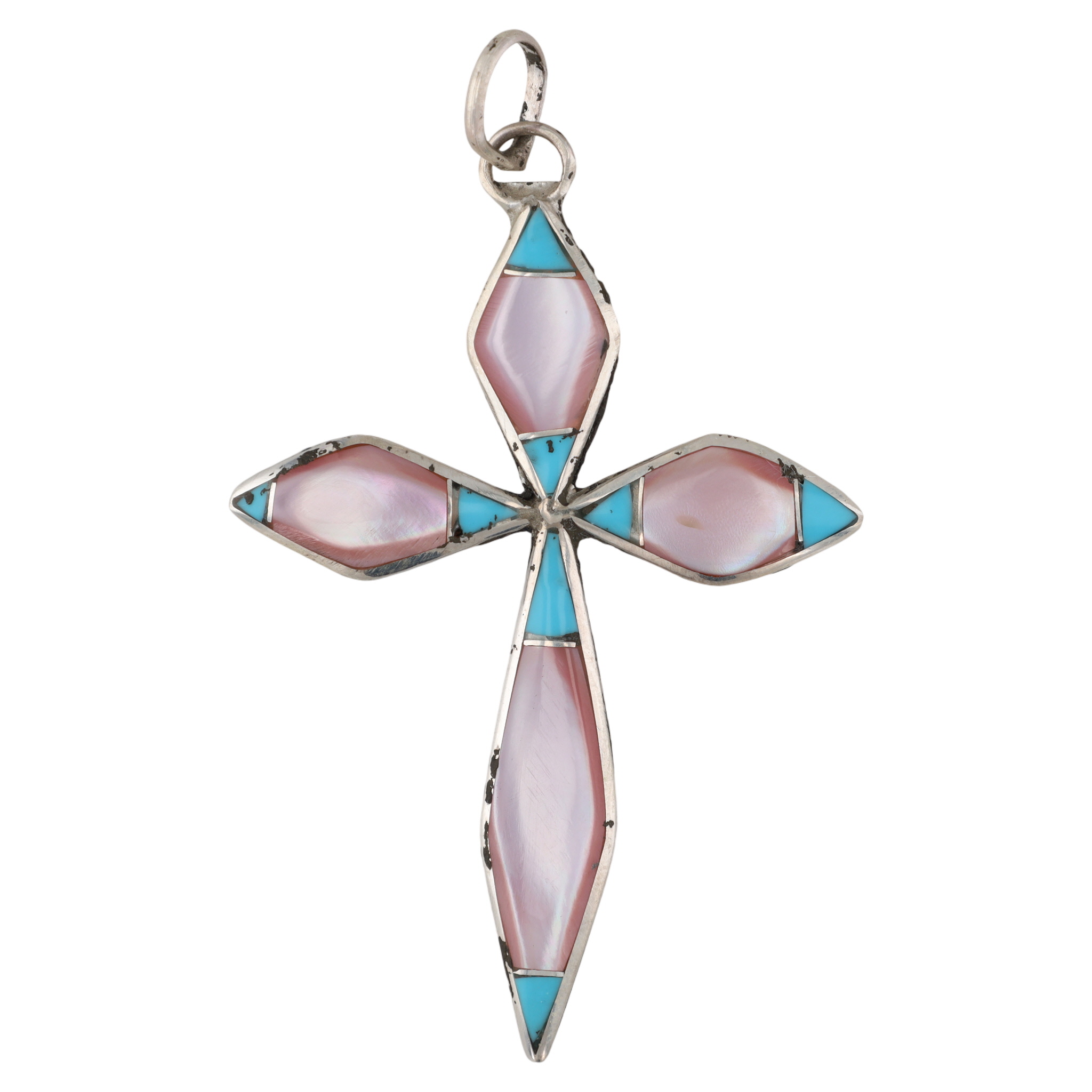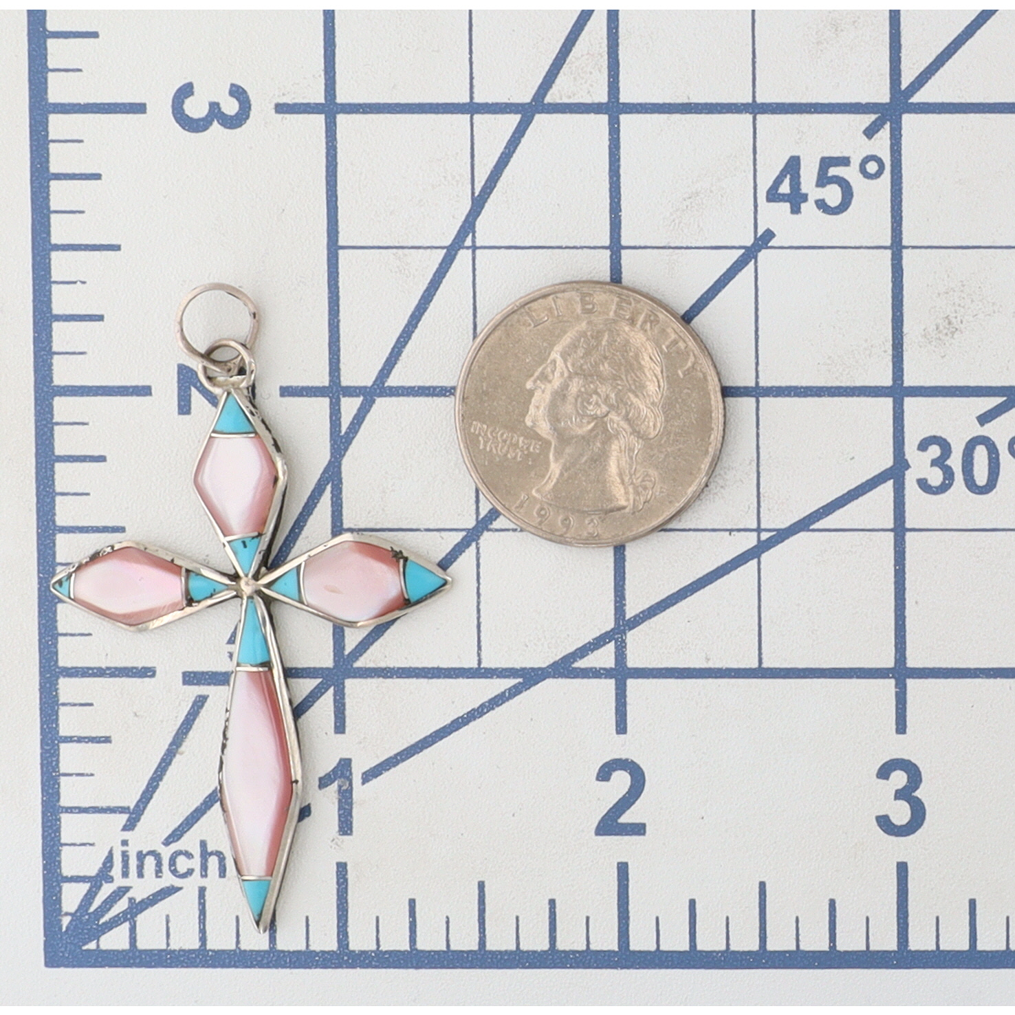 A Zuni sterling silver cross pendant by James Kee, featuring an inlay design. The stylized cross form has tapering arms, inlaid with large, elongated lozenge-shaped sections of pink iridescent mother-of-pearl, bordered by smaller triangular segments of opaque blue-green turquoise. The reverse is visibly engraved "J. KEE". The material is confirmed as sterling silver.