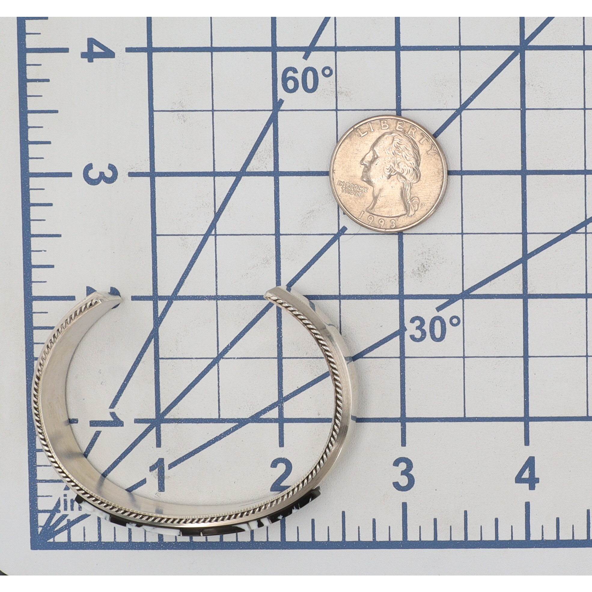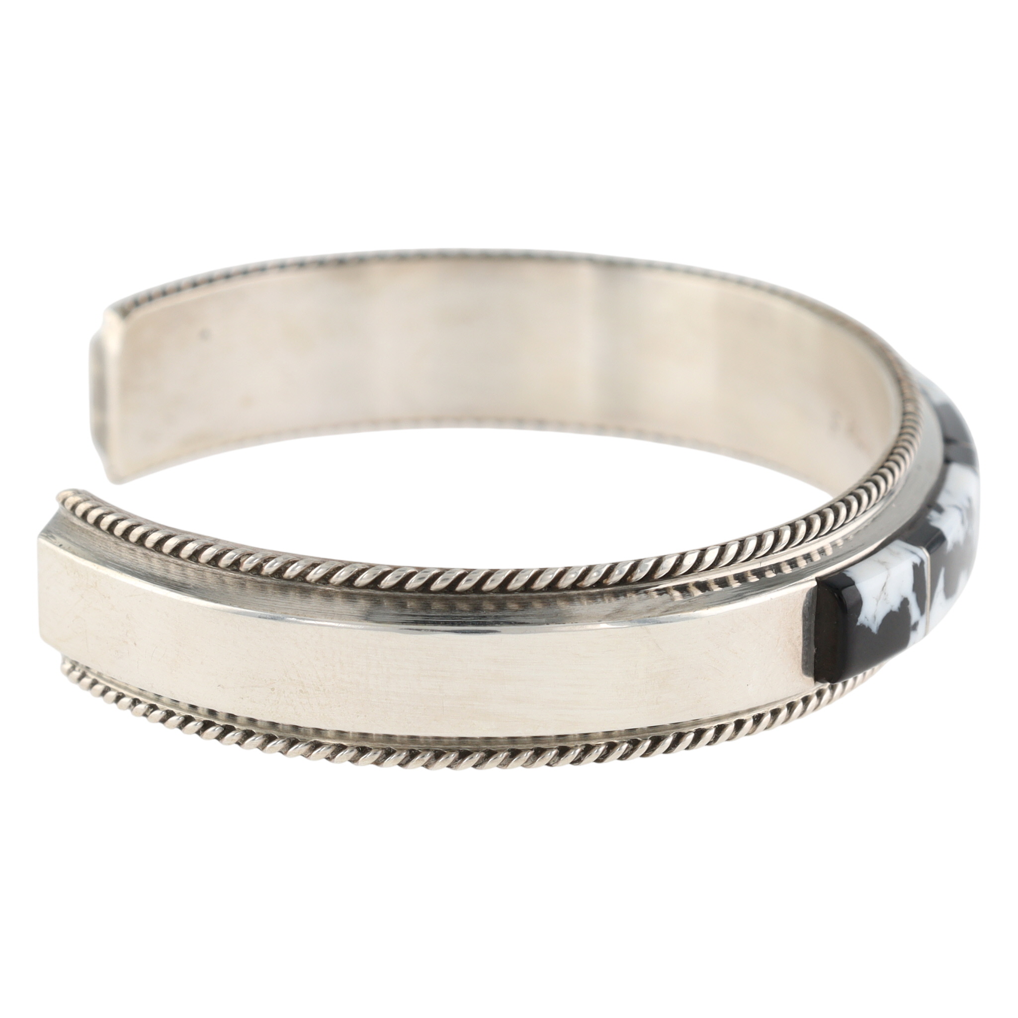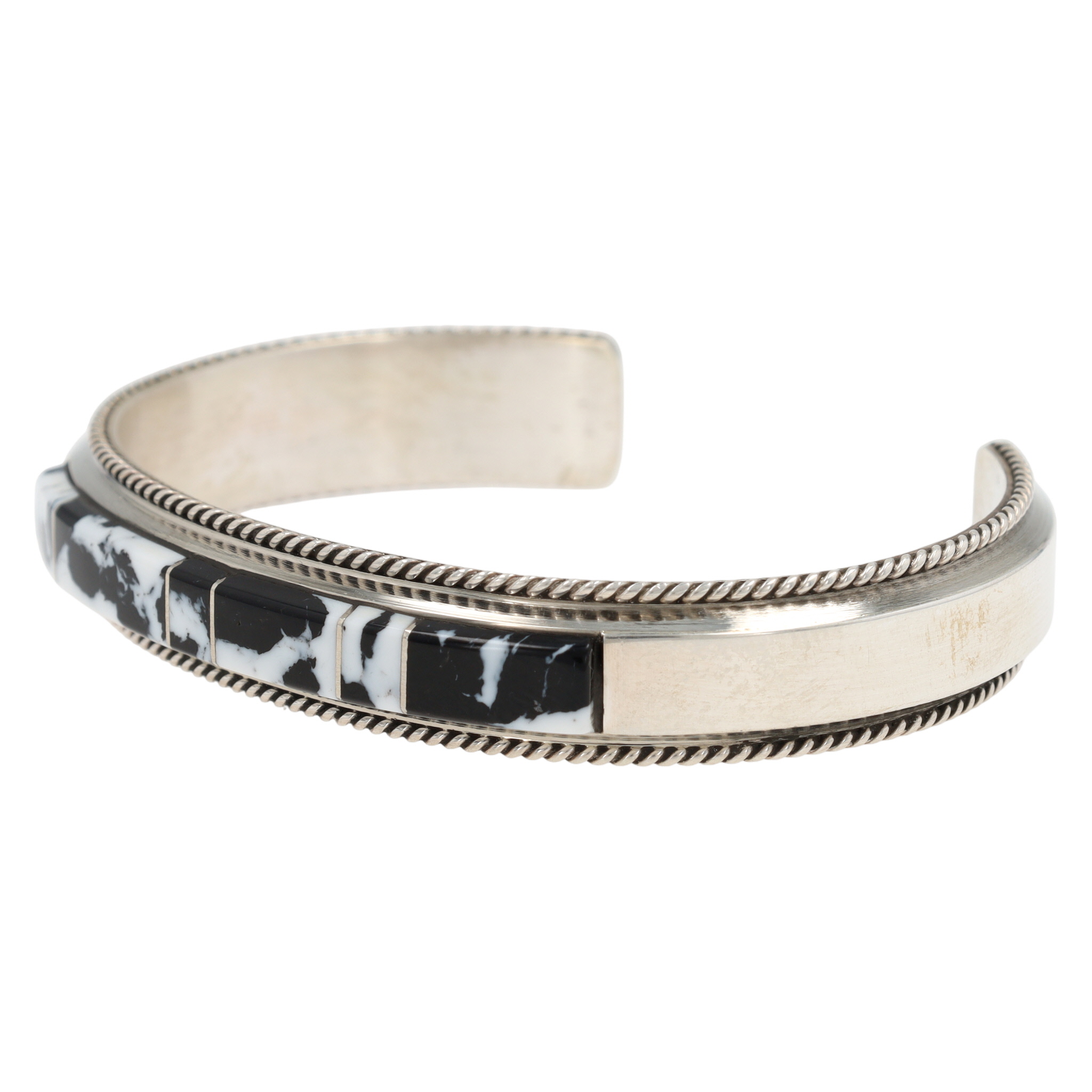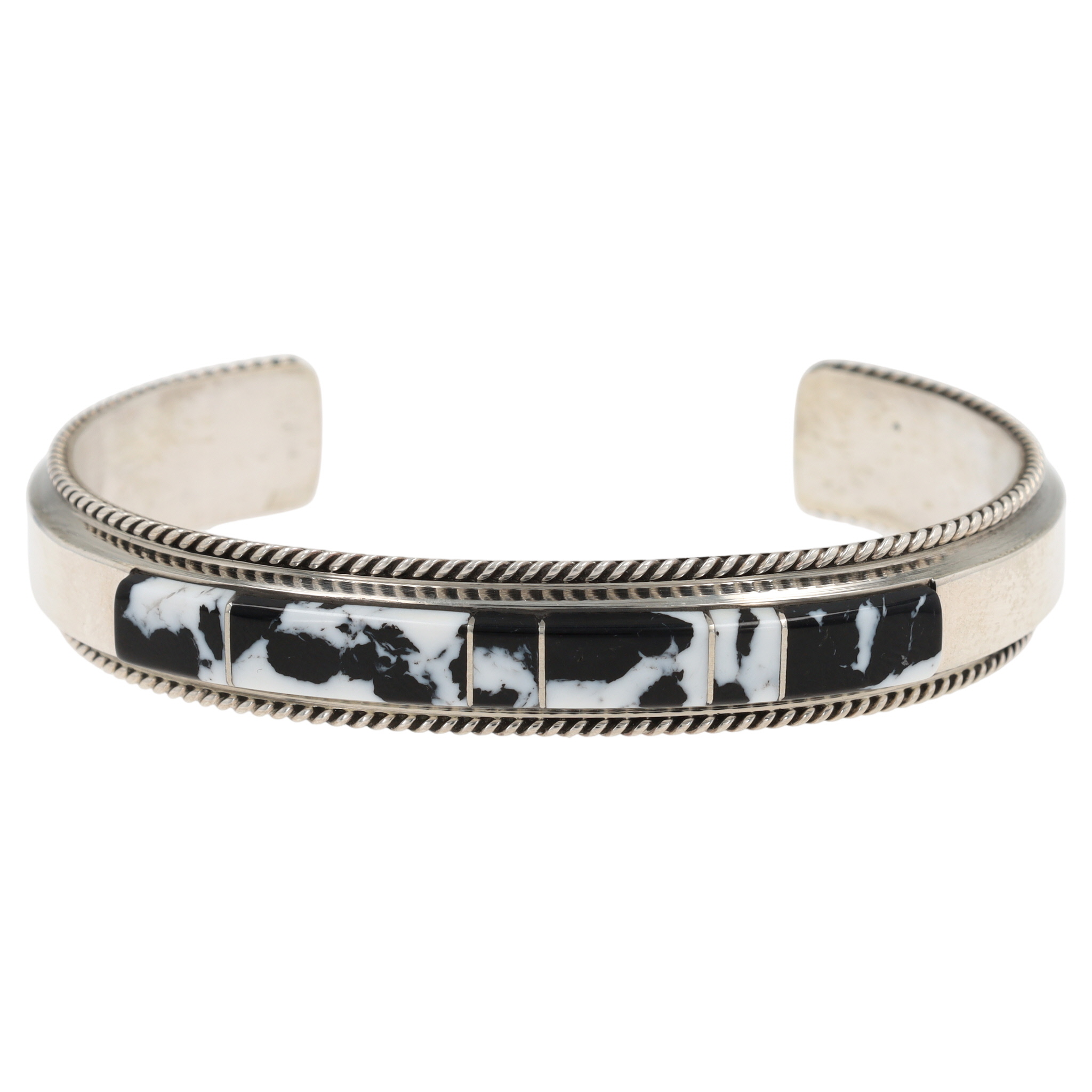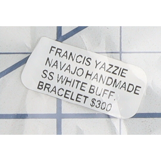 A Navajo handmade sterling silver cuff bracelet by Francis Yazzie, featuring a central band of five rectangular inlaid white buffalo elements. The open-back design has a polished, silver-toned surface. The white buffalo inlay is composed of a distinct black and white patterned stone or material, framed by polished metal borders. Twisted rope-like details run along the top and bottom edges of the cuff adjacent to the inlay. The interior surface is marked with "Sterling" and a capital letter "F".