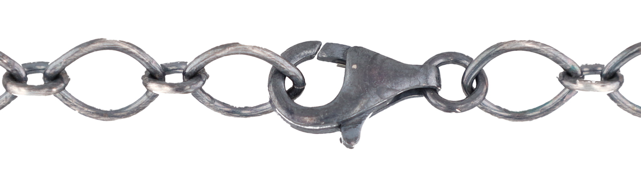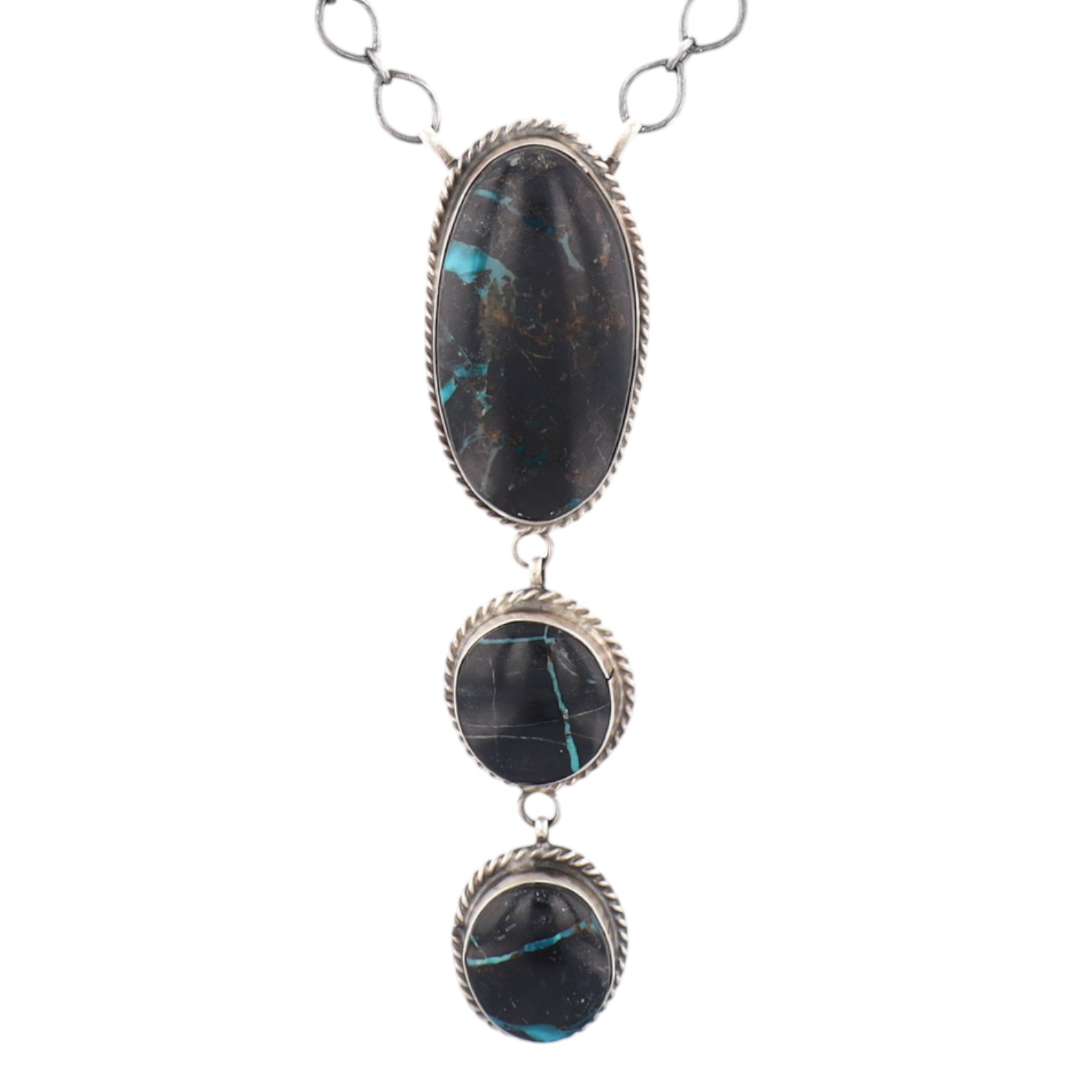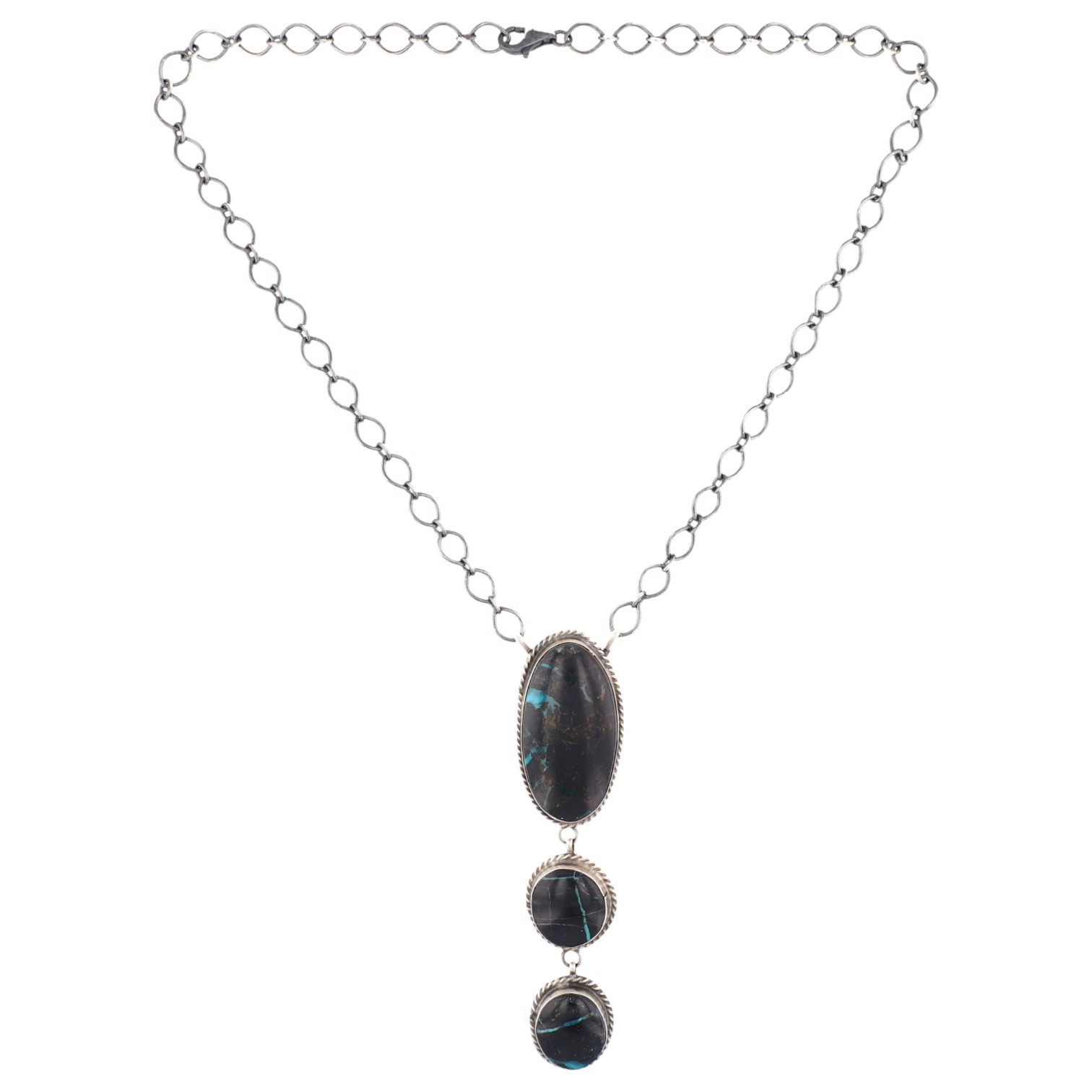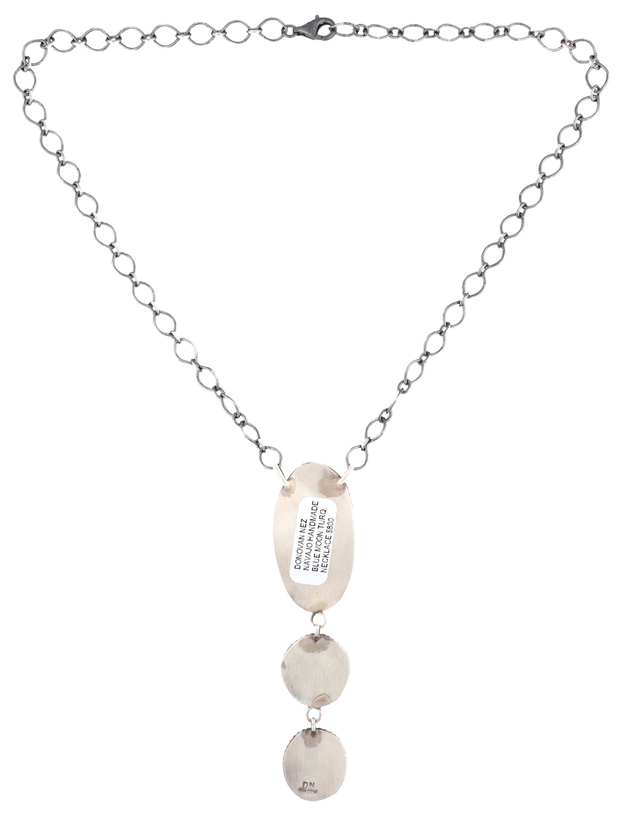 A Navajo sterling silver Lariat necklace by Donovan Nez, featuring a central drop pendant composed of three graduated, oval-shaped cabochon ‘Blue Moon Turquoise’ stones. The stones exhibit a dark matrix with vibrant blue and green inclusions and are bezel-set with twisted wire detail. The pendant is suspended from an oxidized silver-toned chain of interconnected oval links, secured by a lobster clasp. The reverse of the largest stone setting bears a white label marked "DONOVAN NEZ NAVAJO HANDMADE BLUE MOON TURQ. NECKLACE $800", and the smallest setting is hallmarked "DN".