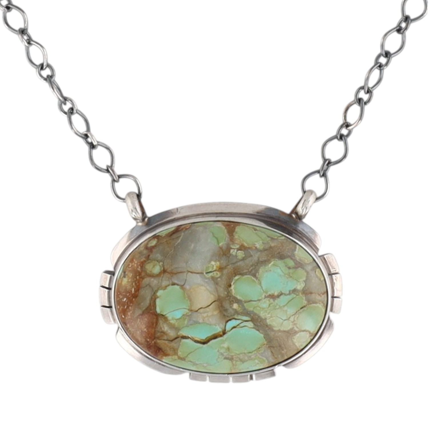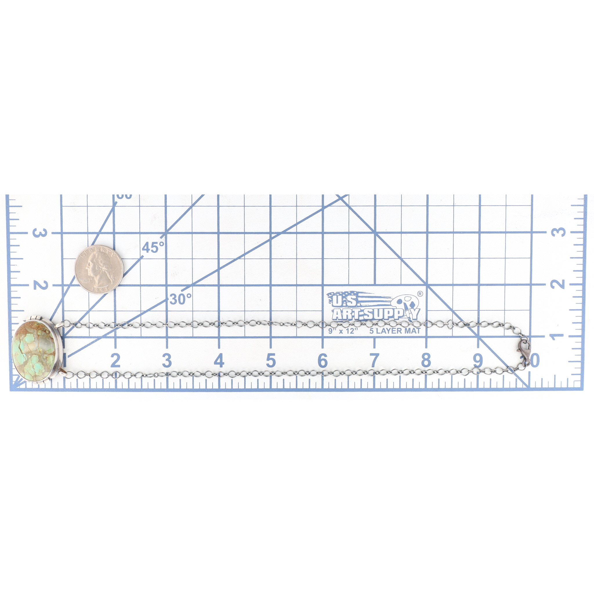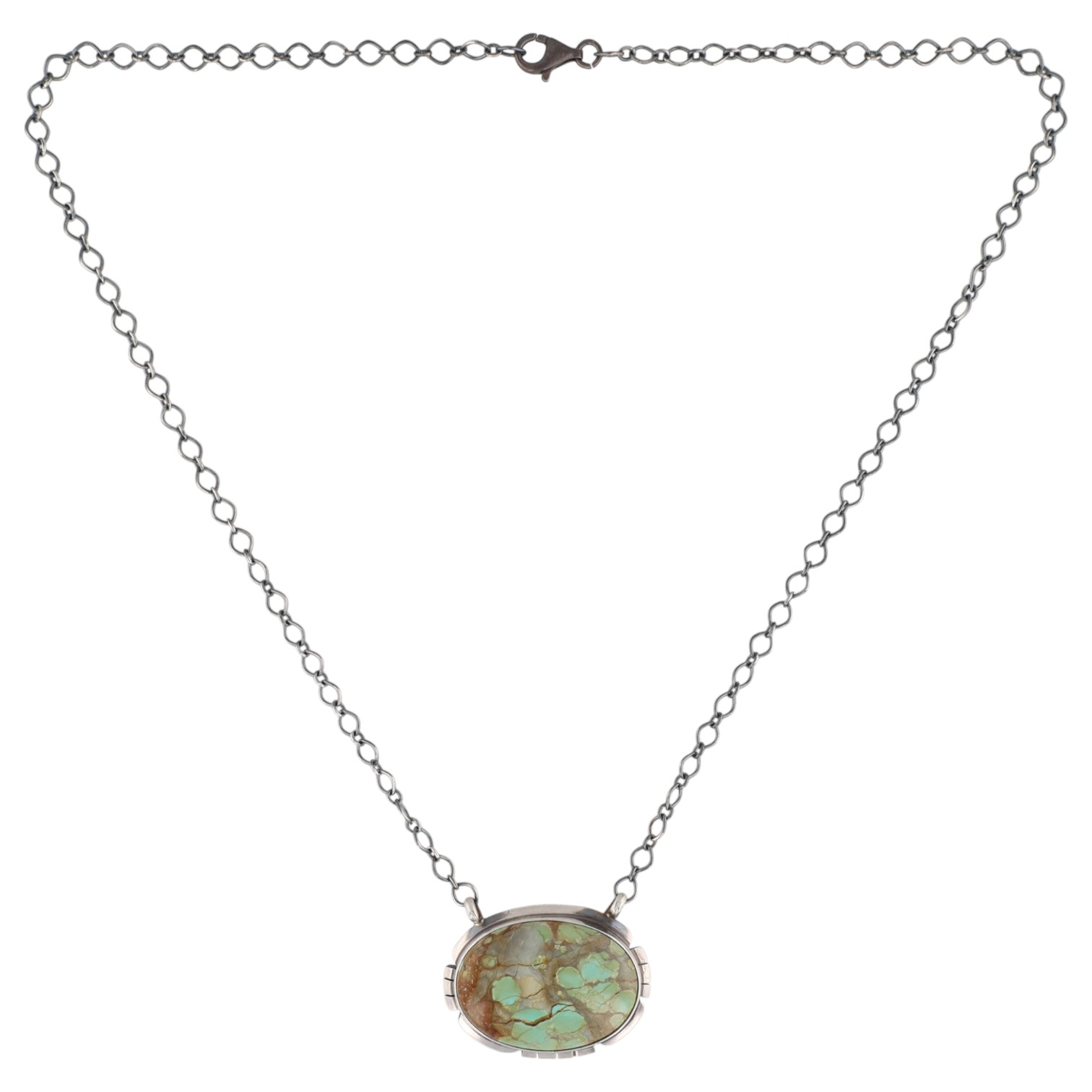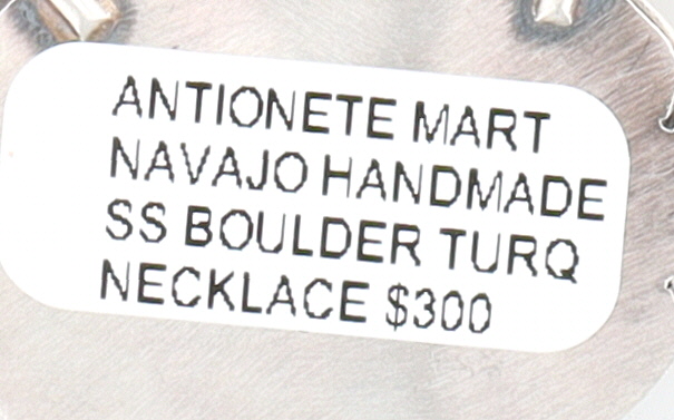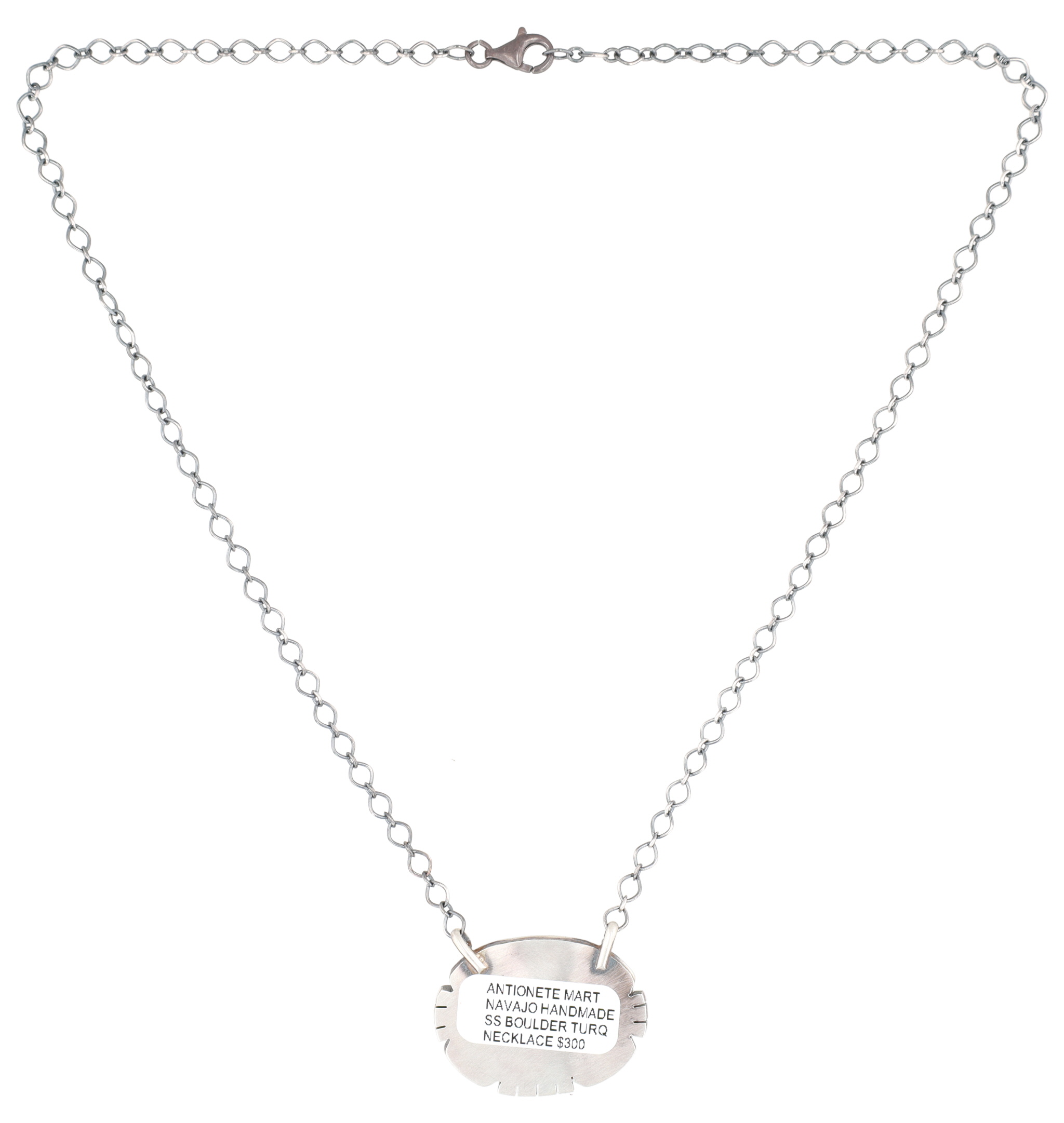 A contemporary handcrafted Navajo sterling silver necklace by Antionette Martinez, featuring an oval, cabochon-cut boulder turquoise stone. The stone displays variegated shades of blue-green and brown matrix, secured in a bezel setting. The pendant is suspended from a multi-link silver-tone chain with a lobster clasp closure. The metal components exhibit a subdued, oxidized finish. The reverse of the pendant carries a white label marked with black text that reads: "ANTIONETE MART NAVAJO HANDMADE SS BOULDER TURQ NECKLACE $300."