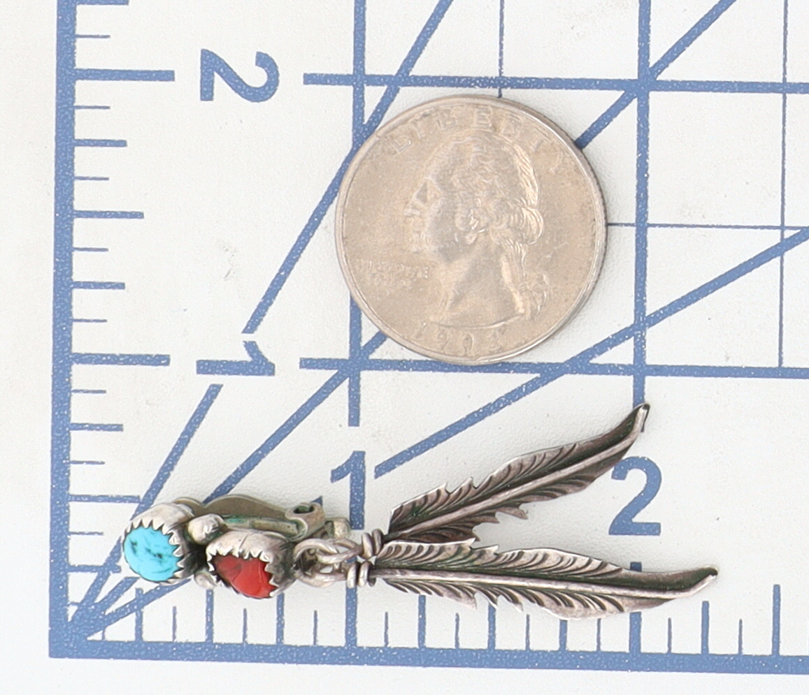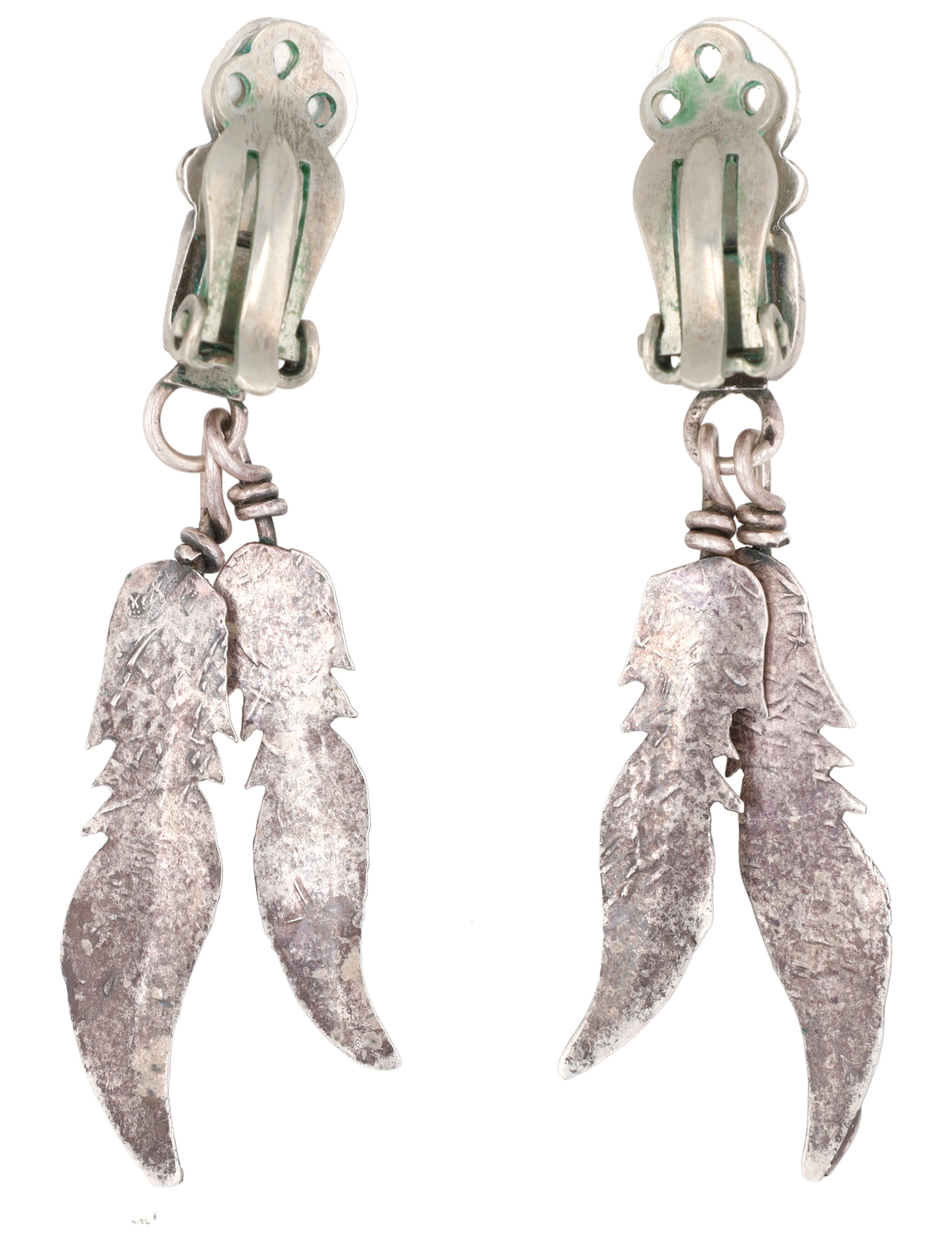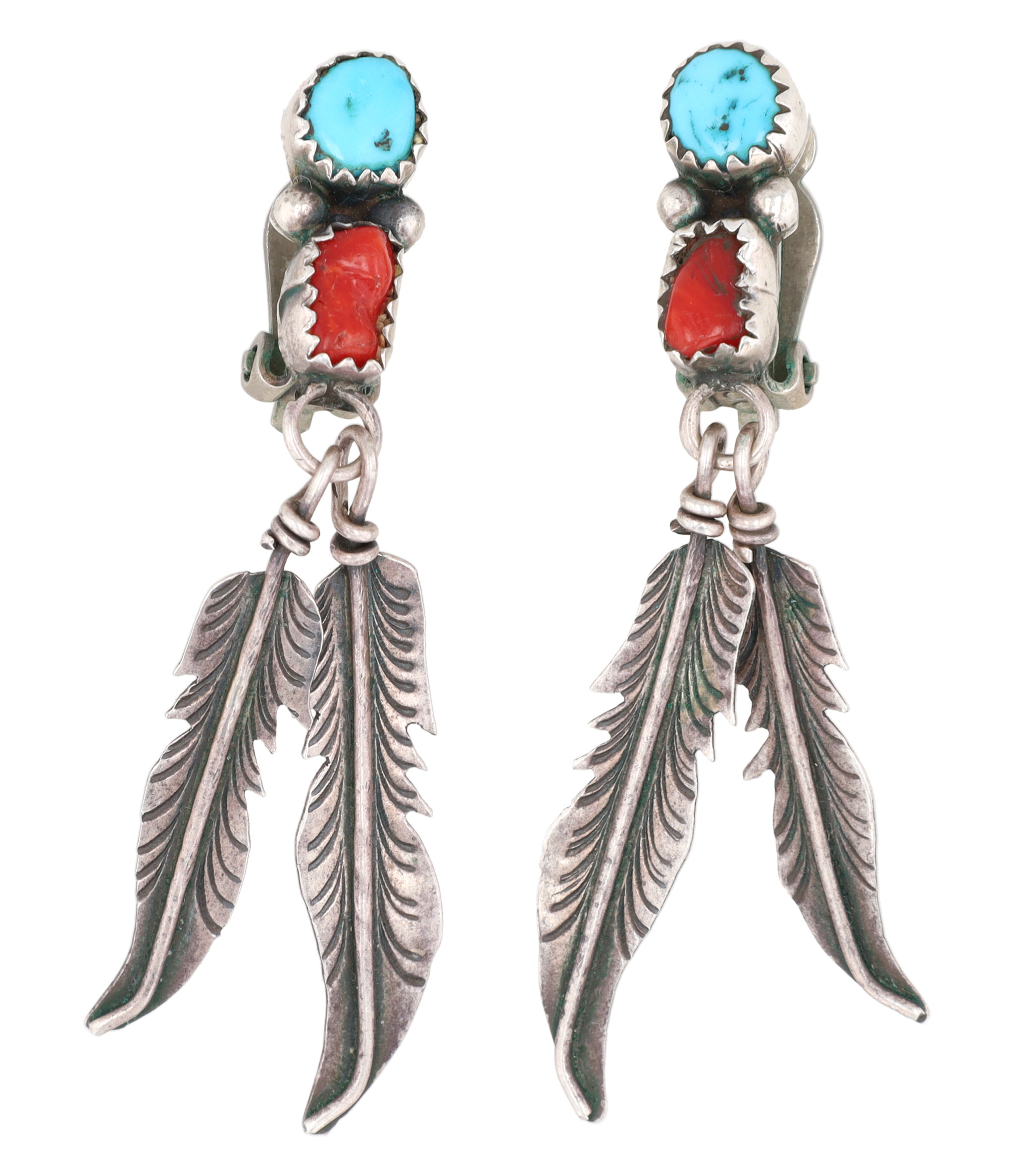 A pair of vintage Navajo Sterling Silver Turquoise and Coral Feather Dangle Clip-On Earrings. Each earring features an upper bezel-set round turquoise cabochon positioned above a bezel-set irregular red coral stone. Suspended beneath are two detailed, oxidized feather-shaped drops, typical of the style. The closure mechanism for both earrings is a clip-on fitting. No visible text, maker’s marks, or hallmarks are discernible on any part of the pieces. The metal exhibits consistent patination and surface wear, indicative of age and use.