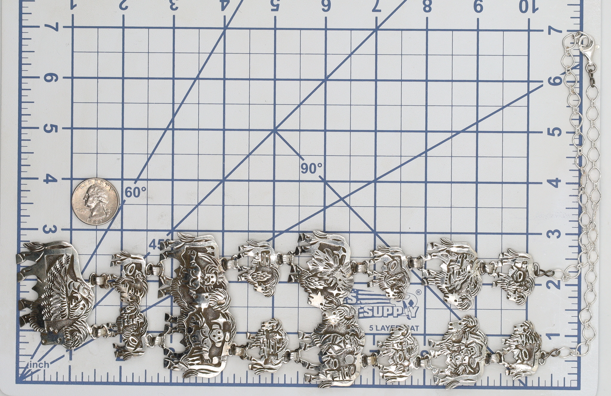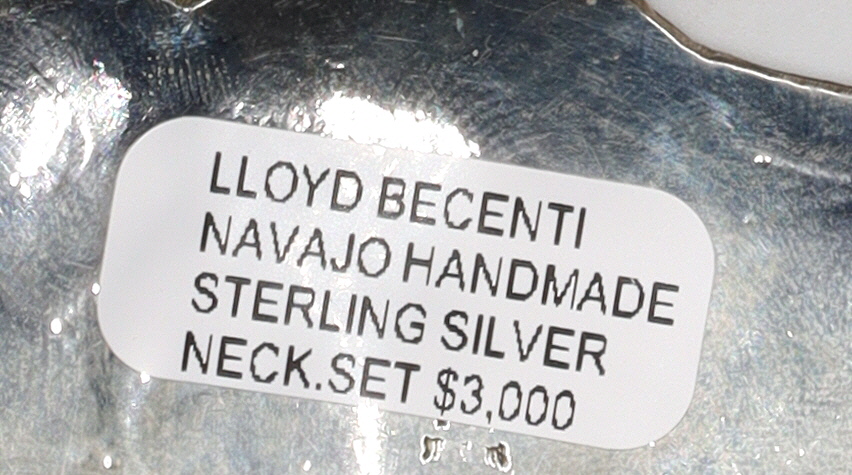 A Navajo handmade sterling silver ‘storyteller’ necklace by Lloyd Becenti, composed of twenty-one graduated, stylized bison-shaped plaques, connected by small jump rings, with an oval-link chain and lobster clasp. The plaques are intricately detailed with raised or etched designs, depicting various motifs including human-like faces within their forms. The reverse of the largest central plaque bears an adhesive label reading ‘LLOYD BECENTI NAVAJO HANDMADE STERLING SILVER NECK.SET $3,000’, and a stamped mark ‘LB STERLING’ is visible on another plaque.