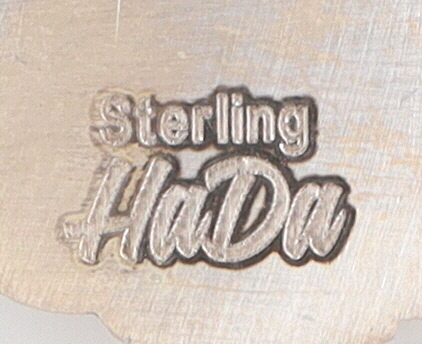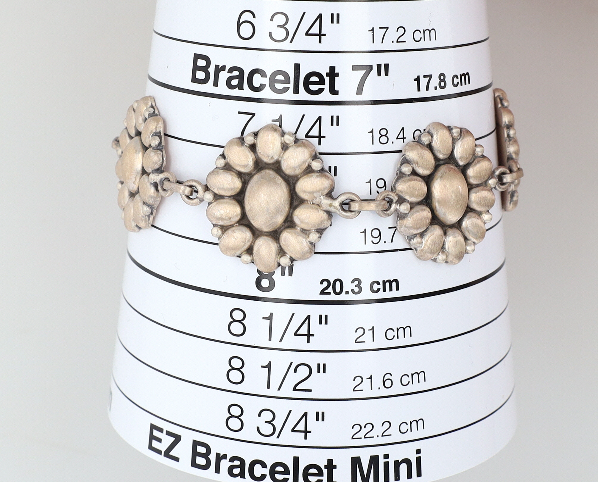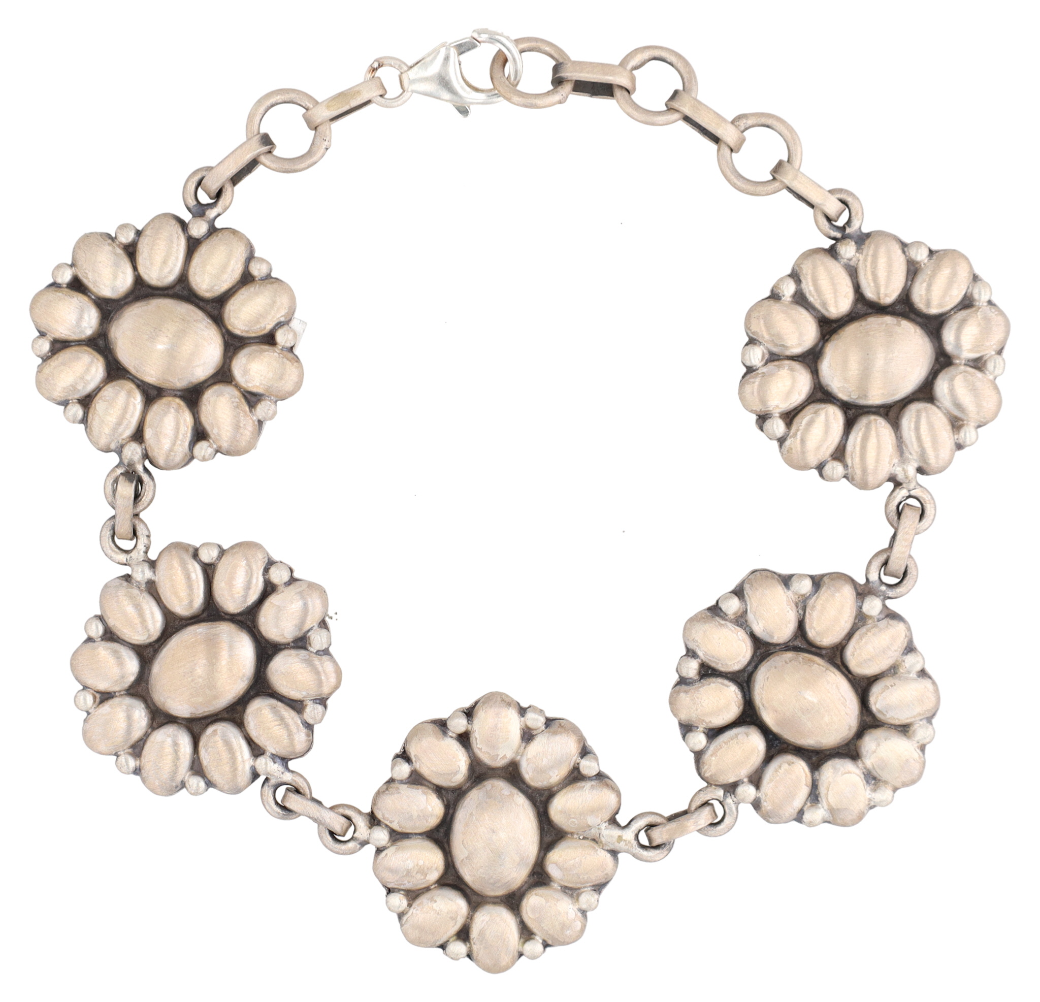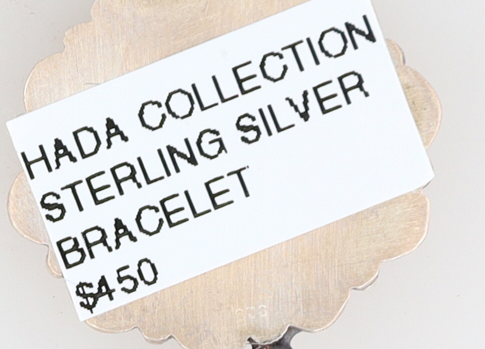 A HaDa Collection sterling silver bracelet, featuring five articulated, cluster-style links, each centered with an oval cabochon-shaped element surrounded by numerous smaller rounded forms. The links are connected by oval jump rings, and the bracelet secures with a lobster claw clasp. Visible hallmarks include ‘925’ on the clasp and ‘Sterling HaDa’ stamped on the reverse of one link. An attached retail tag also identifies the item as a ‘HADA COLLECTION STERLING SILVER BRACELET’ priced at ‘$450’.