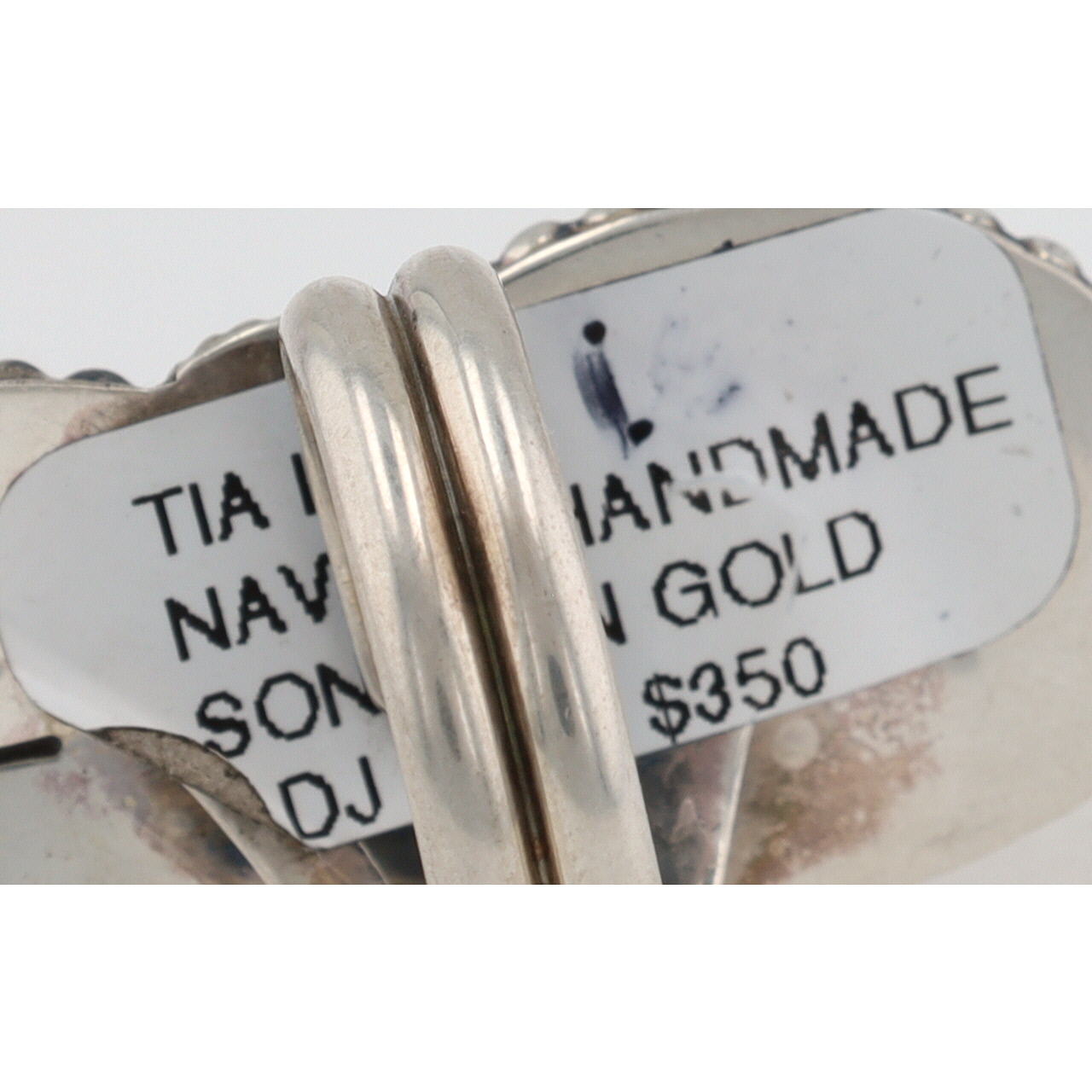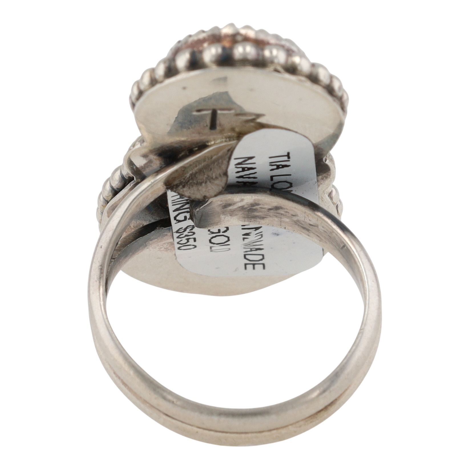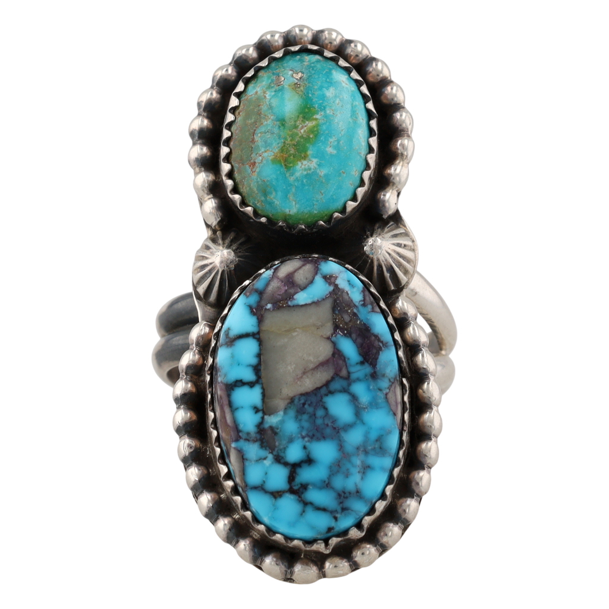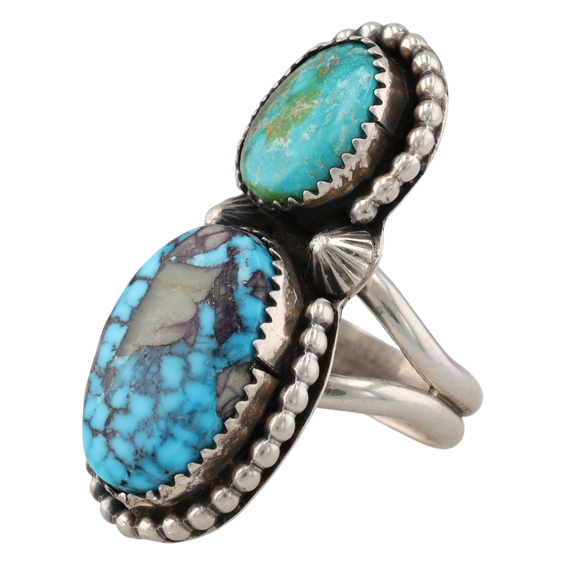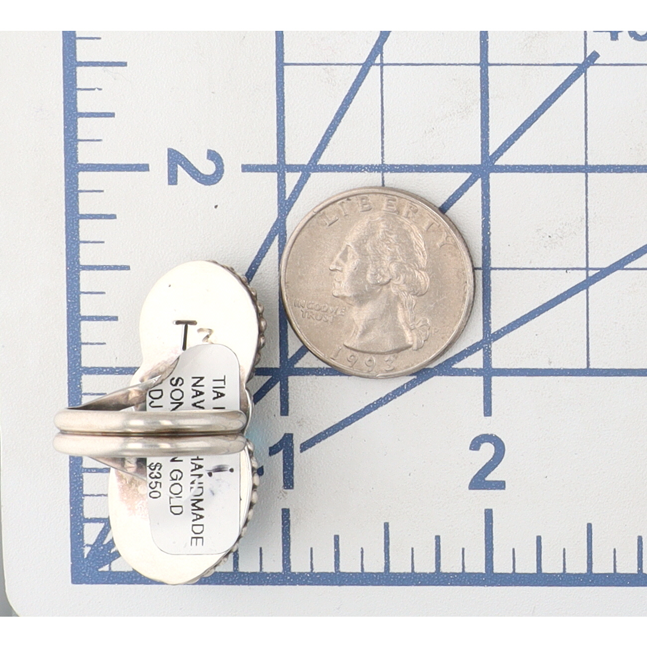 A Navajo sterling silver adjustable ring by Tia Long, featuring a vertical two-stone design. It is set with two bezel-set oval turquoise cabochons; the upper stone displays a blue-green hue with visible matrix, while the lower, larger stone is a more intense blue with pronounced dark and light matrix. Both settings are edged with a beaded border and separated by small, fluted decorative elements. The ring band is a split-shank design. The reverse of the setting is stamped with "T3". A partially visible retail tag is attached, reading in part "TIA LONG", "HANDMADE", "NAVAJO", and "SONORAN GOLD", along with "$350", though the metal presents as silver.