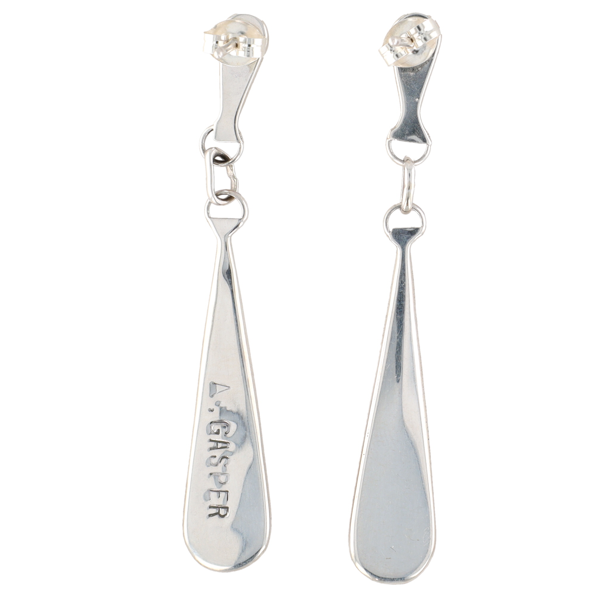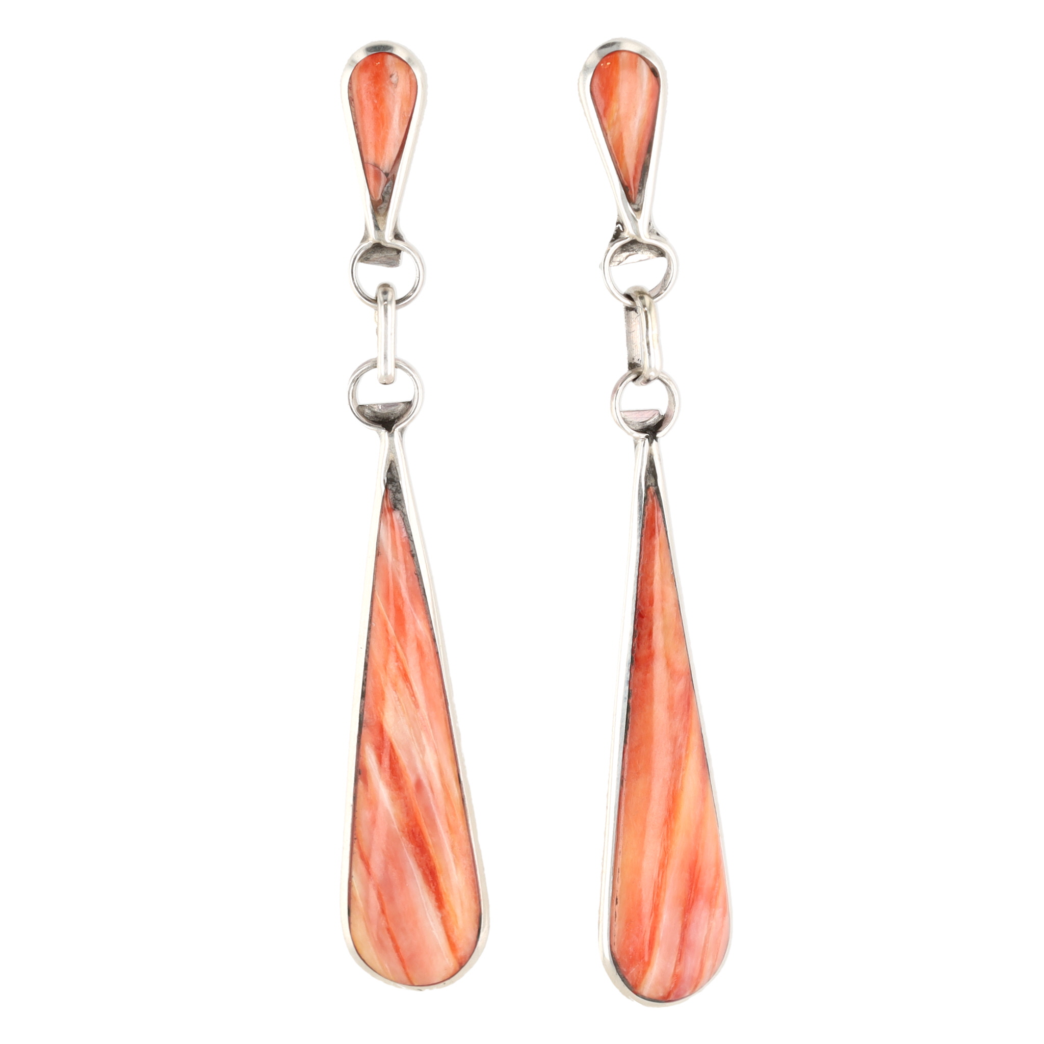 A pair of Navajo sterling silver and spiny oyster dangle earrings by Alfred Gasper. Each earring features an elongated, two-part design, composed of a smaller upper teardrop element linked to a larger, tapering lower drop. Both elements are set with reddish-orange spiny oyster shell exhibiting distinct natural striations. The reverse of one earring is clearly stamped with the maker’s mark "A. GASPER". The earrings are fitted with post and butterfly backs.