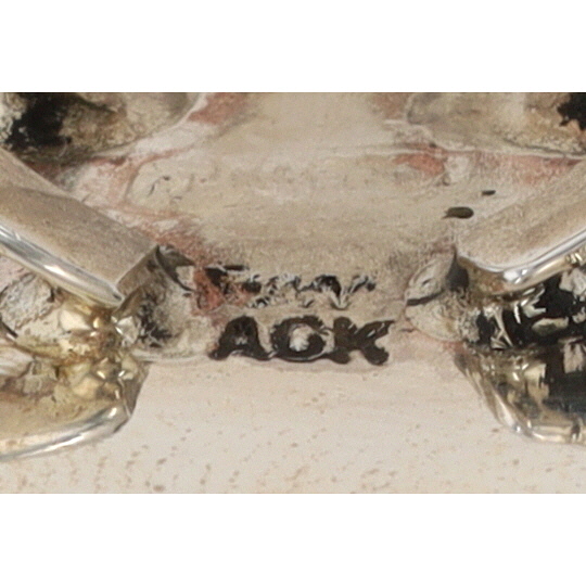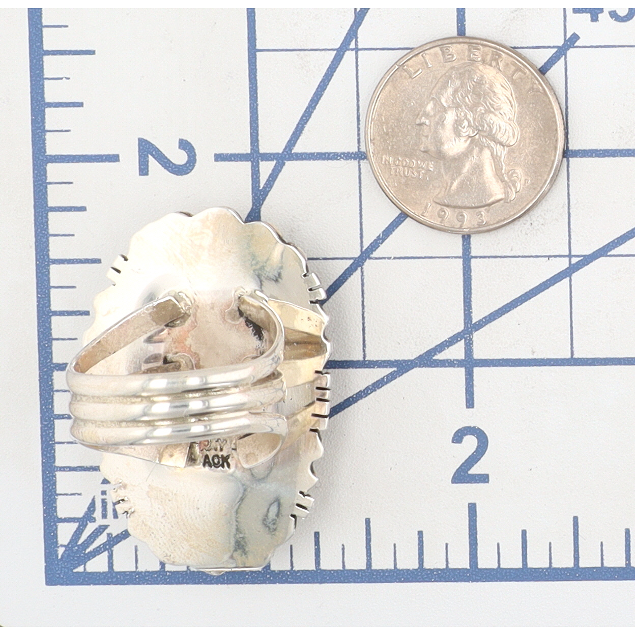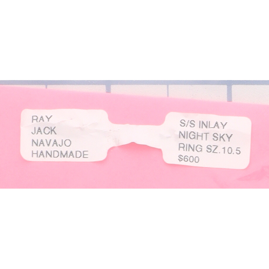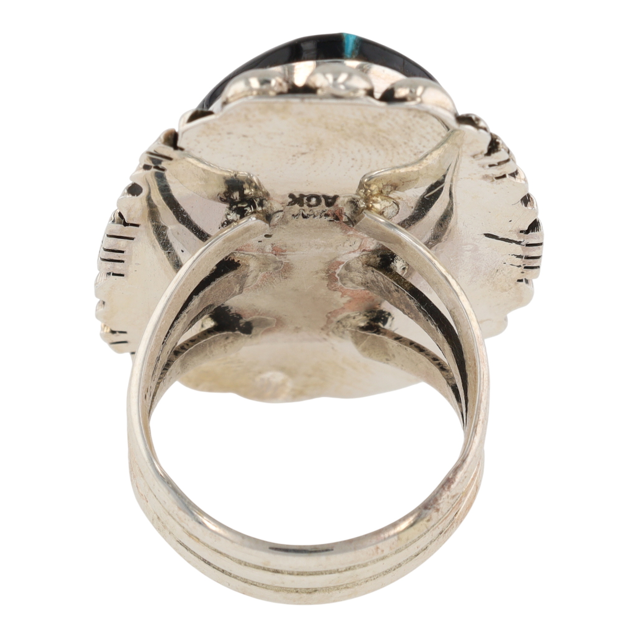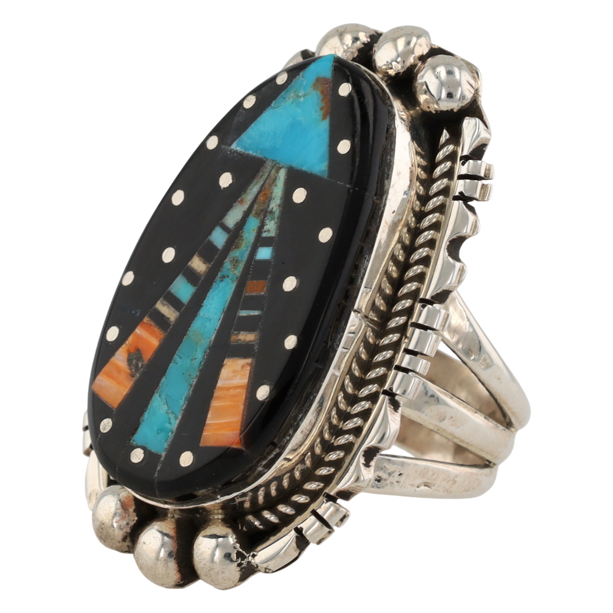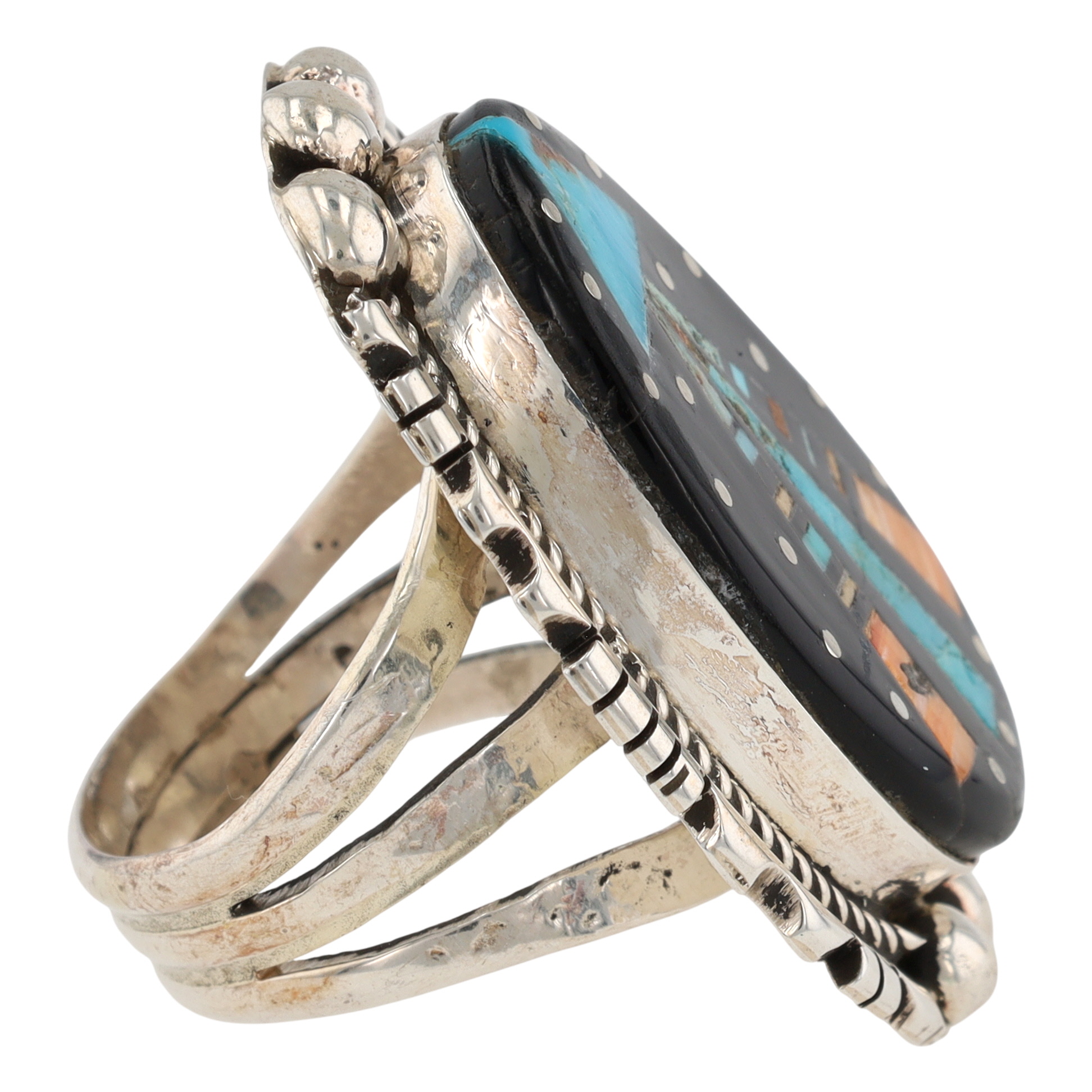 A Navajo sterling silver multi-stone inlay ‘Kachina’ ring attributed to Ray Jack. This oval-shaped ring is handcrafted in a contemporary Southwestern-style inlay design. It features an elevated bezel adorned with silver beads and a twisted rope border, set on a triple-split shank band. The central inlay consists of onyx, turquoise, and spiny oyster, with sterling dots as night stars. A central geometric motif incorporates precise segments of the above mentioned stones.