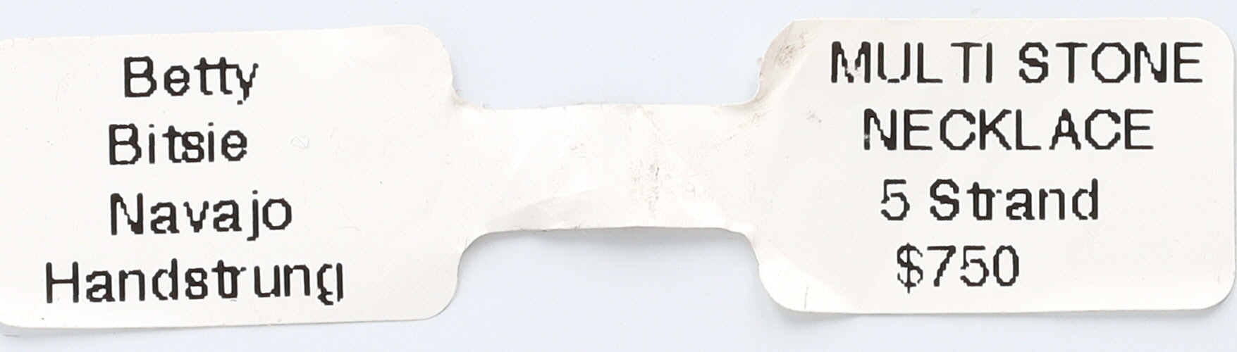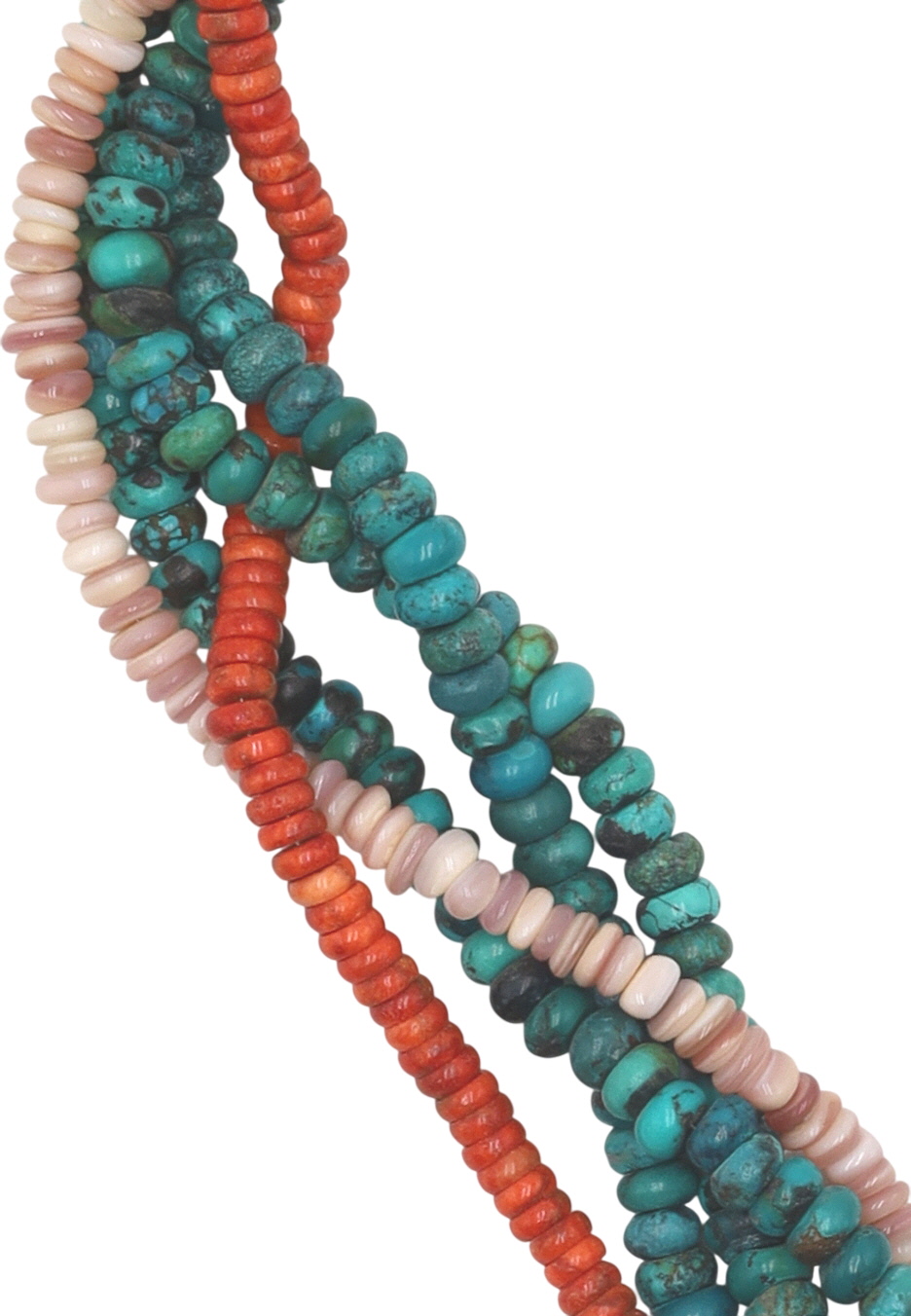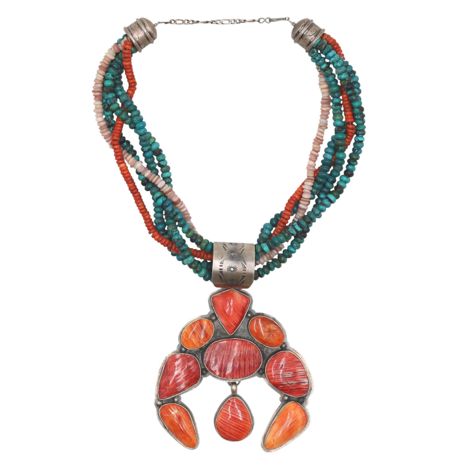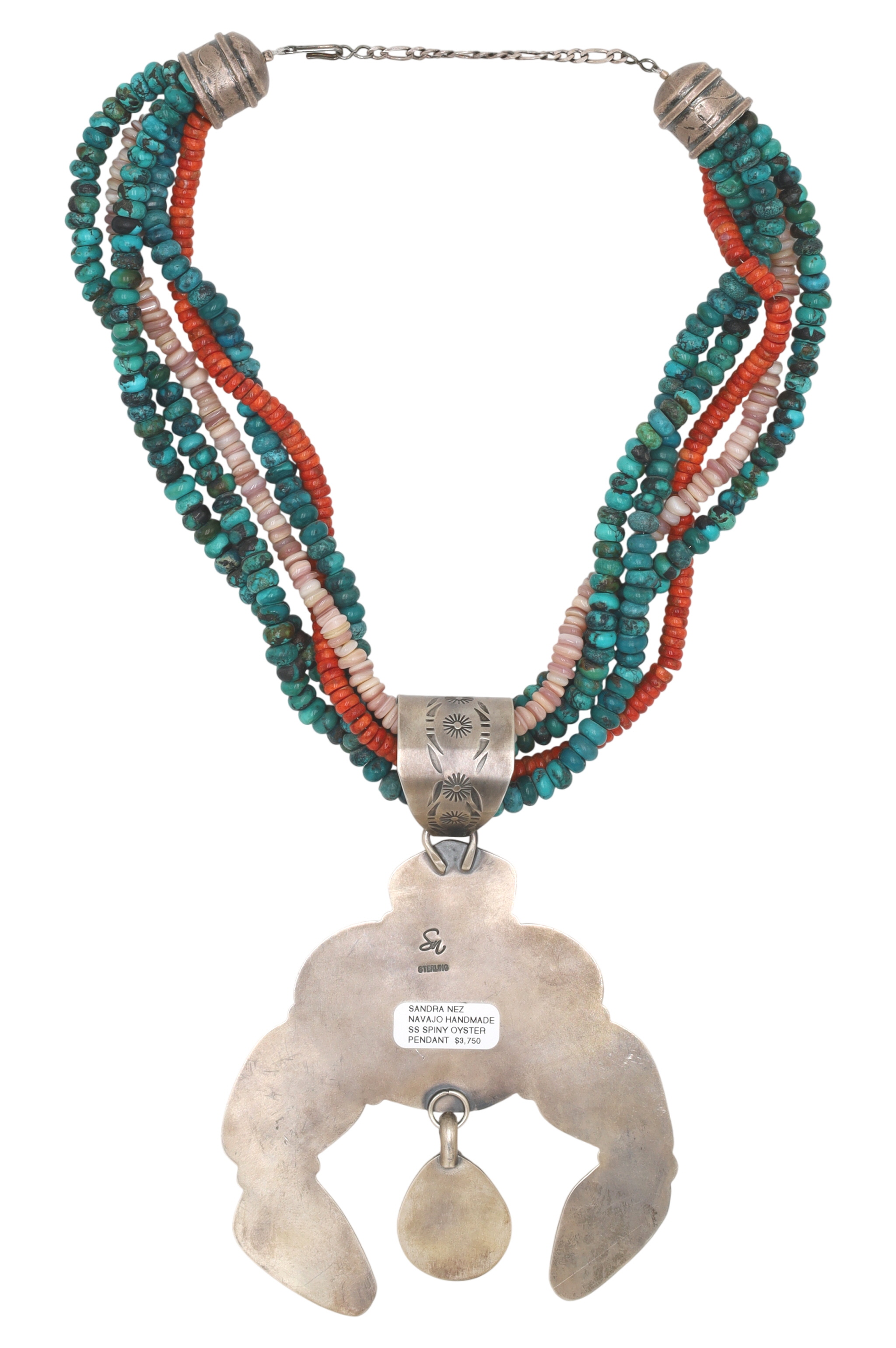 A Navajo sterling silver multi-strand necklace featuring a pendant by Sandra Nez and hand-strung beads by Betty Bitsie. The substantial silver-colored metal pendant, crafted in a stylized naja-like form, is set with eight polished cabochons of varying shapes, displaying vibrant orange and reddish hues with visible striations, identified as spiny oyster. The five beaded strands consist of small, irregular beads in variegated teal turquoise, red-orange coral, and mother of pearl. The silver elements, including the pendant, a decorative slider, and end caps, are adorned with stamped sunburst and linear motifs. The reverse of the pendant is clearly stamped "SN" and "STERLING, " and bears an adhesive label identifying it as "SANDRA NEZ NAVAJO HANDMADE SS SPINY OYSTER PENDANT." An additional tag identifies the necklace as "MULTI STONE 5 Strand" and "Betty Bitsie Navajo Handstrung"