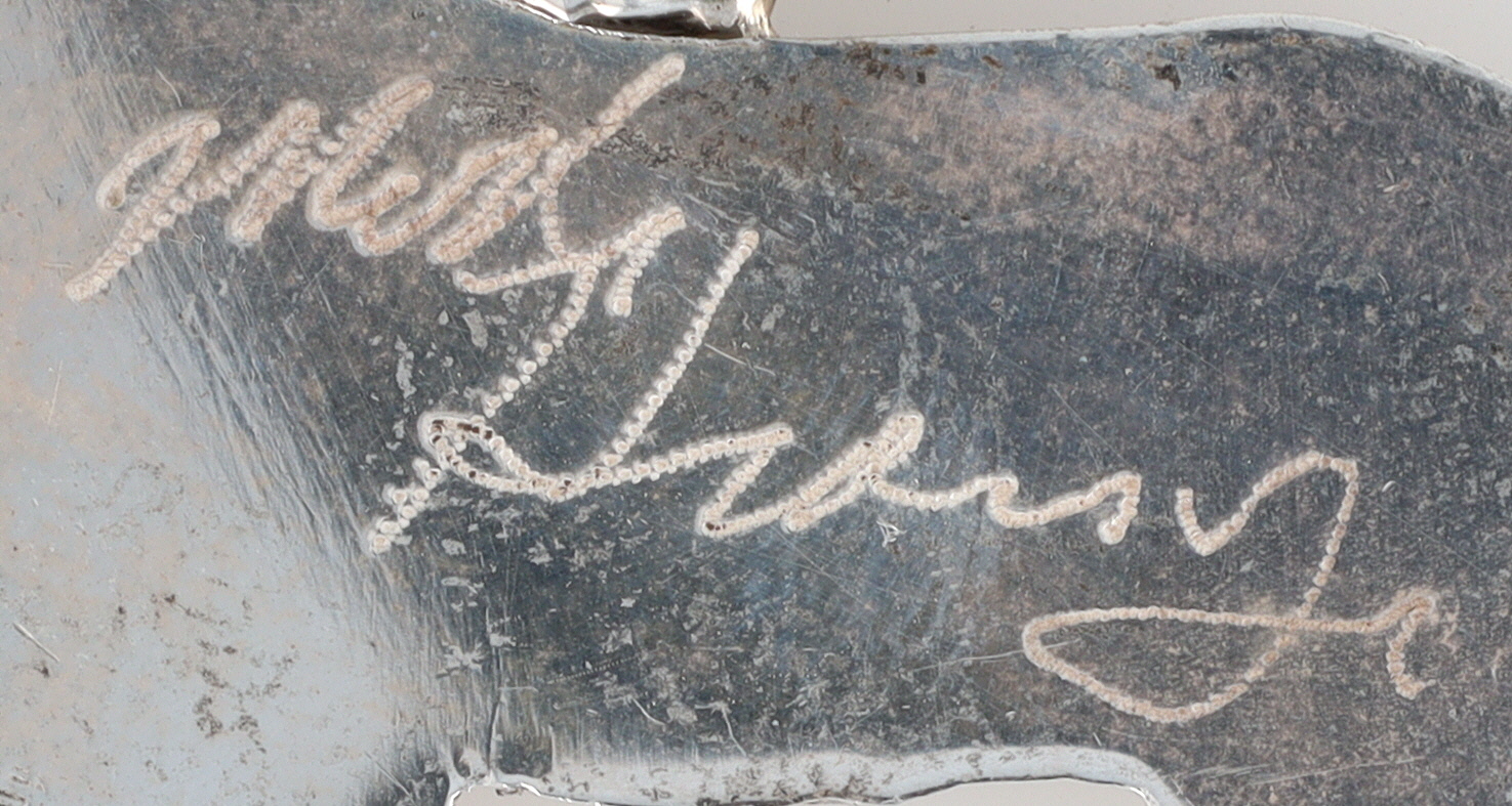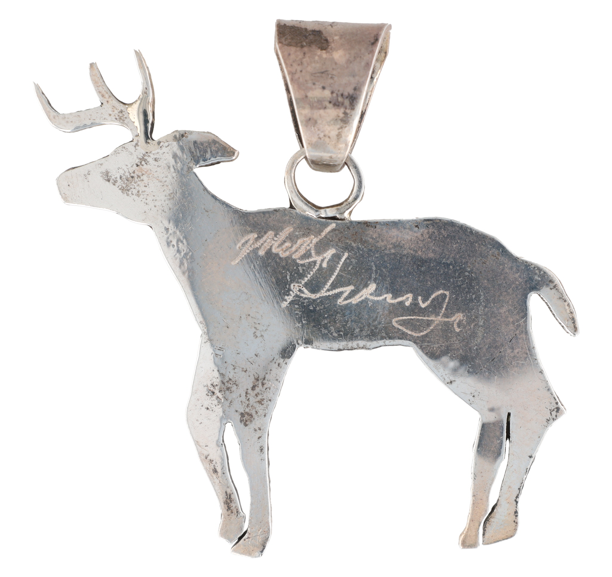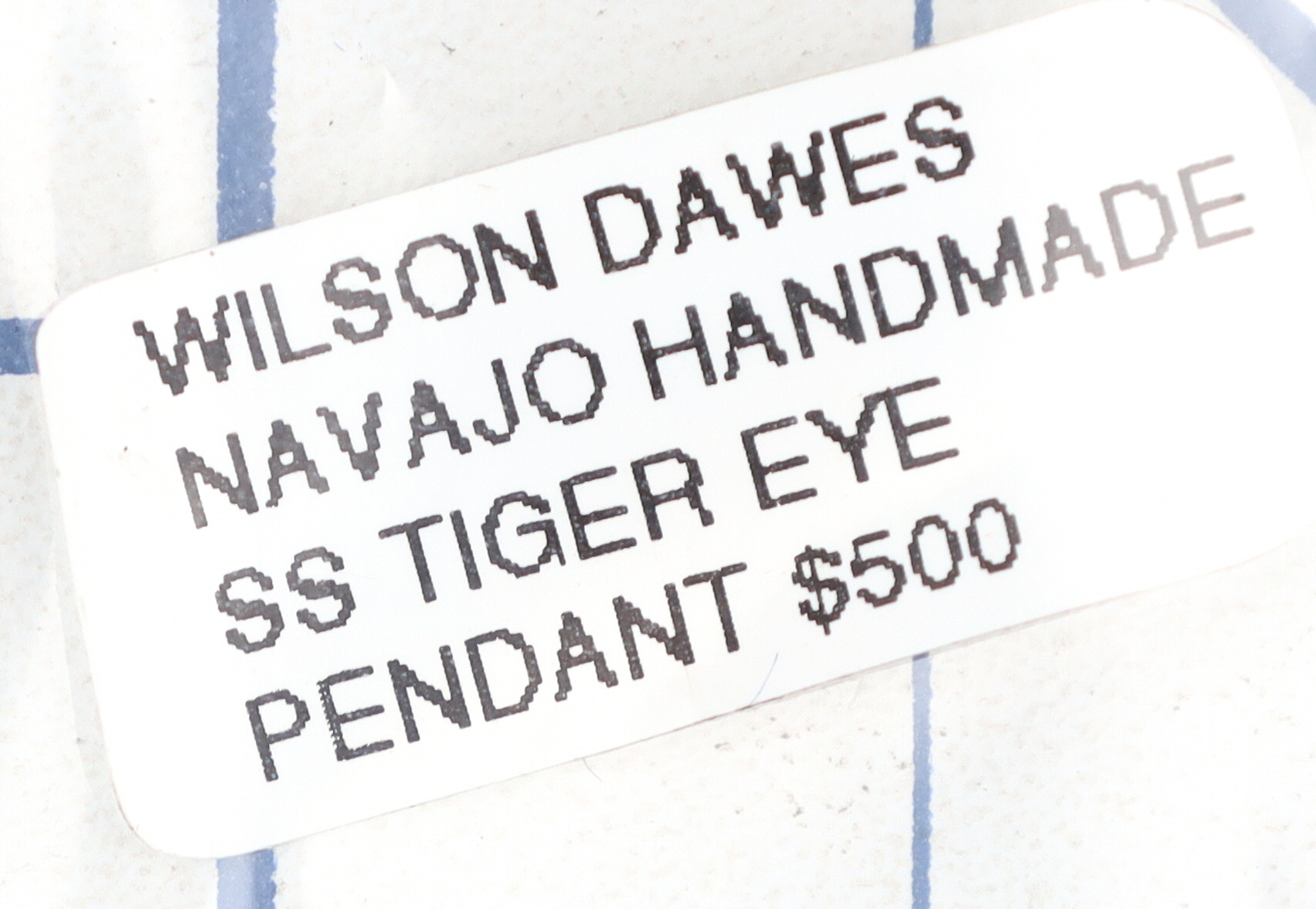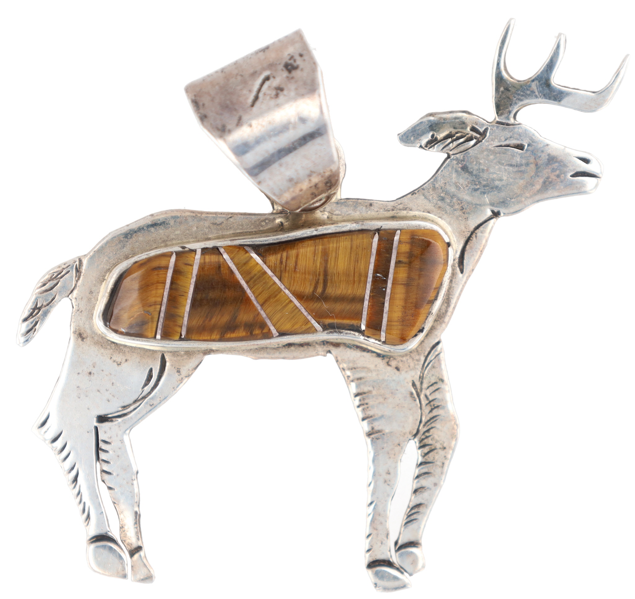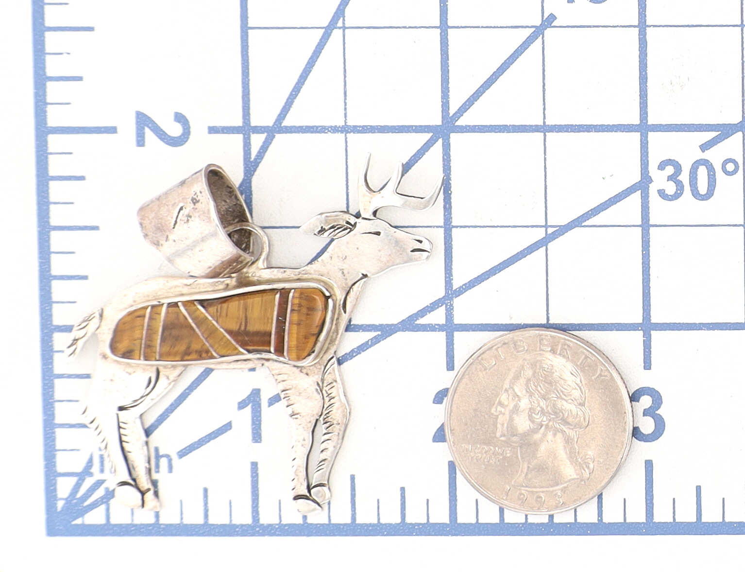 A Navajo handmade sterling silver pendant by Wilson Dawes, featuring a standing deer or stag with antlers. The central body of the animal is inlaid with multiple trapezoidal and rectangular segments of brown and golden-hued Tiger Eye stone, separated by thin metal dividers. A substantial bail, suitable for a chain, is attached to the back of the animal’s torso. The reverse of the pendant features an etched inscription, "Wilson Dawes", corroborating the attribution.