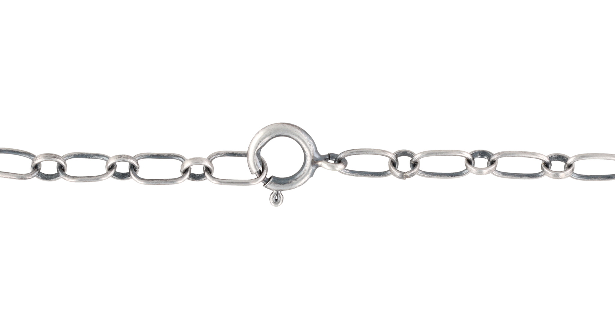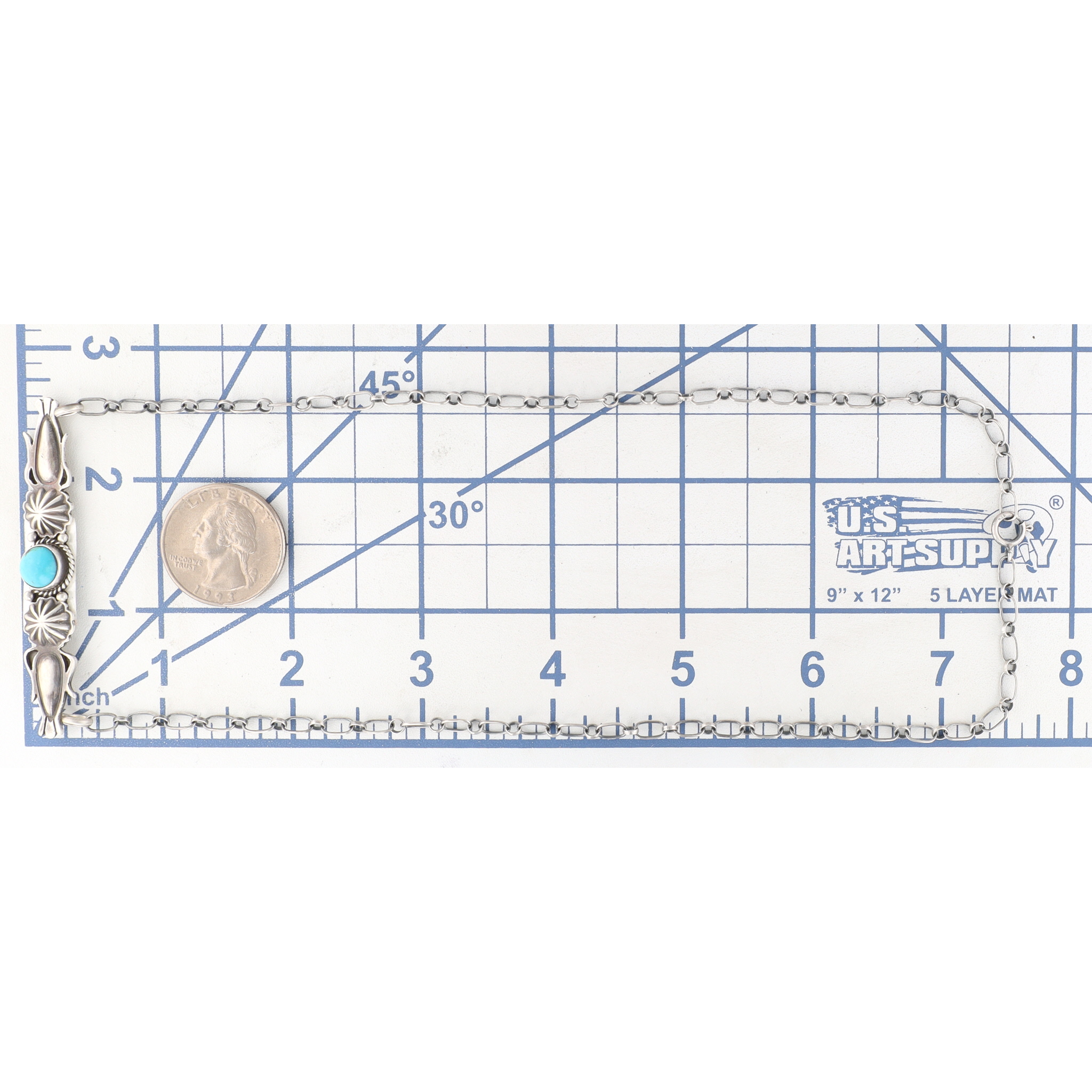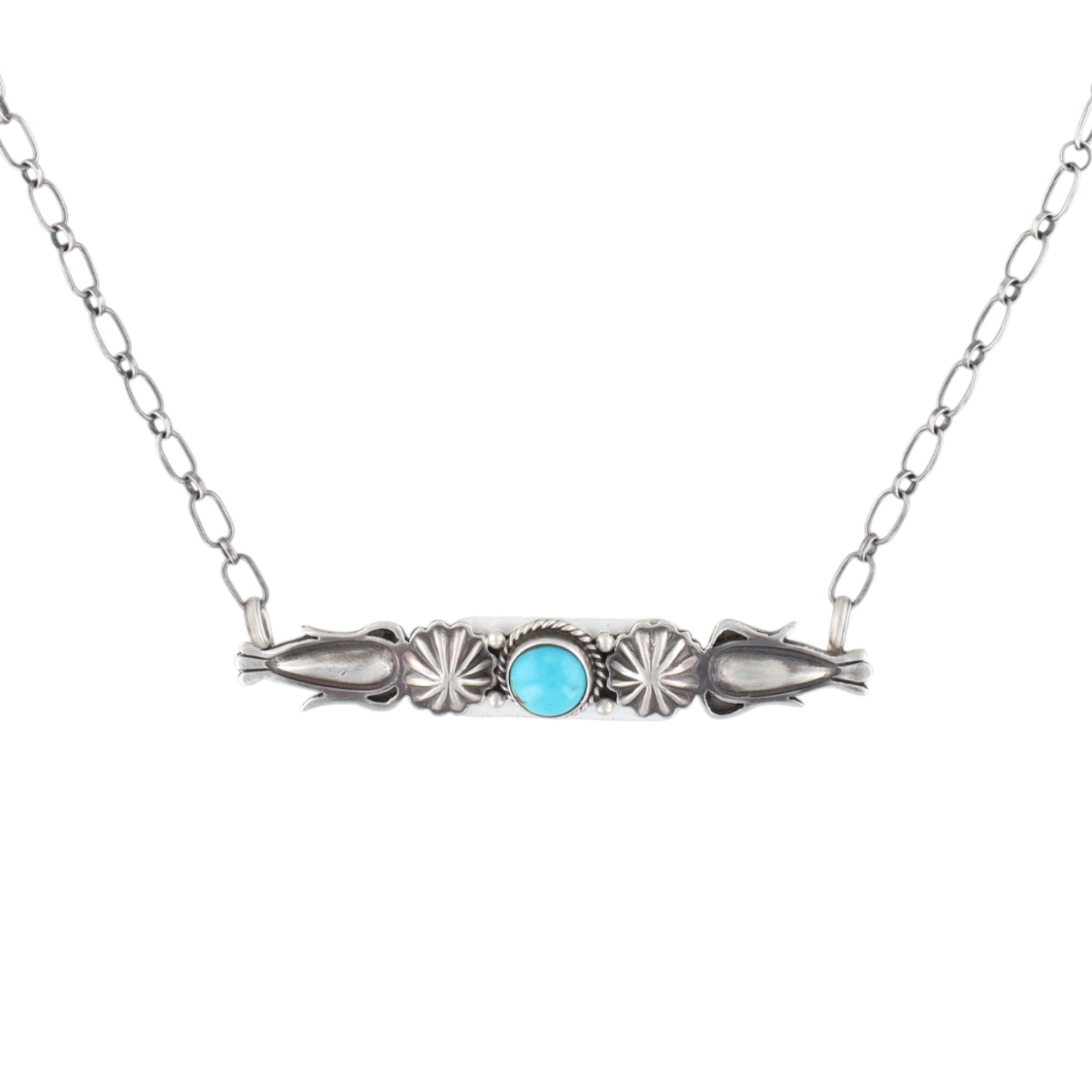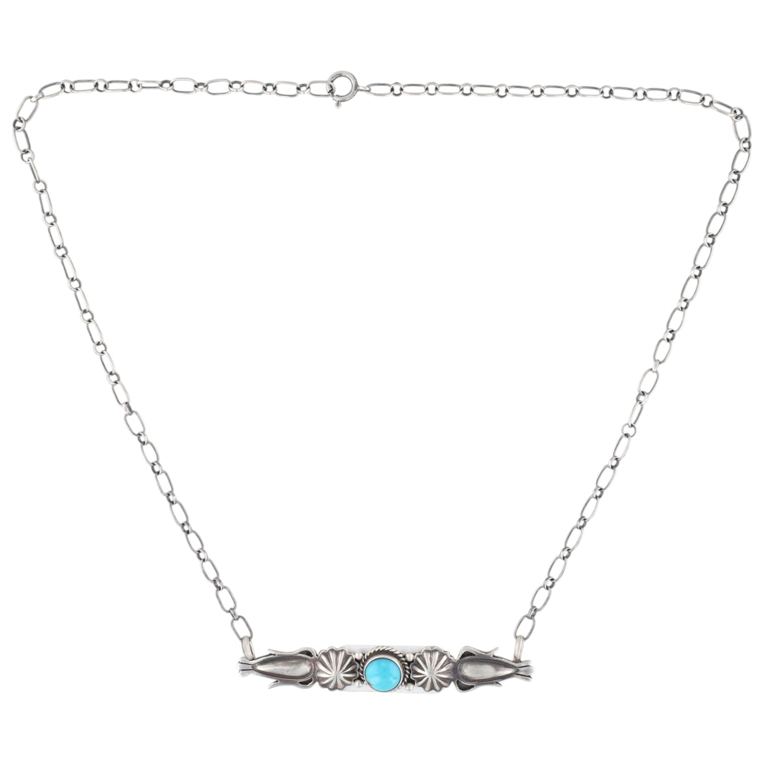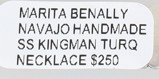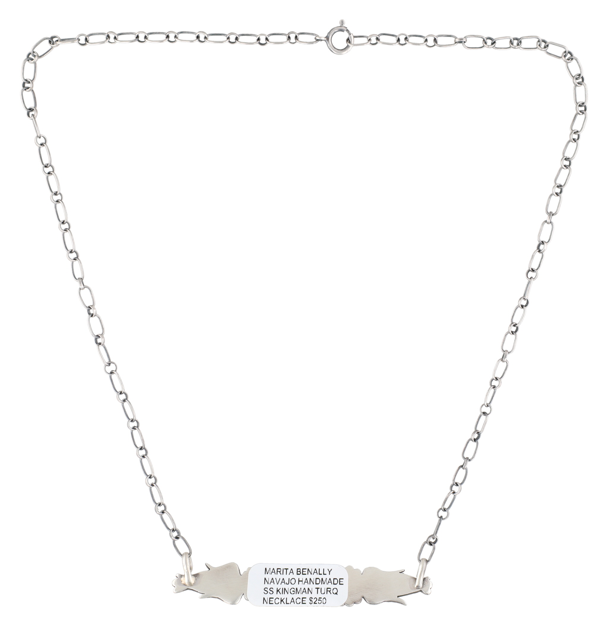 A Navajo sterling silver and turquoise necklace by Marita Benally, comprising a central horizontal bar pendant of Southwestern style, set with a round turquoise cabochon in a bezel, flanked by two sculpted floral or starburst motifs and stylized fluted terminals. The bar is suspended from an oval link chain that secures with a spring ring clasp. The reverse of the central bar features a Running Bear Shop hallmark. An attached white label is printed with ‘MARITA BENALLY NAVAJO HANDMADE SS KINGMAN TURQ NECKLACE $250’.