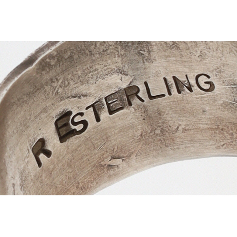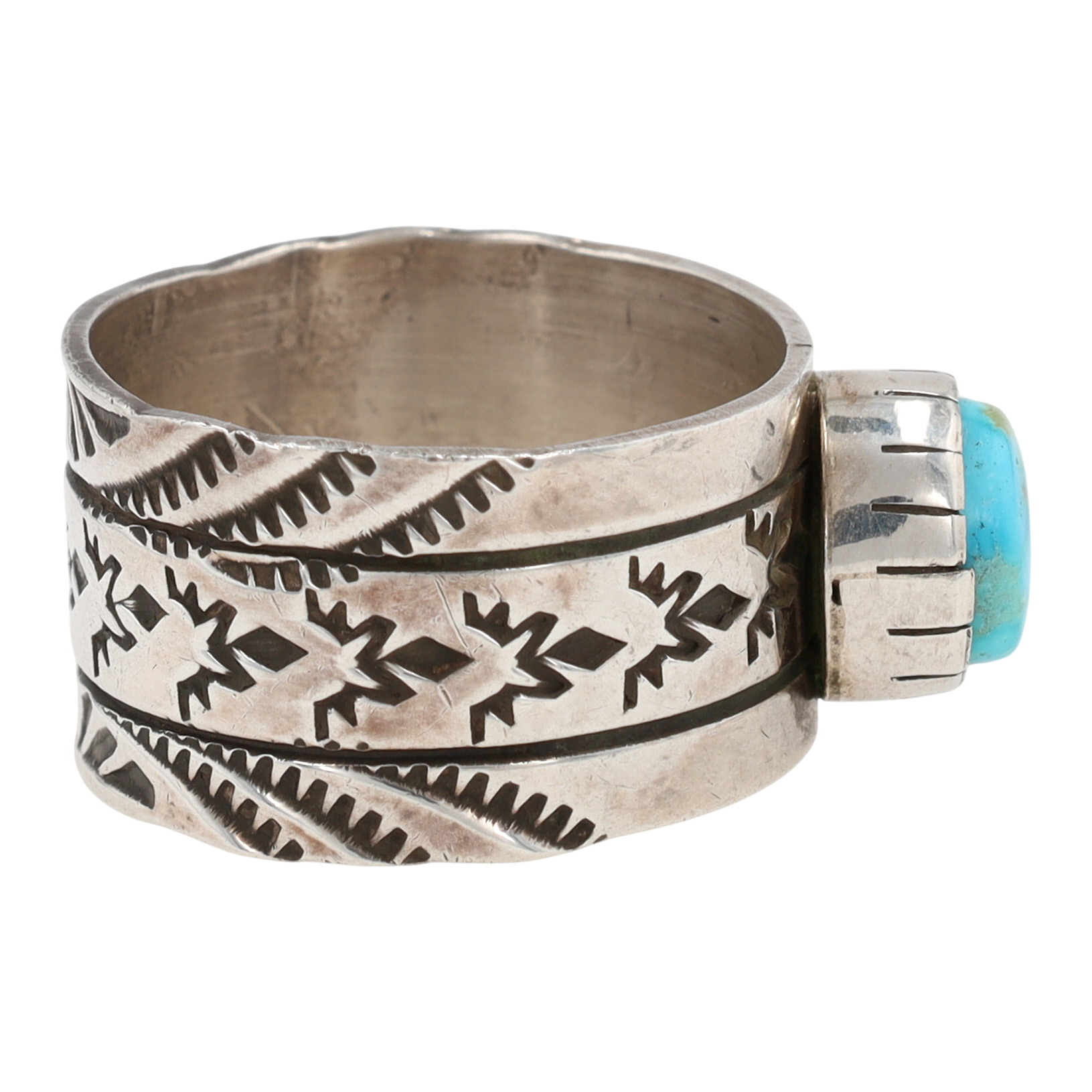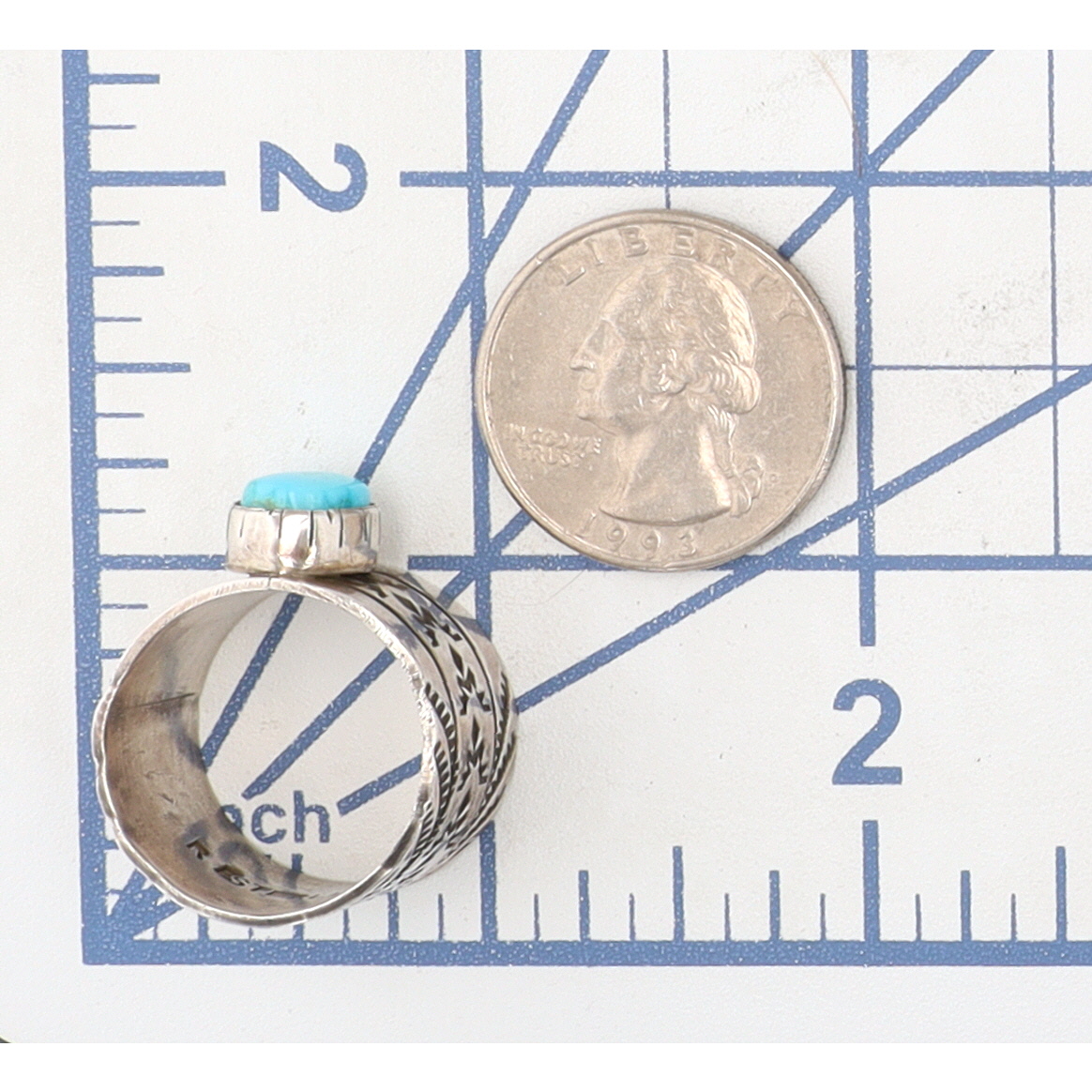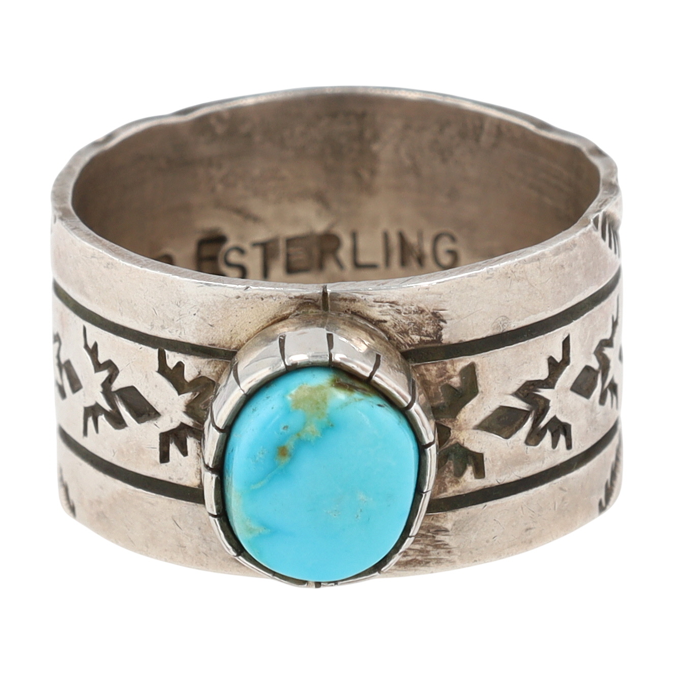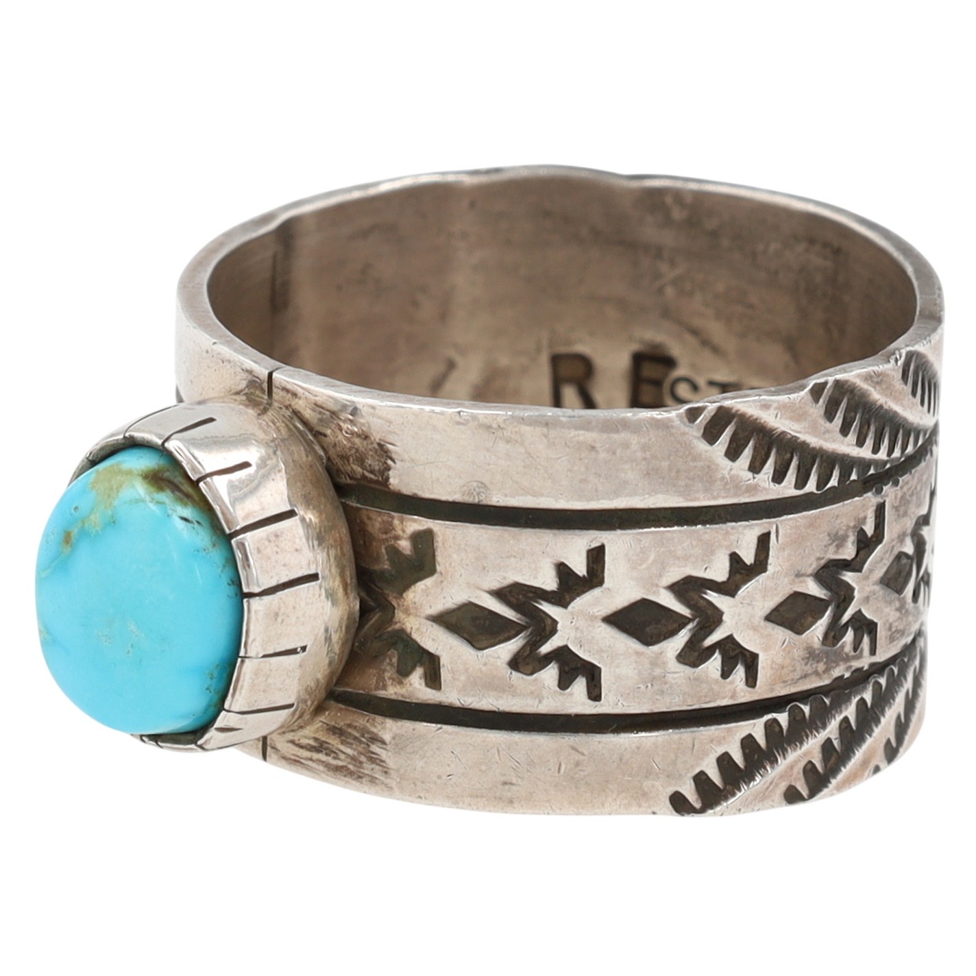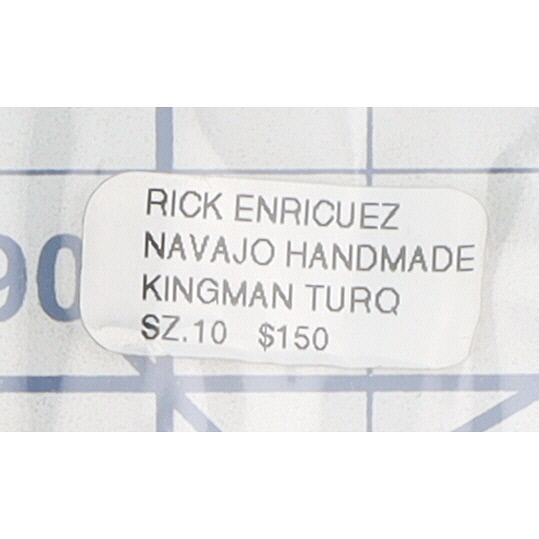 A wide band ring crafted from sterling silver, featuring an oval Kingman turquoise cabochon set in a plain bezel by Navajo artist Rick Enricuez. The exterior band is extensively decorated with geometric stamp work, including patterns resembling stylized crosses and sun rays or feathers. The interior of the band is stamped "RE STERLING". A separate label identifies the item as "RICK ENRICUEZ NAVAJO HANDMADE KINGMAN TURQ SZ.10".