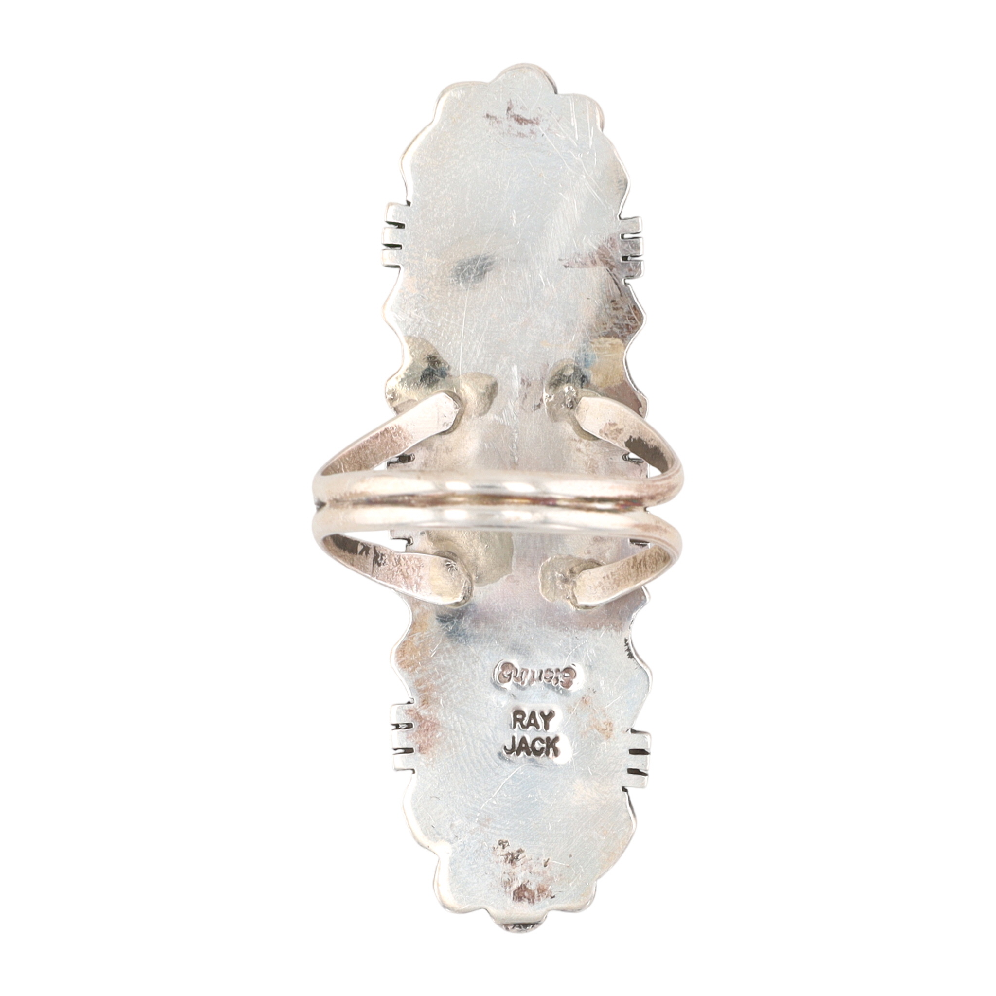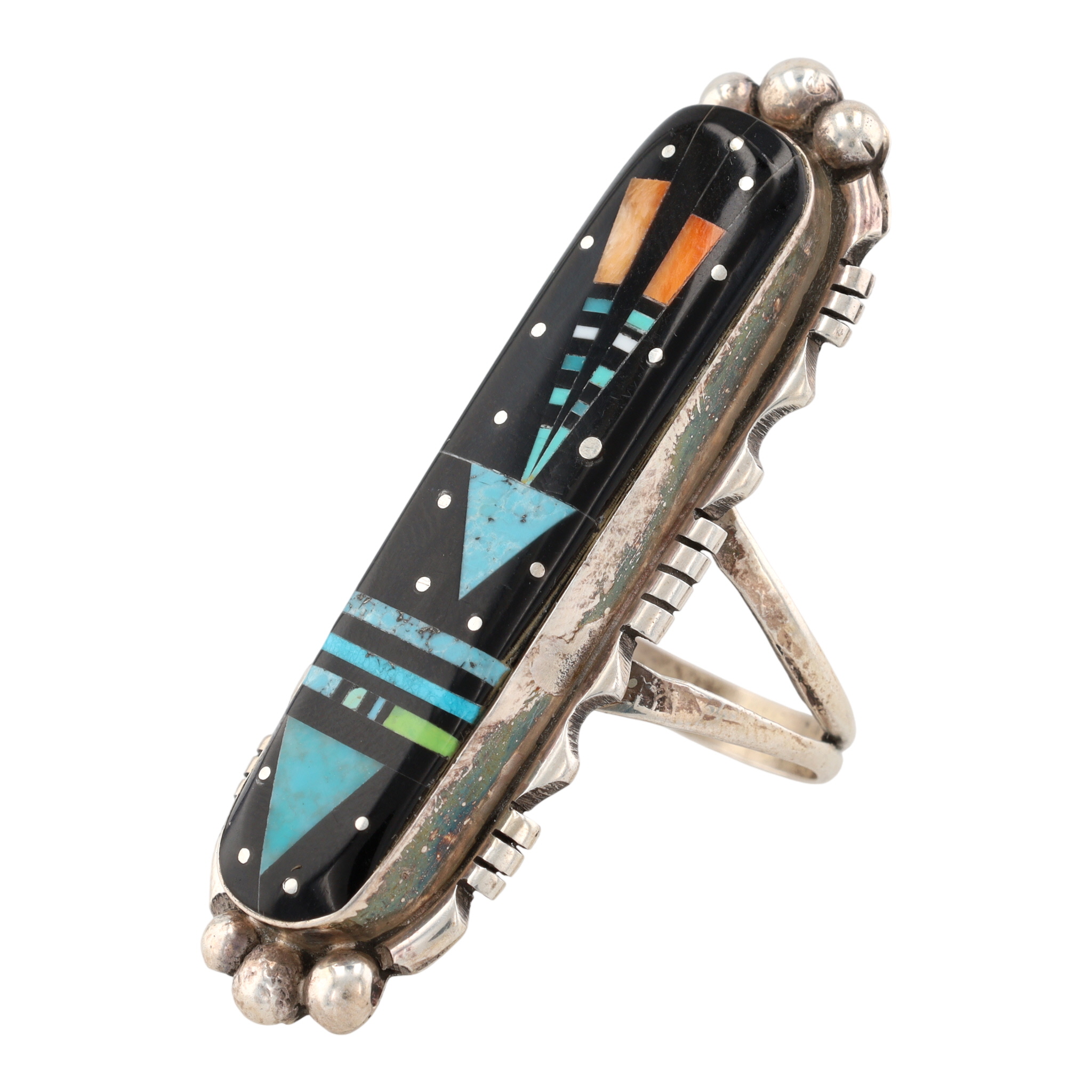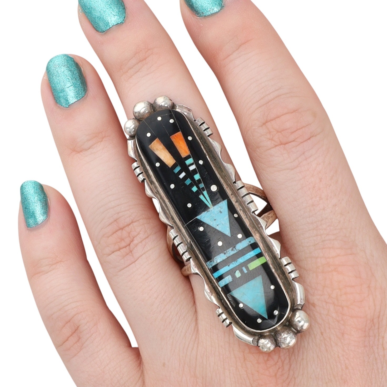 A Navajo Ray Jack sterling silver elongated finger ring featuring a prominent long, rectangular face with an intricate inlay design set against an onyx background. Geometric shapes in various stones of coral, turquoise, mother of pearl, onyx, spiny oyster are inlaid, interspersed with small white dot details. The silver setting includes scalloped ends and ribbed sides, with a double-split shank band. The reverse of the setting is stamped with an unclear maker’s mark above the name "RAY JACK".