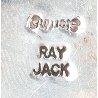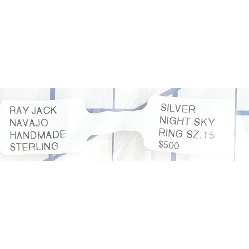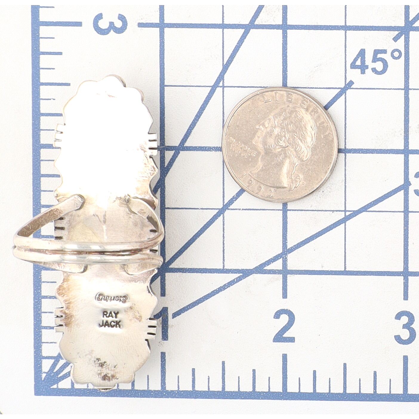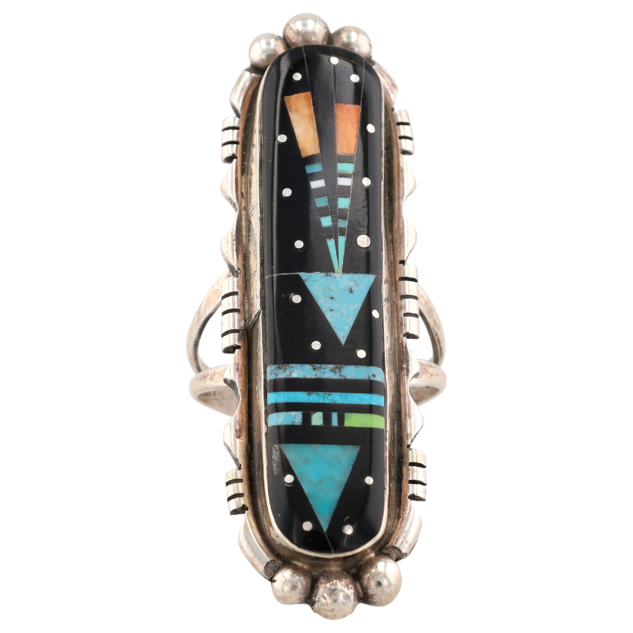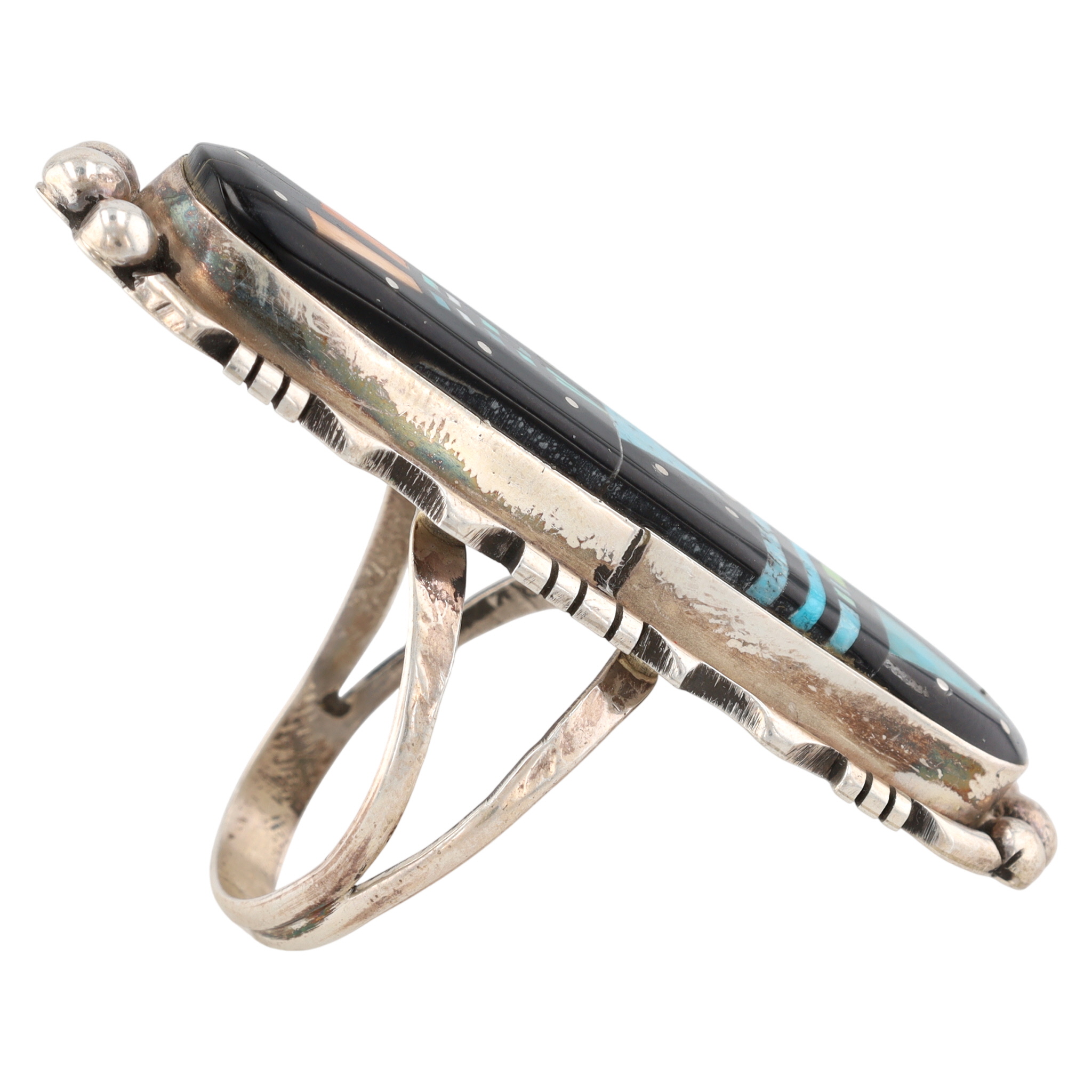 A Navajo Ray Jack sterling silver elongated finger ring featuring a prominent long, rectangular face with an intricate inlay design set against an onyx background. Geometric shapes in various stones of coral, turquoise, mother of pearl, onyx, spiny oyster are inlaid, interspersed with small white dot details. The silver setting includes scalloped ends and ribbed sides, with a double-split shank band. The reverse of the setting is stamped with an unclear maker’s mark above the name "RAY JACK".