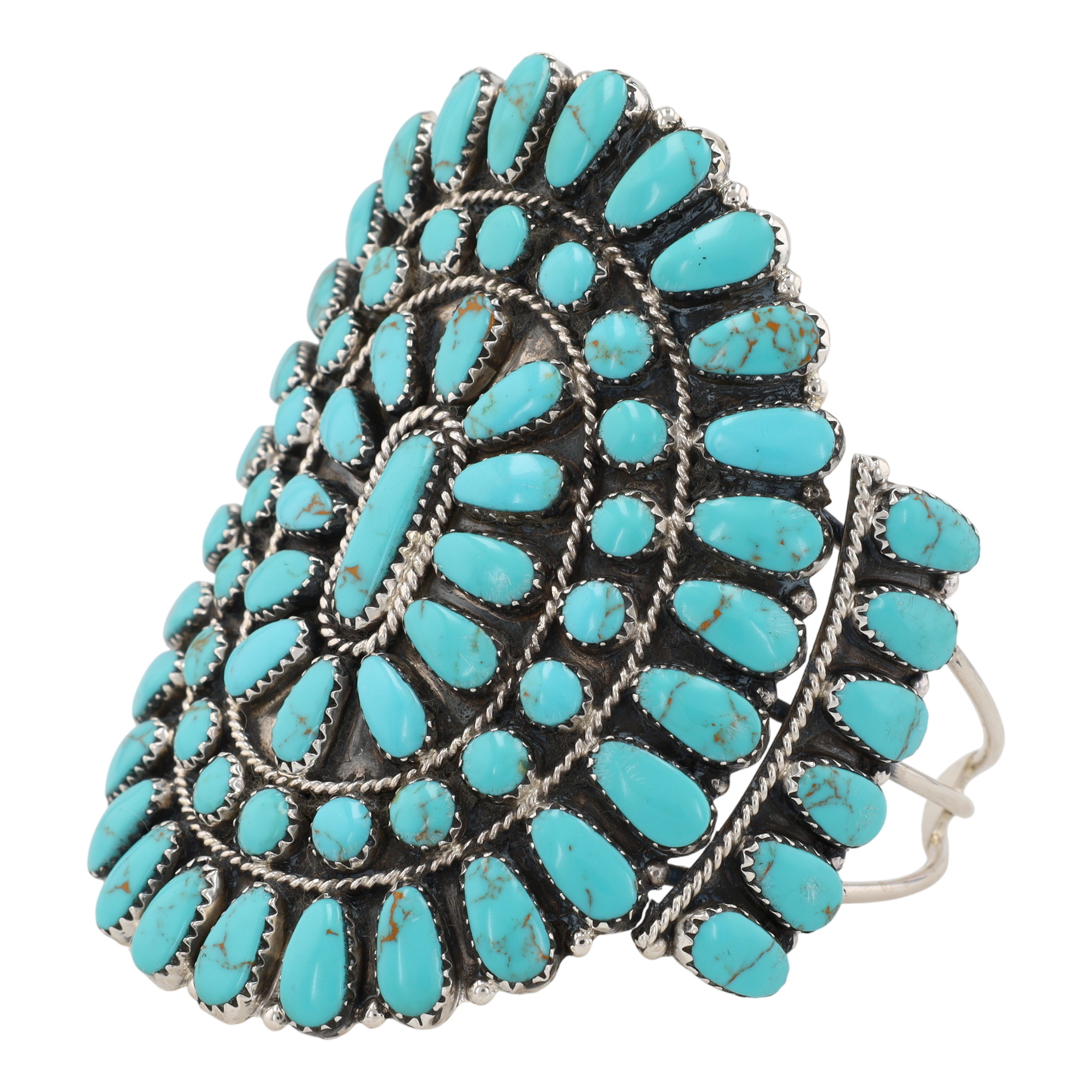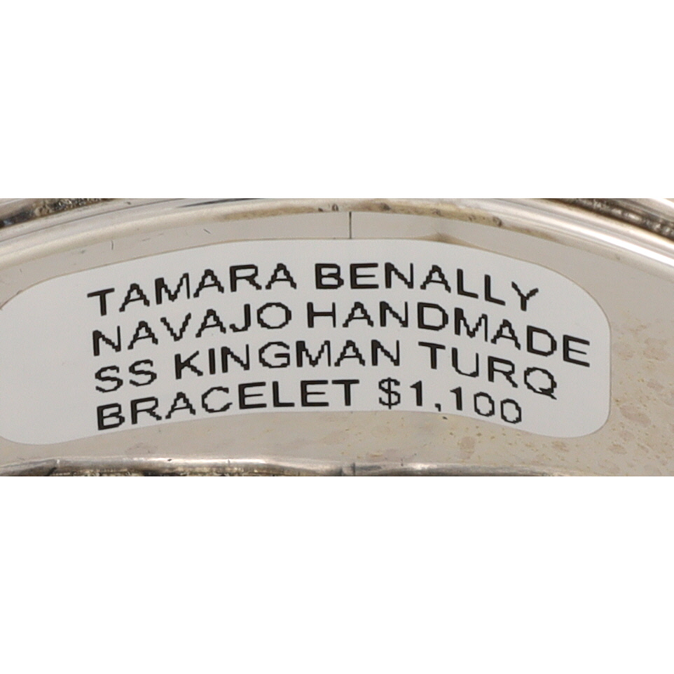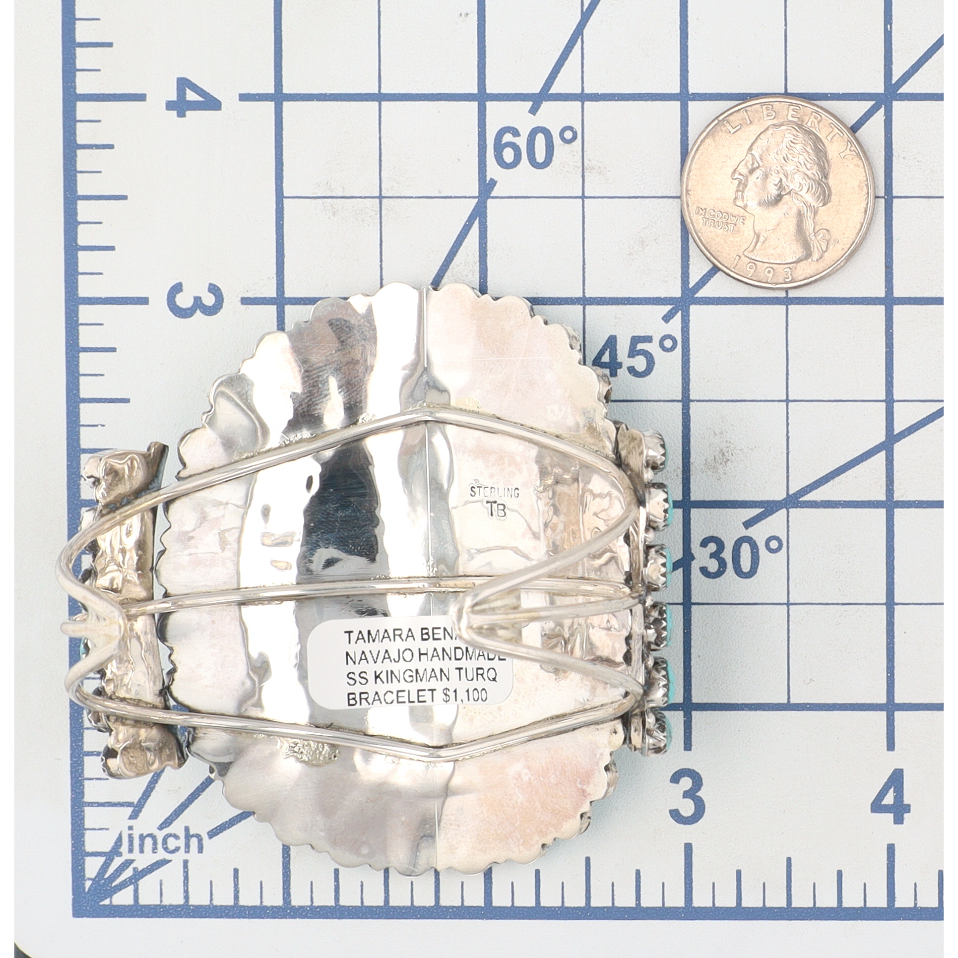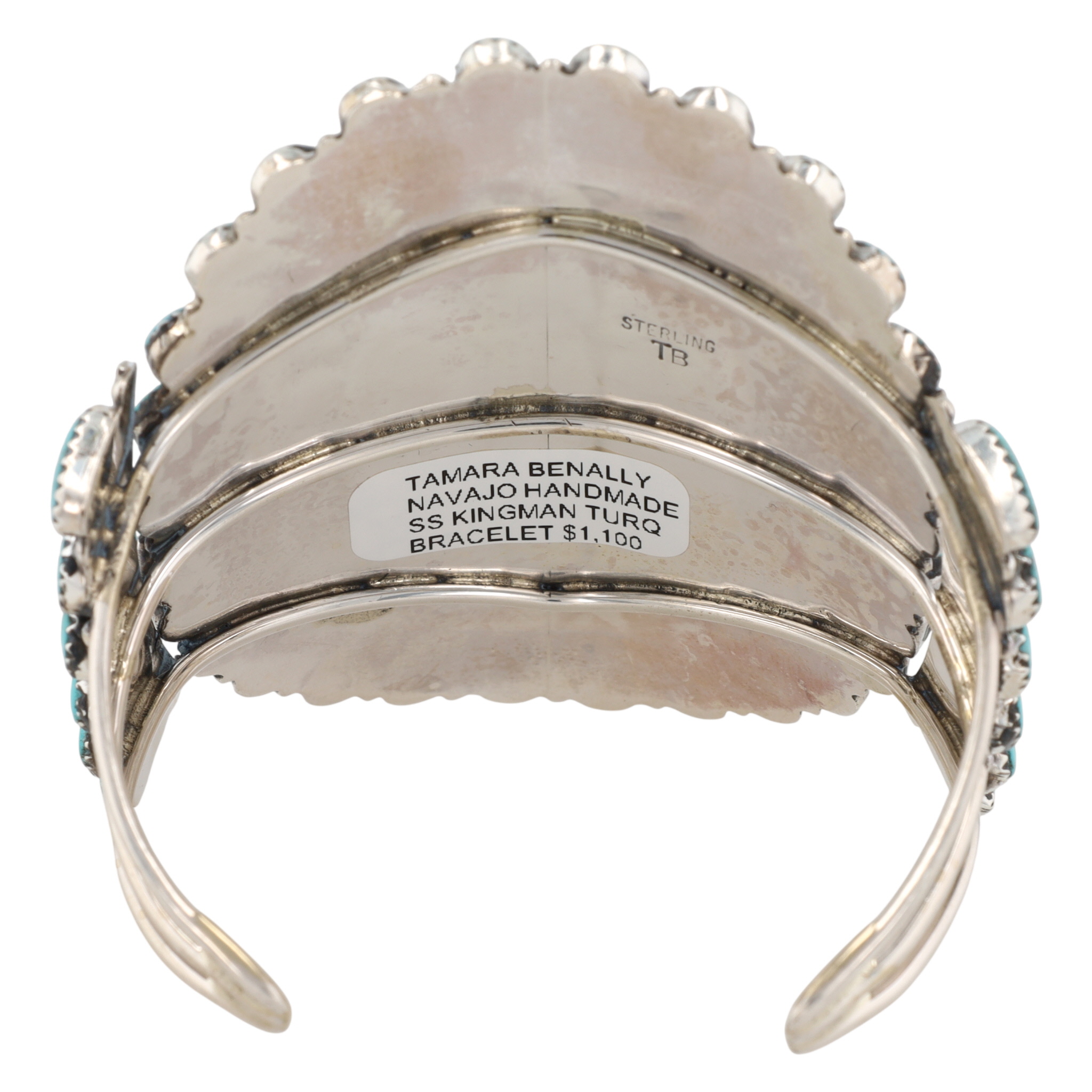 A sterling silver cuff bracelet by Tamara Benally, Navajo. Crafted in a cluster style, featuring numerous bezel-set turquoise cabochons, primarily teardrop-shaped with some circular accents, arranged concentrically and bordered by twisted wire details. The interior is stamped with "STERLING" and the maker’s mark "TB". A removable sticker identifies it as "TAMARA BENALLY NAVAJO HANDMADE SS KINGMAN TURQ BRACELET".