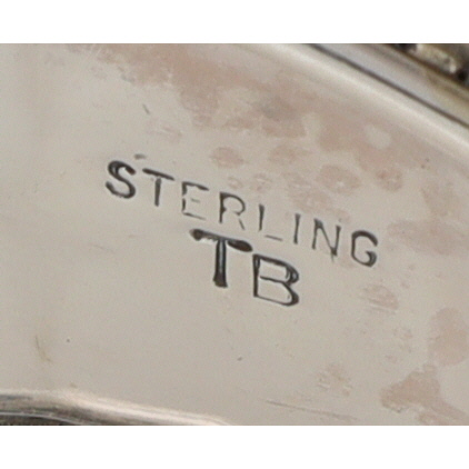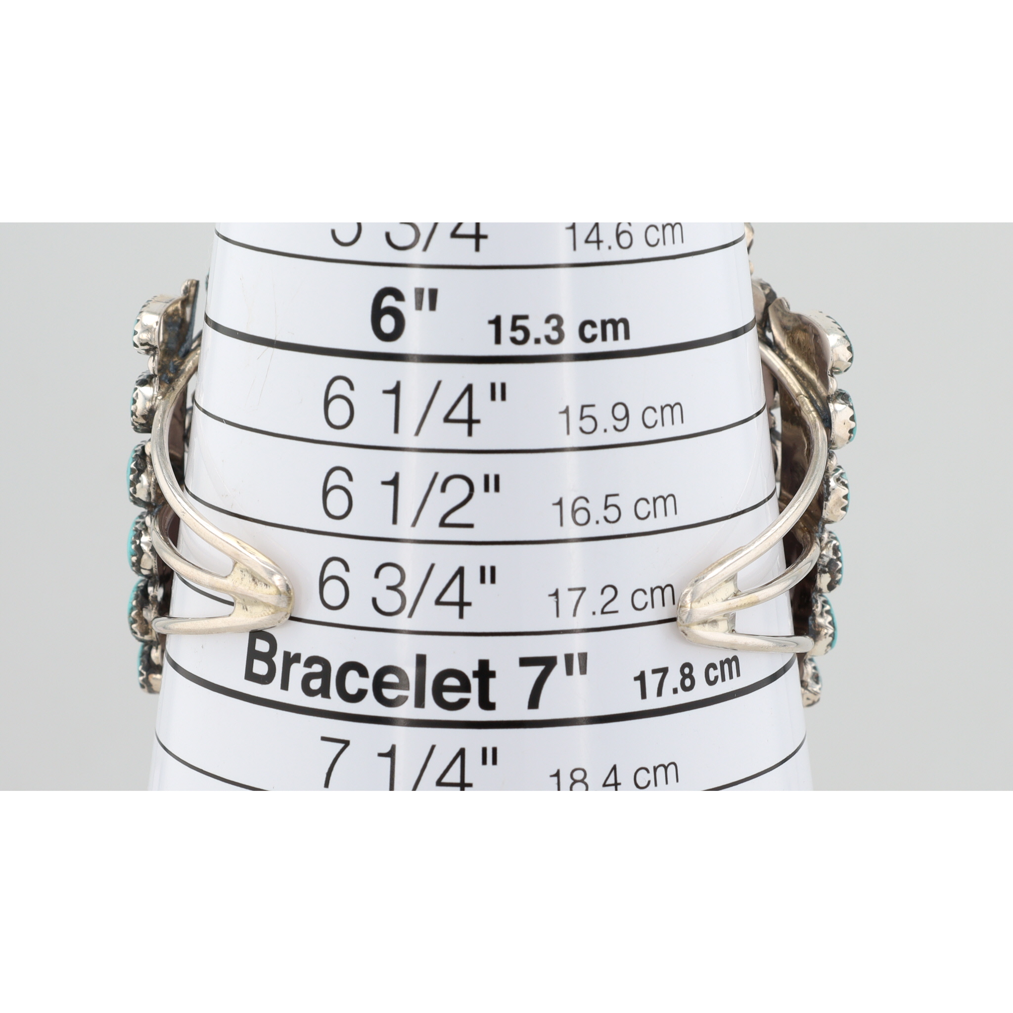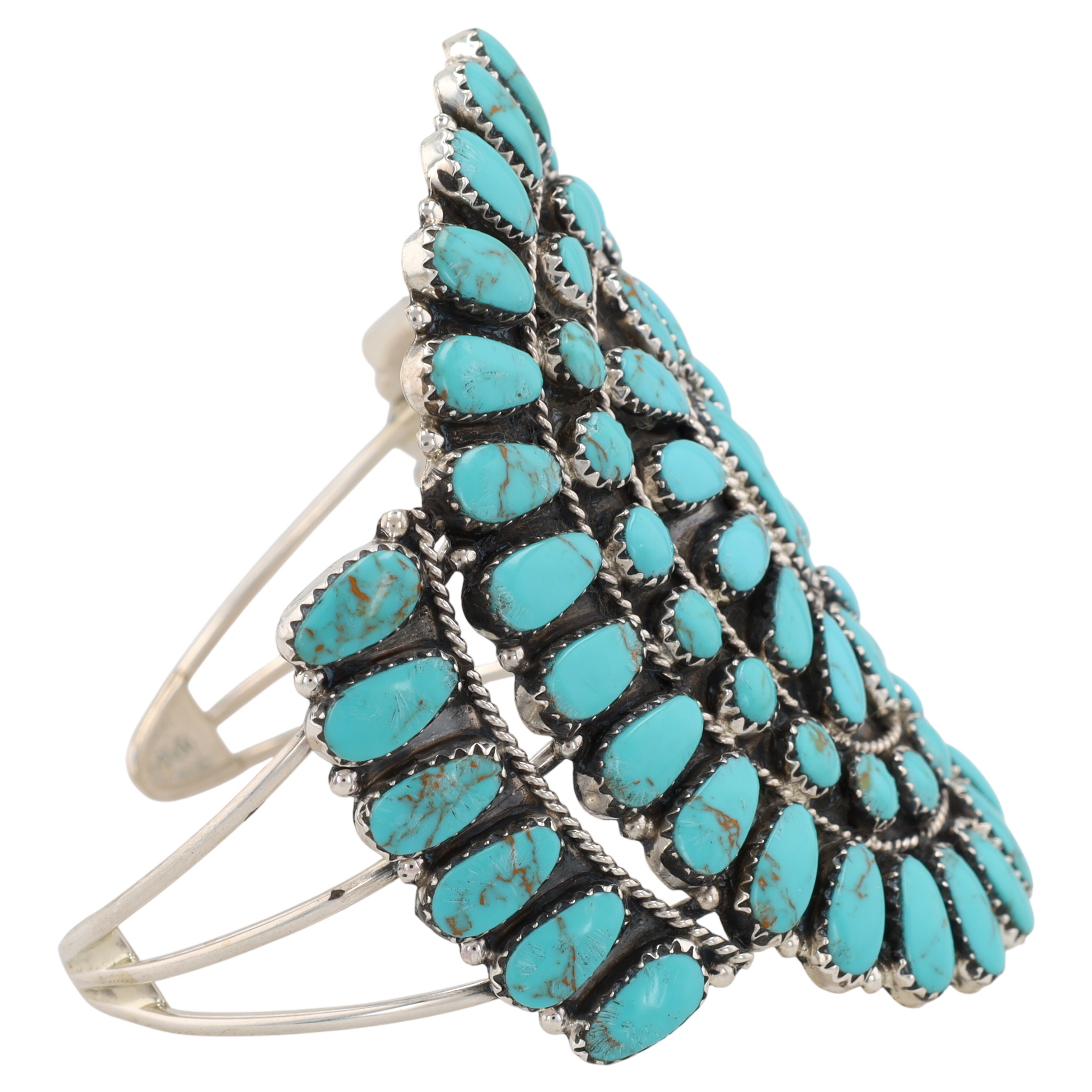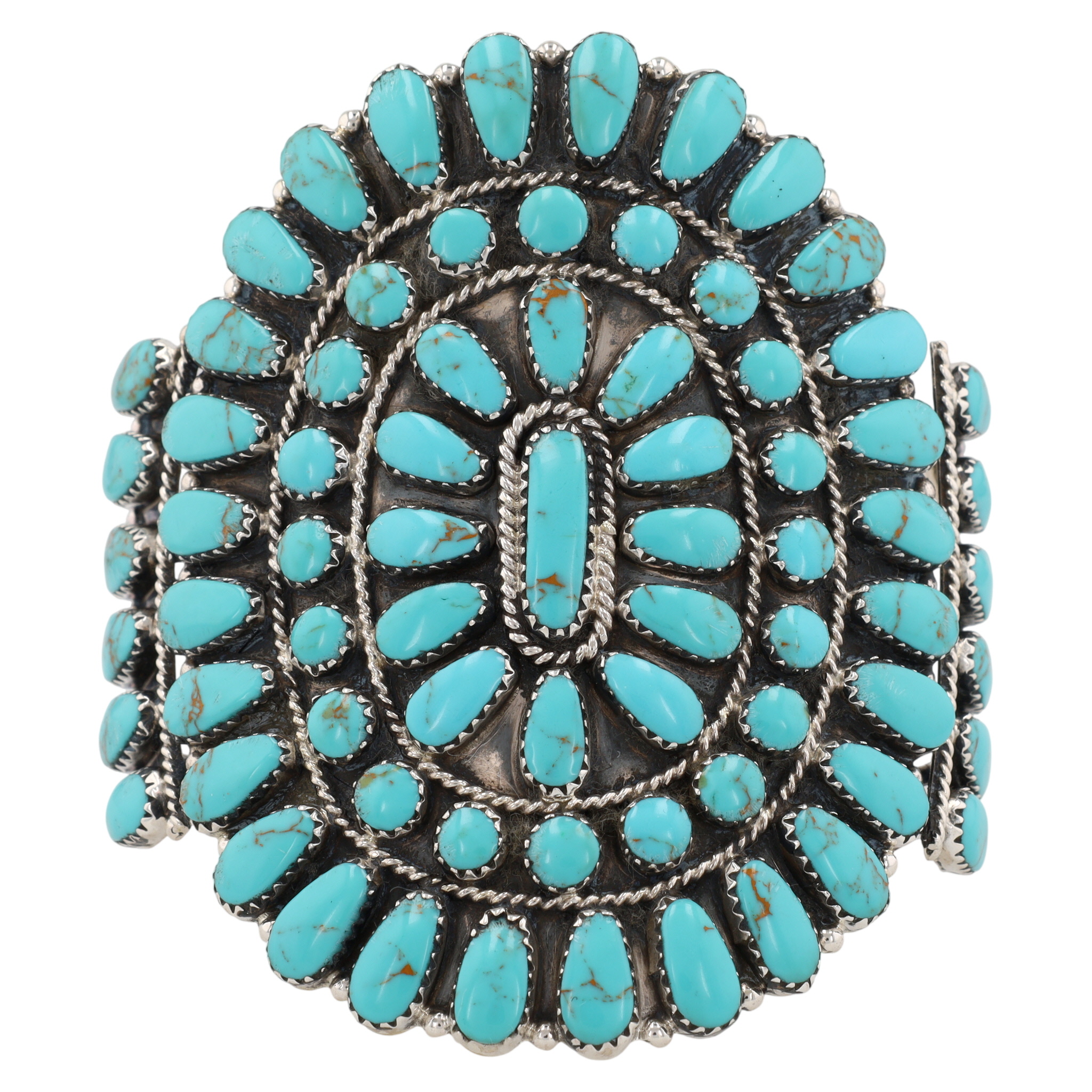 A sterling silver cuff bracelet by Tamara Benally, Navajo. Crafted in a cluster style, featuring numerous bezel-set turquoise cabochons, primarily teardrop-shaped with some circular accents, arranged concentrically and bordered by twisted wire details. The interior is stamped with "STERLING" and the maker’s mark "TB". A removable sticker identifies it as "TAMARA BENALLY NAVAJO HANDMADE SS KINGMAN TURQ BRACELET".