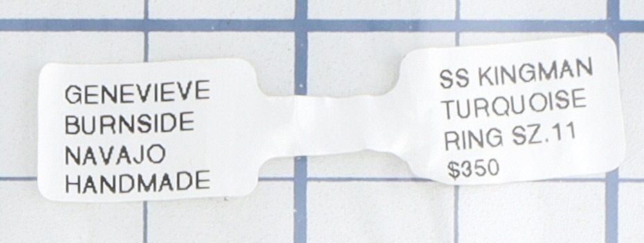 A Navajo Kingman turquoise and sterling silver ring. This handmade ring features a large, oval, cabochon-cut Kingman turquoise stone with vivid blue-green color and prominent brown matrix. The stone is bezel-set and framed by a twisted rope border, while the ring’s shoulders are adorned with stylized, fluted elements and small spherical accents. An accompanying tag identifies the piece as "HANDMADE" by "GENEVIEVE BURNSIDE, NAVAJO, " and specifies "SS KINGMAN TURQUOISE." The ring is marked as "SZ.11" on the tag.