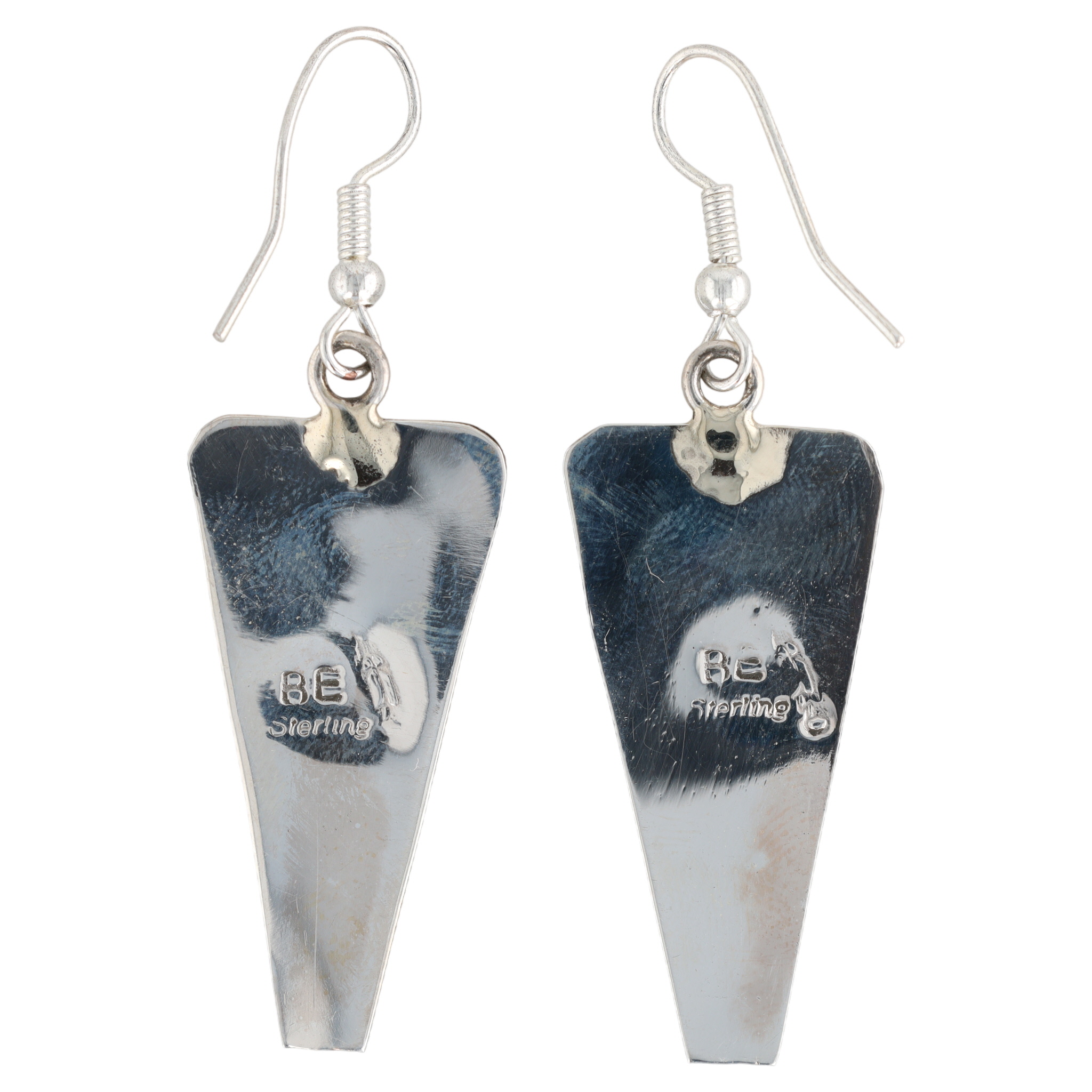 A pair of Navajo Sterling Silver and turquoise inlay triangular dangle earrings by Brandon Etcity. Crafted in a Native American style, each earring features intricate inlay work of segmented blue stone, visually consistent with Kingman turquoise, set within a polished sterling silver frame. The reverse of each earring is stamped with the maker’s mark ‘BE’ and the ‘Sterling’ hallmark.