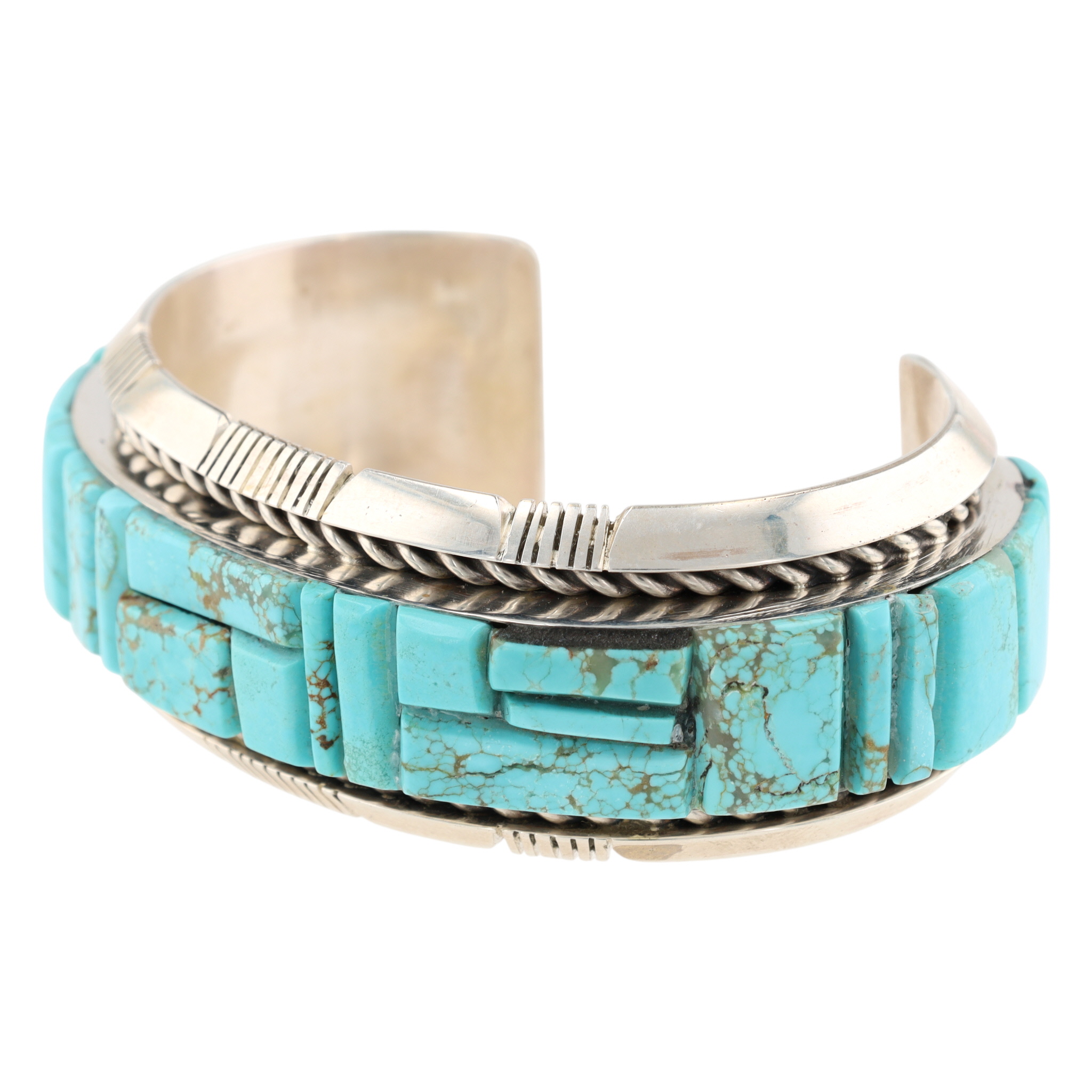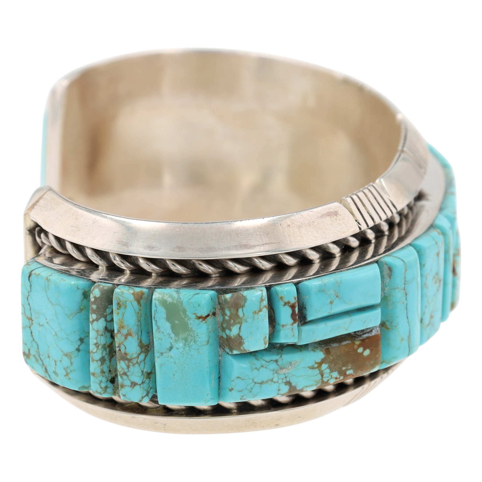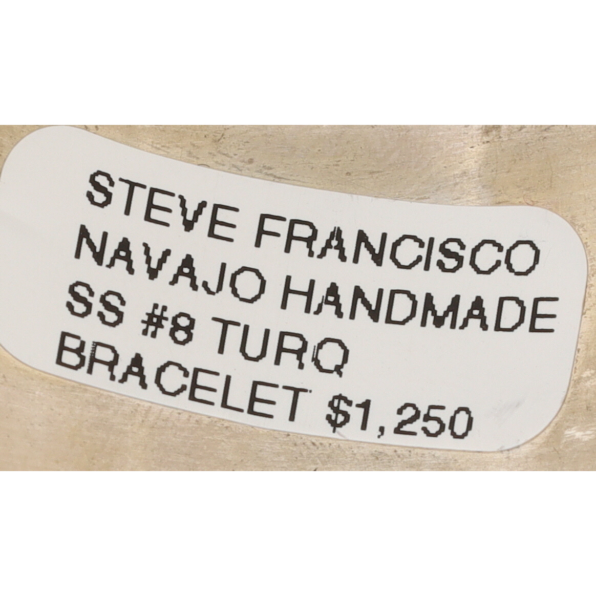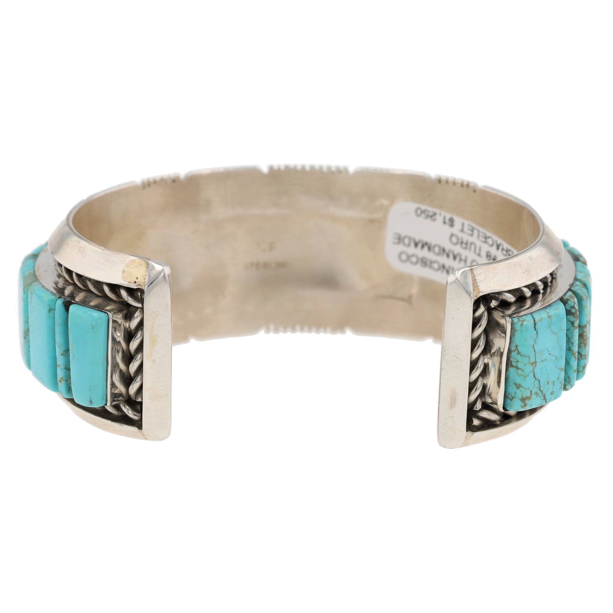 A Navajo Steve Francisco Number 8 turquoise and sterling silver inlay cuff bracelet. This wide cuff bracelet is crafted from sterling silver, featuring a central inlay of numerous turquoise segments. The turquoise pieces, exhibiting natural matrixing, are cut into geometric rectangular and square shapes and arranged in a step-patterned mosaic design that spans the full circumference of the visible exterior. The silverwork includes twisted rope borders flanking the turquoise inlay and stamped linear and geometric patterns on the outer edges of the cuff. The interior of the bracelet is marked with an "SF" maker’s mark and "STERLING" indicating metal purity. A visible retail label on the interior identifies the item as "STEVE FRANCISCO NAVAJO HANDMADE SS #8 TURQ BRACELET $1,250".