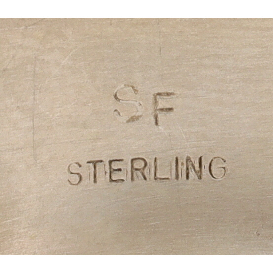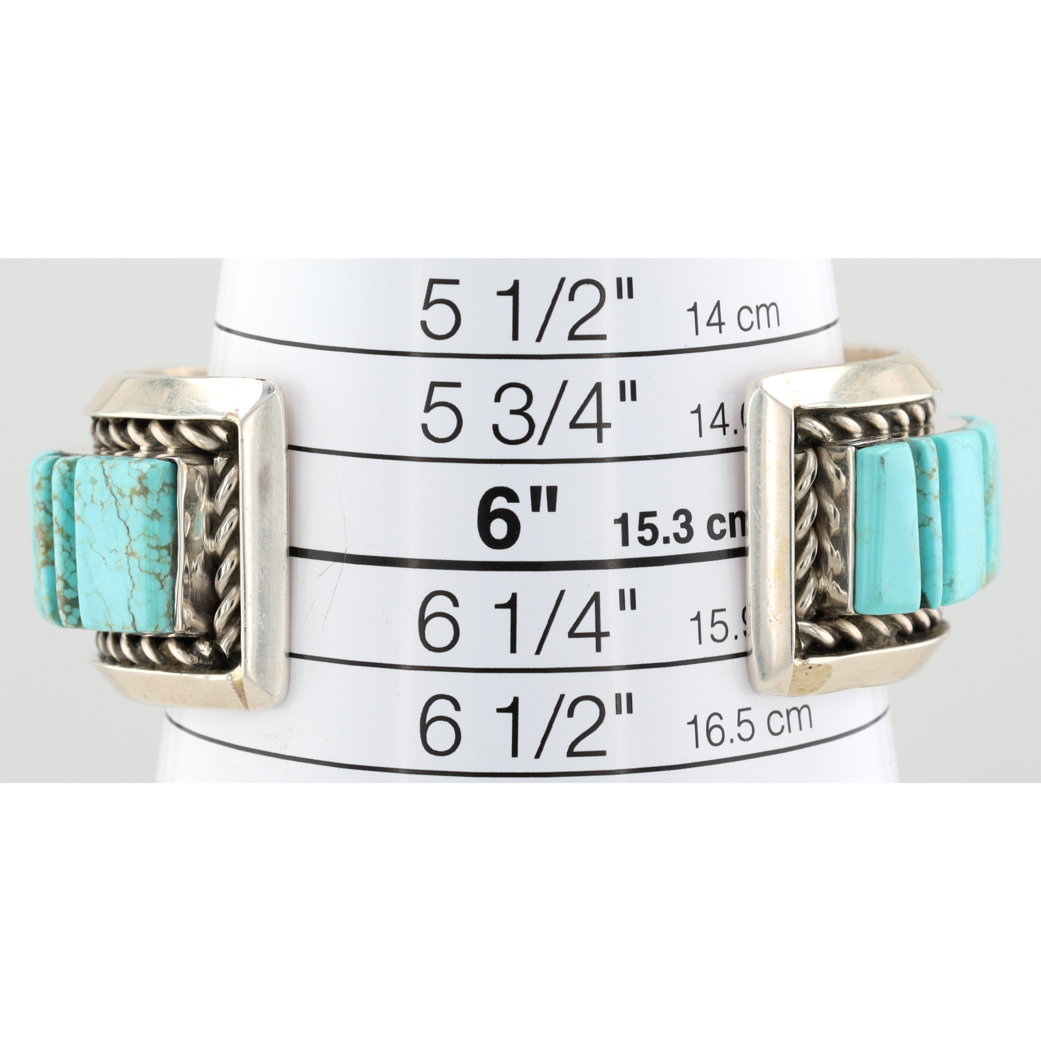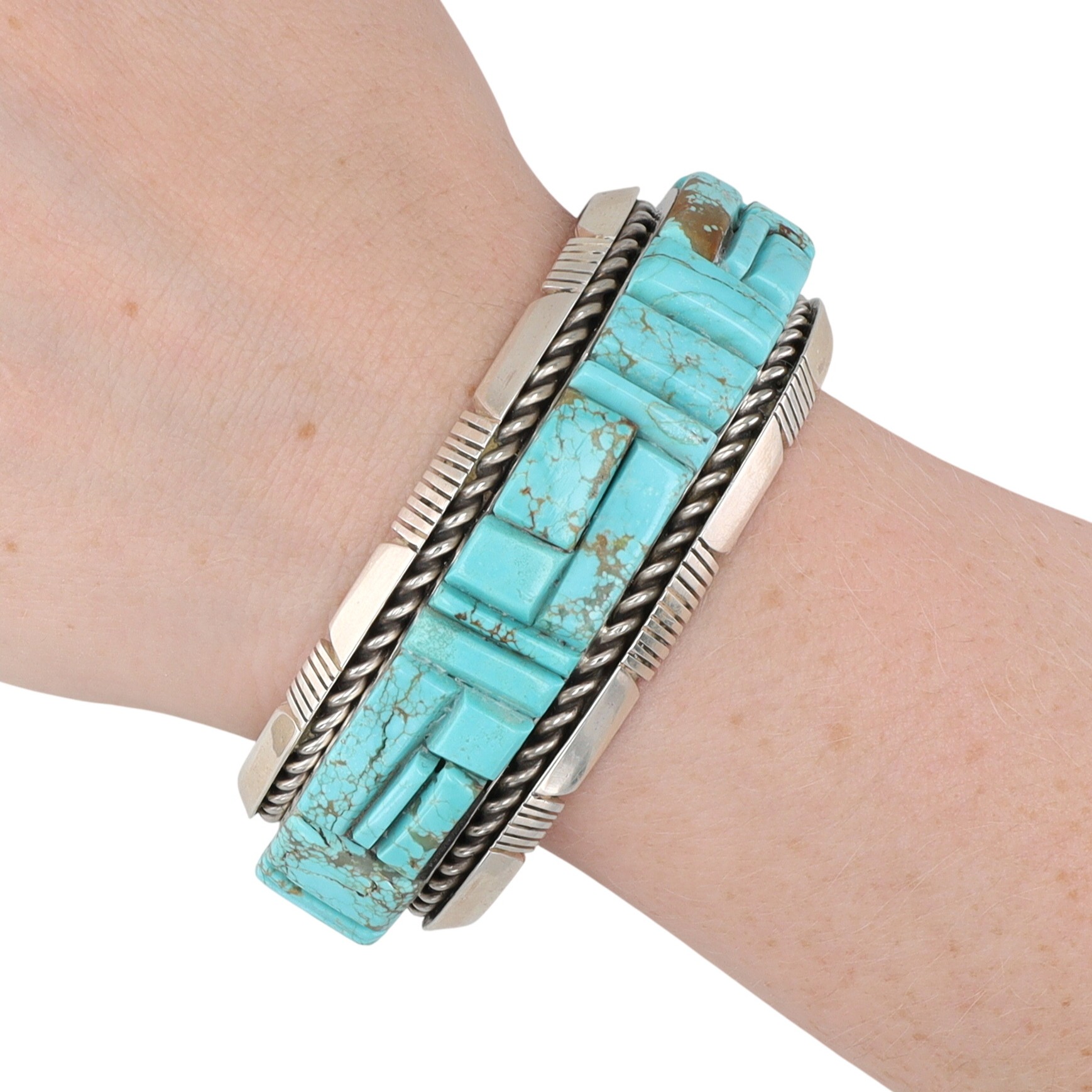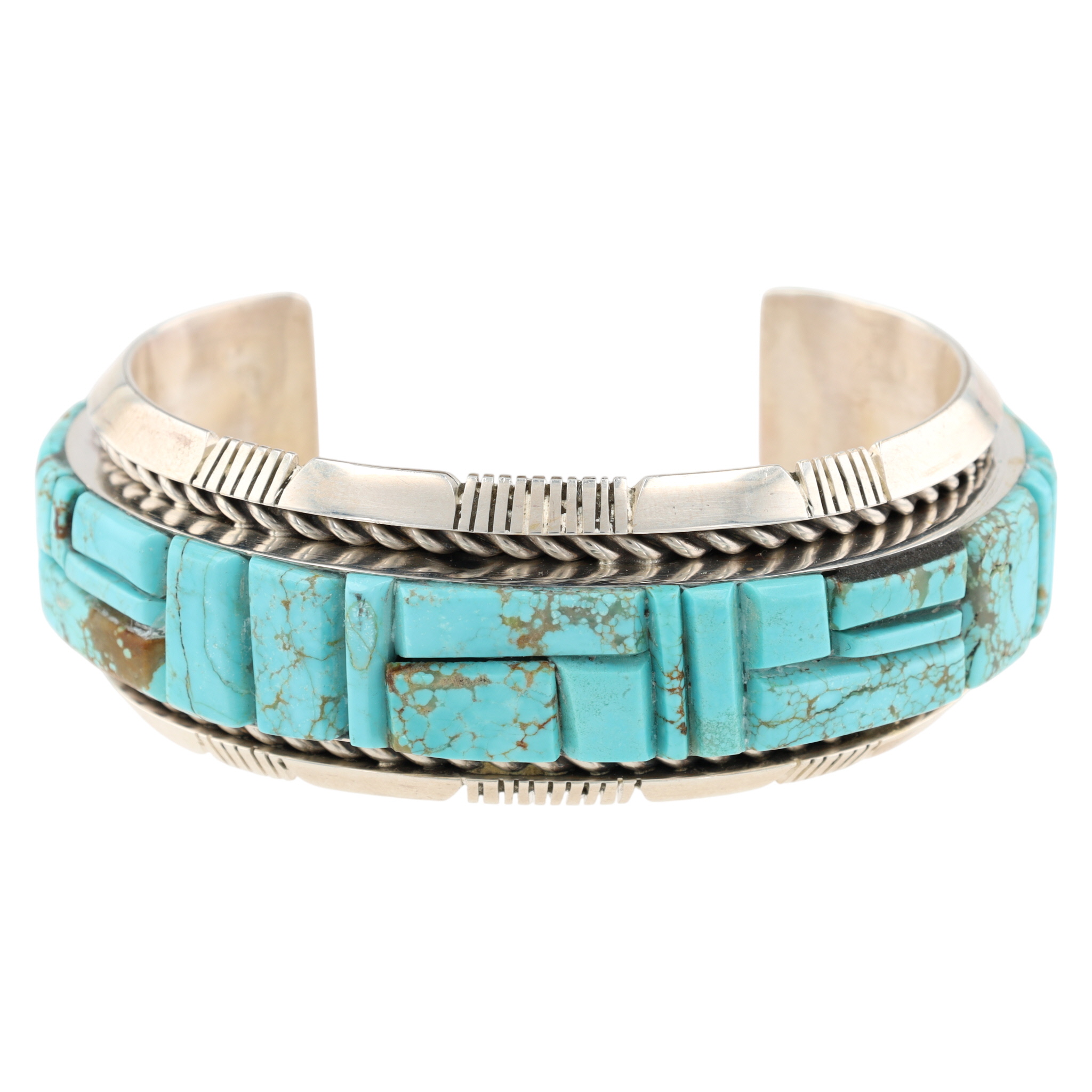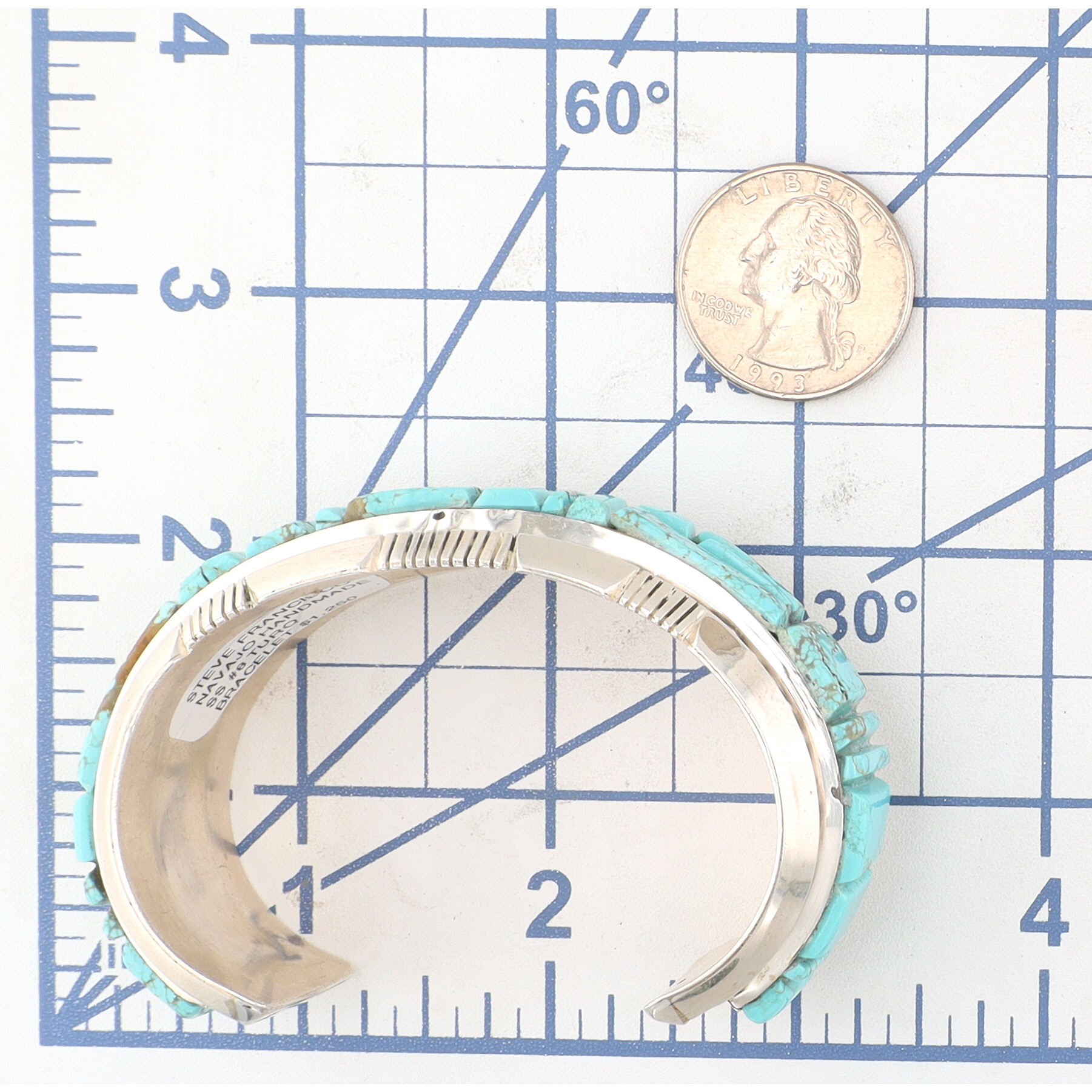 A Navajo Steve Francisco Number 8 turquoise and sterling silver inlay cuff bracelet. This wide cuff bracelet is crafted from sterling silver, featuring a central inlay of numerous turquoise segments. The turquoise pieces, exhibiting natural matrixing, are cut into geometric rectangular and square shapes and arranged in a step-patterned mosaic design that spans the full circumference of the visible exterior. The silverwork includes twisted rope borders flanking the turquoise inlay and stamped linear and geometric patterns on the outer edges of the cuff. The interior of the bracelet is marked with an "SF" maker’s mark and "STERLING" indicating metal purity. A visible retail label on the interior identifies the item as "STEVE FRANCISCO NAVAJO HANDMADE SS #8 TURQ BRACELET $1,250".