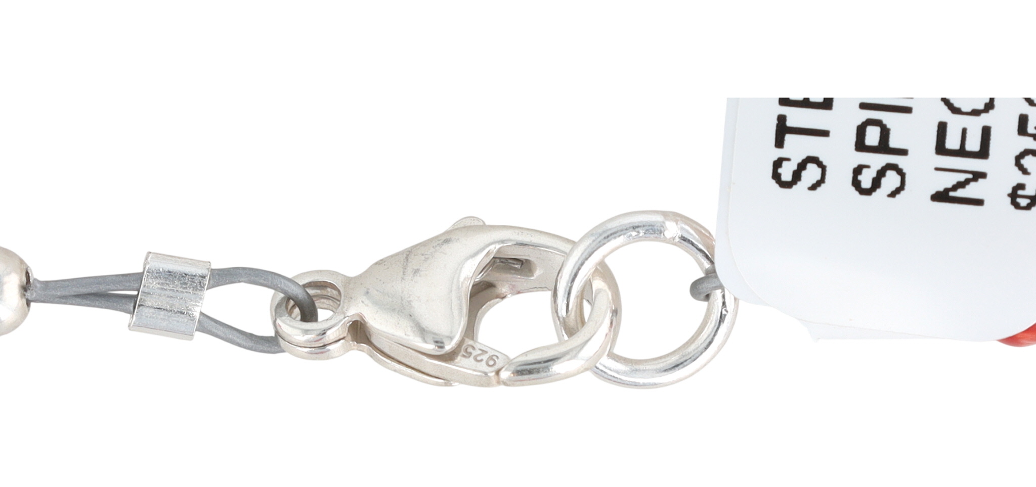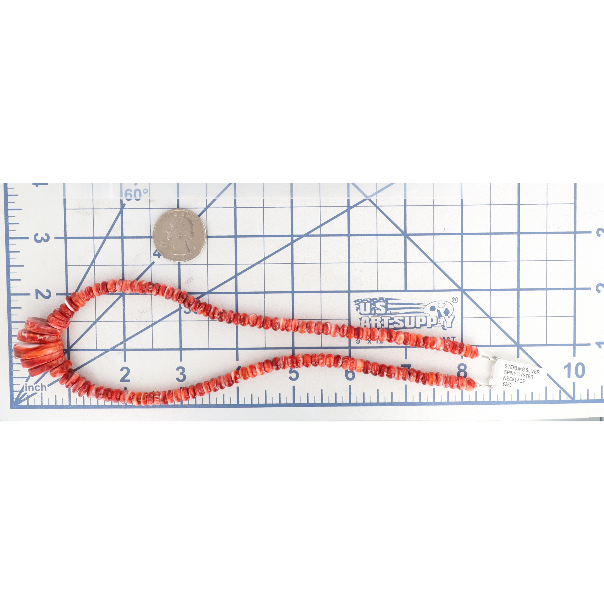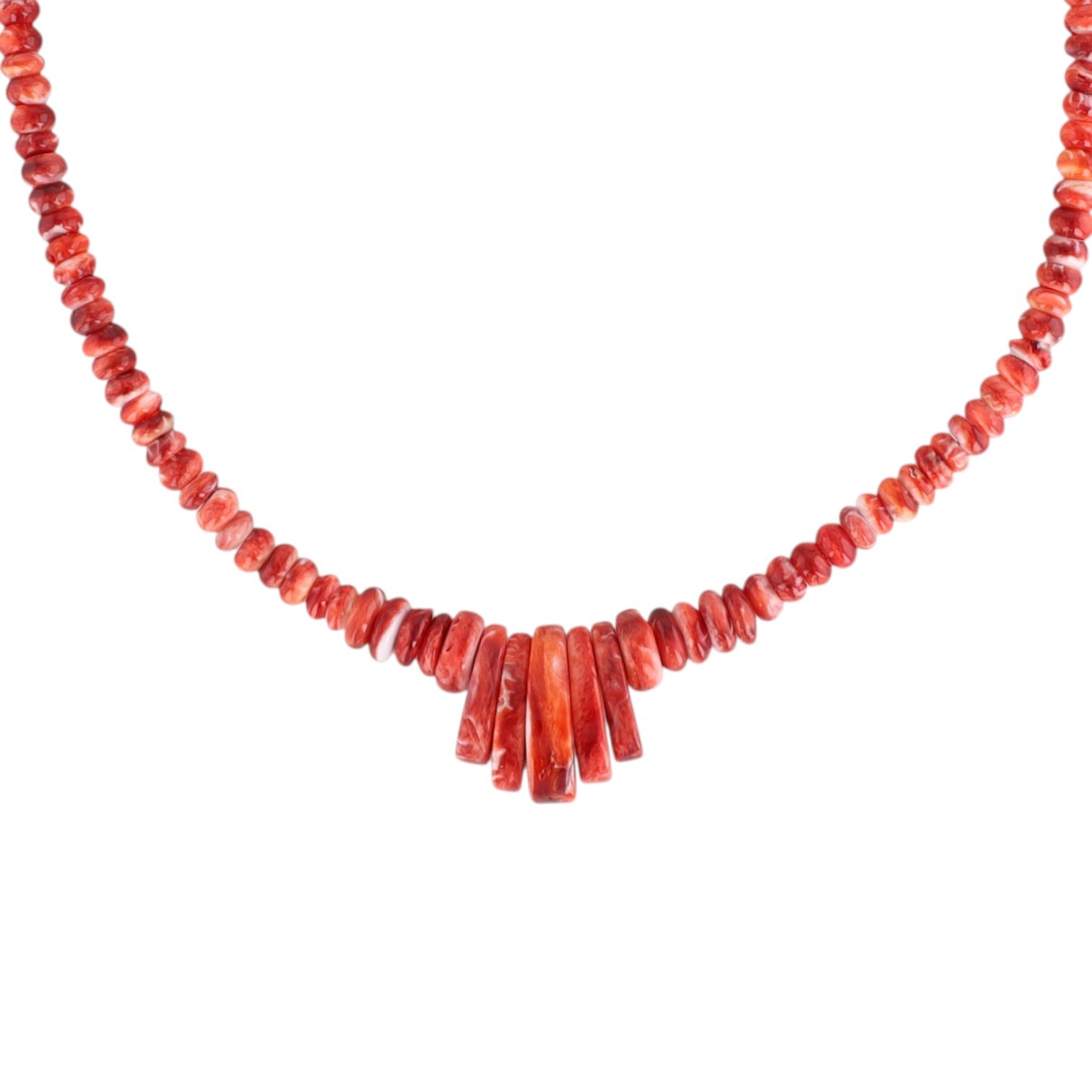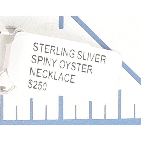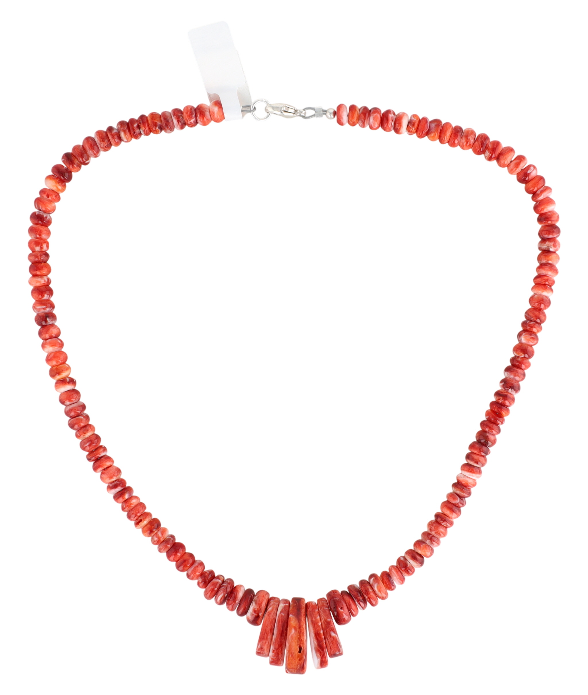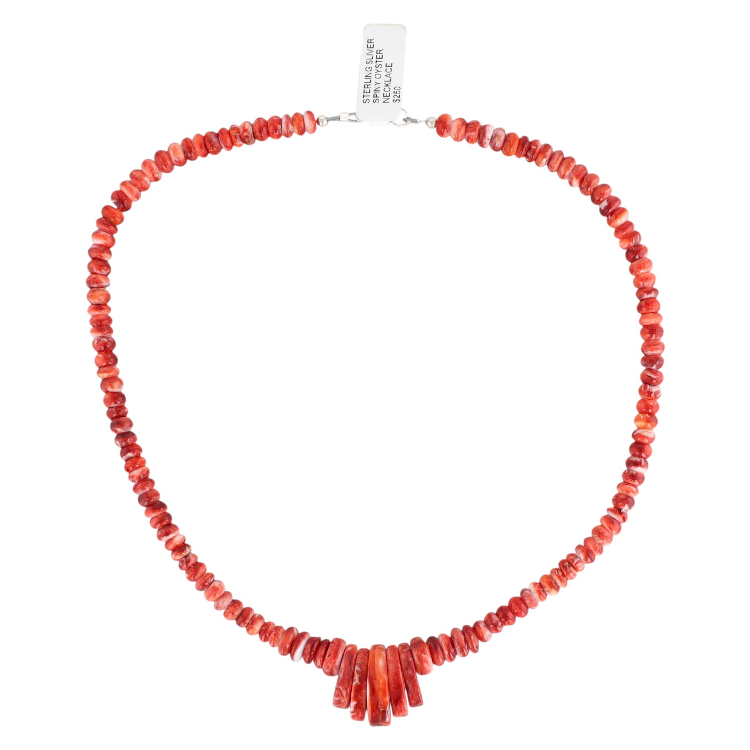 A contemporary Navajo necklace composed of numerous irregular red and white spiny oyster shell beads, graduating in size towards a central fan-shaped drop of larger, elongated shell pieces. The necklace features a sterling silver lobster clasp marked "925". An attached retail tag indicates the material as "STERLING SILVER SPINY OYSTER NECKLACE" and lists a price of "$250".