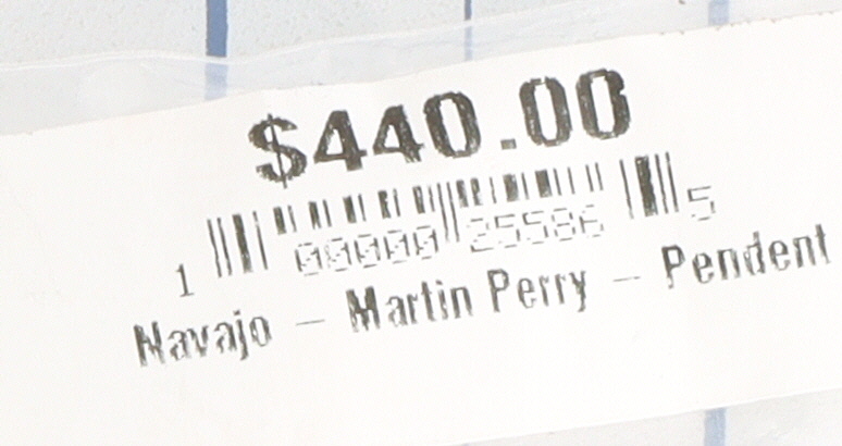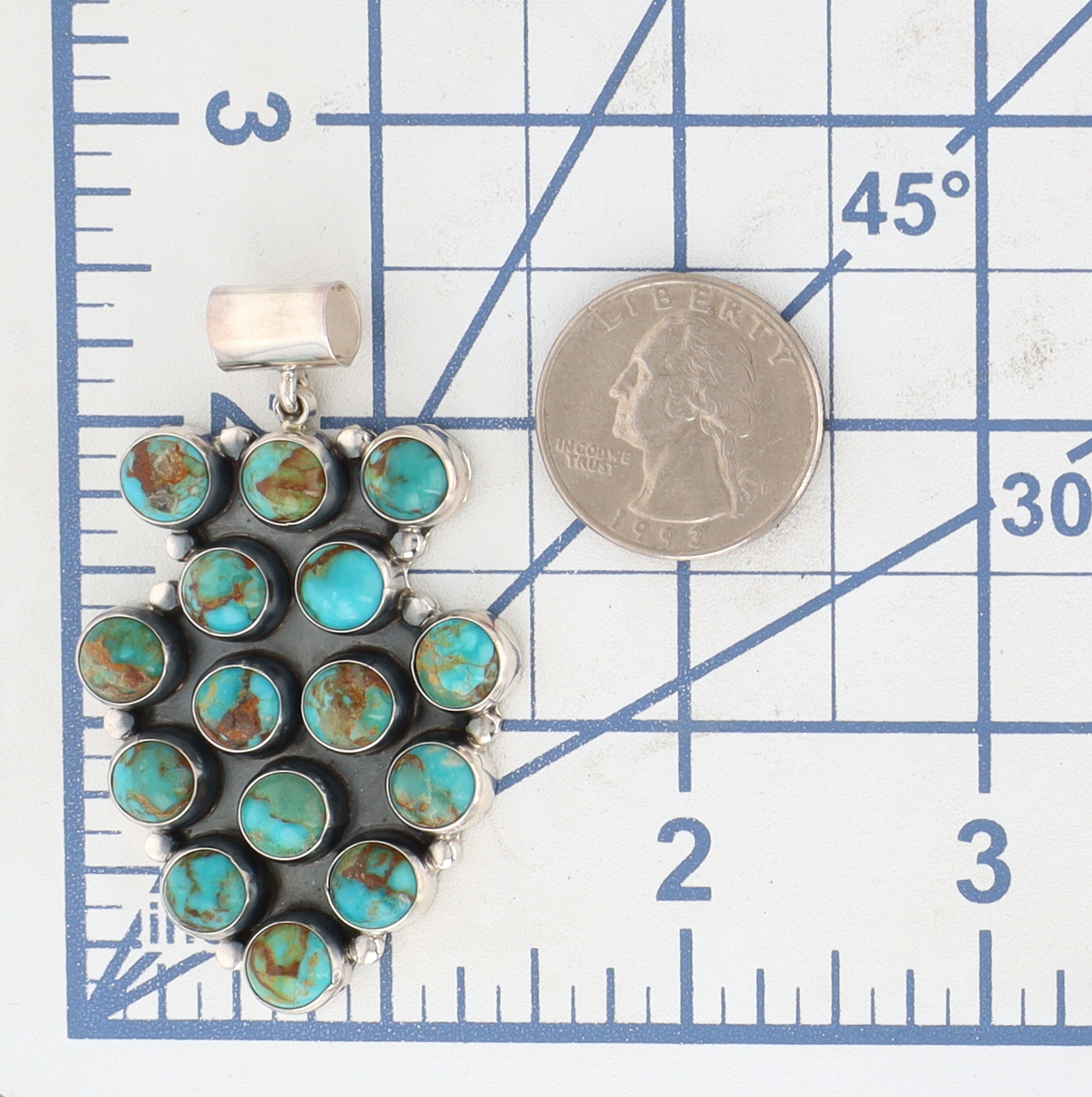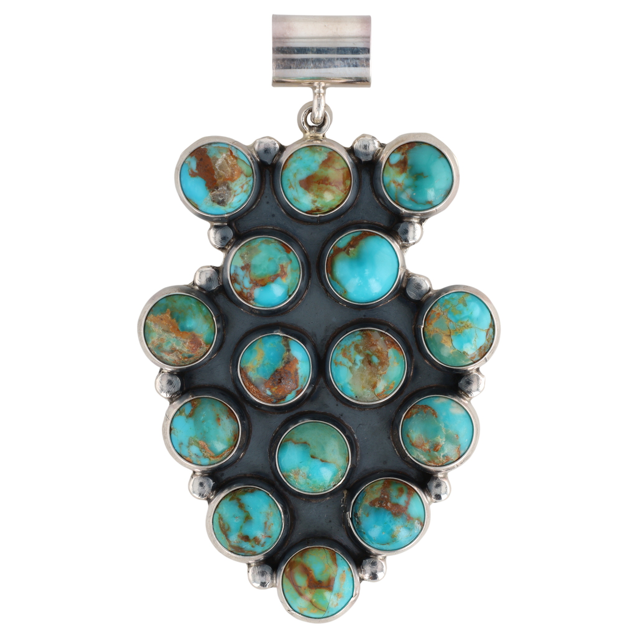 A Navajo Martin Perry sterling silver pendant, featuring an undulating, shield-shaped body adorned with fifteen individual round, bezel-set cabochon stones displaying variegated blue-green hues with brown matrix, consistent with natural turquoise, possibly Royston. The stones are arranged in a cluster design on a darkened silver ground, framed by polished silver accents and spherical embellishments. A polished silver bail, appearing to incorporate a layered or striated material, is attached at the top. The reverse is smooth, polished silver, clearly stamped with a hallmark depicting a log cabin motif encompassing the text ‘DINE’, ‘MC Perry’, and ‘STERLING’.