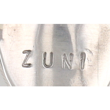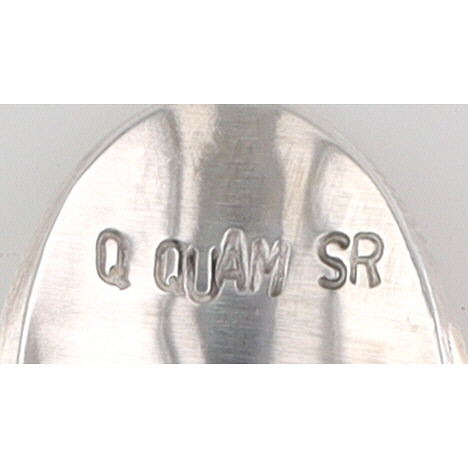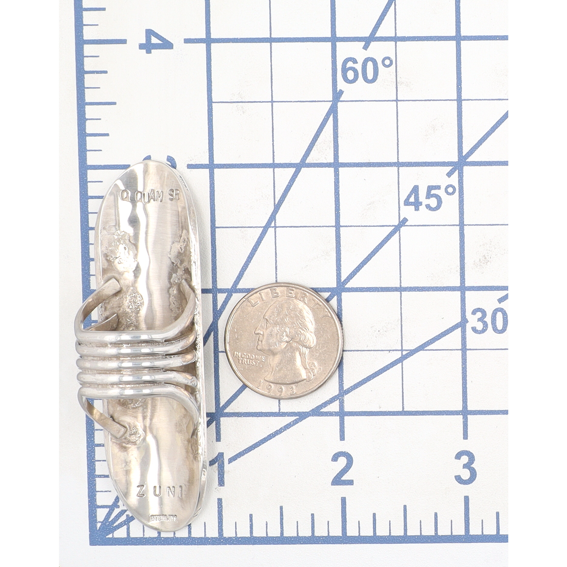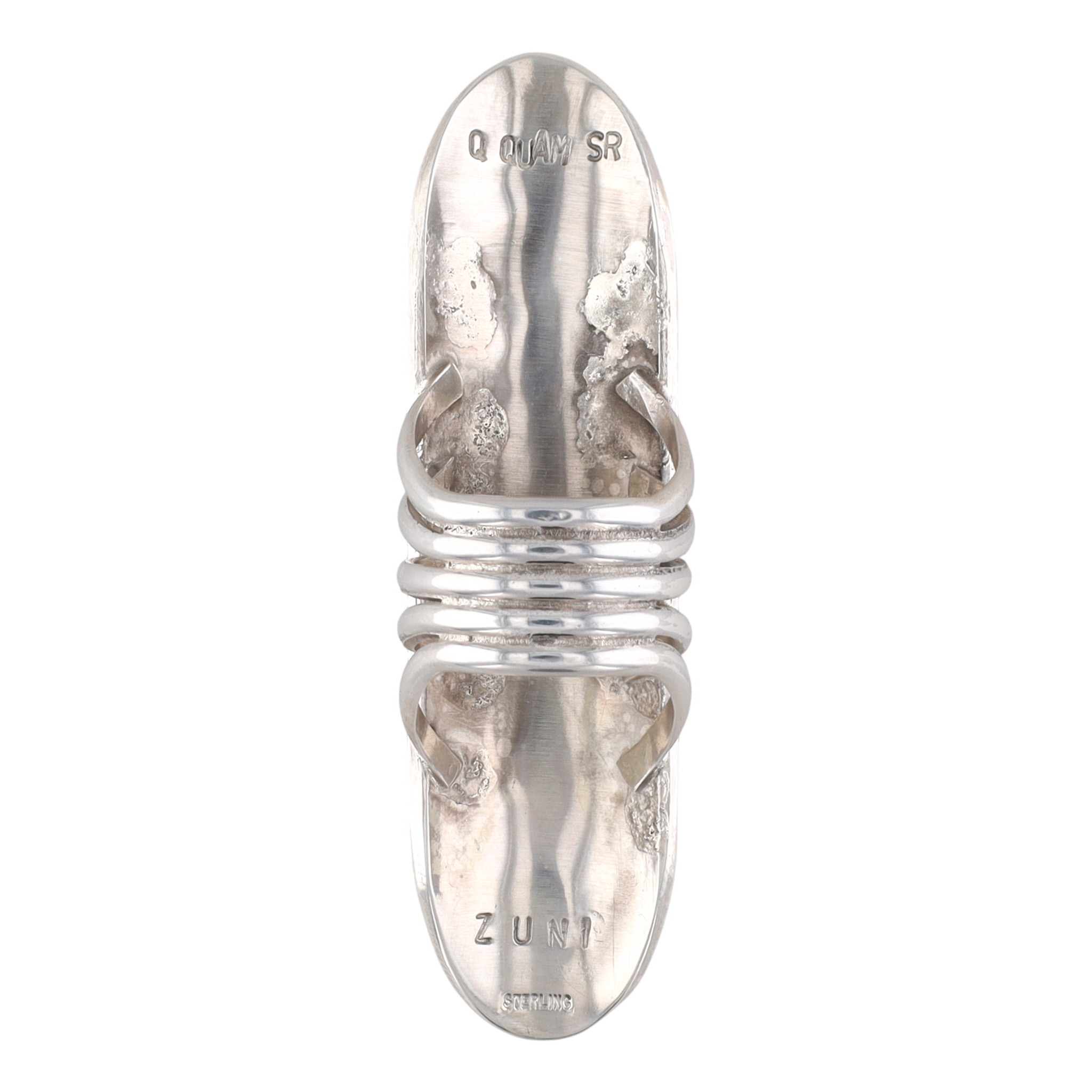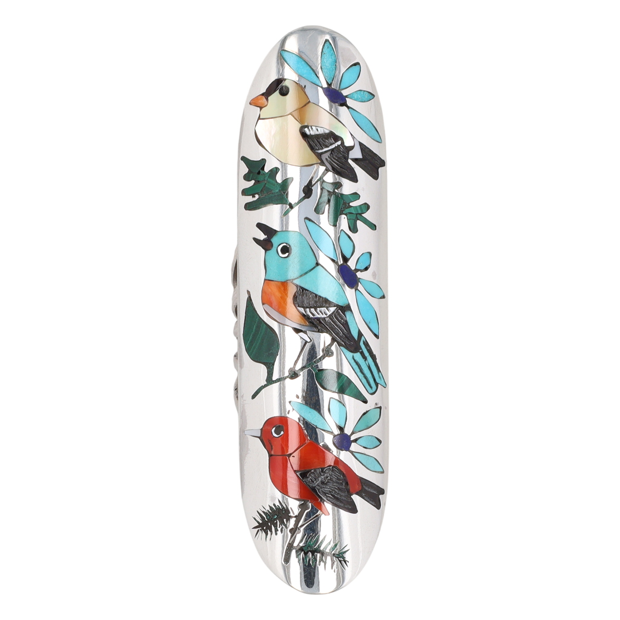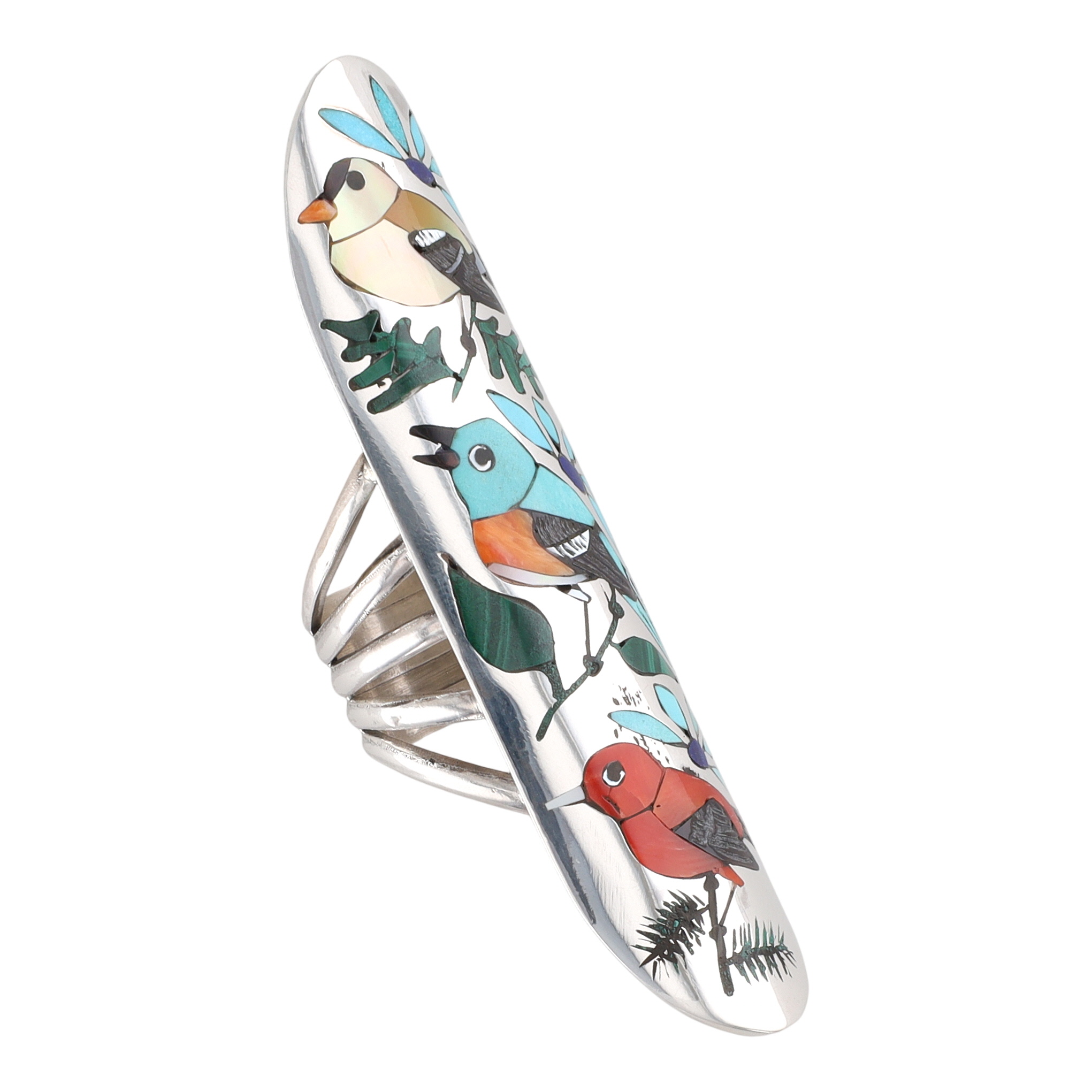 A Zuni sterling silver multi-stone ring by Q Quam Sr. The ring features an elongated, oval-shaped face adorned with intricate stone and shell inlay. The inlay depicts three birds perched among floral branches, utilizing mother of pearl, onyx, turquoise, coral, spiny oyster, malachite, and lapis. The reverse of the ring has a five-band shank and is clearly marked "Q QUAM SR, " "ZUNI, " and "STERLING."