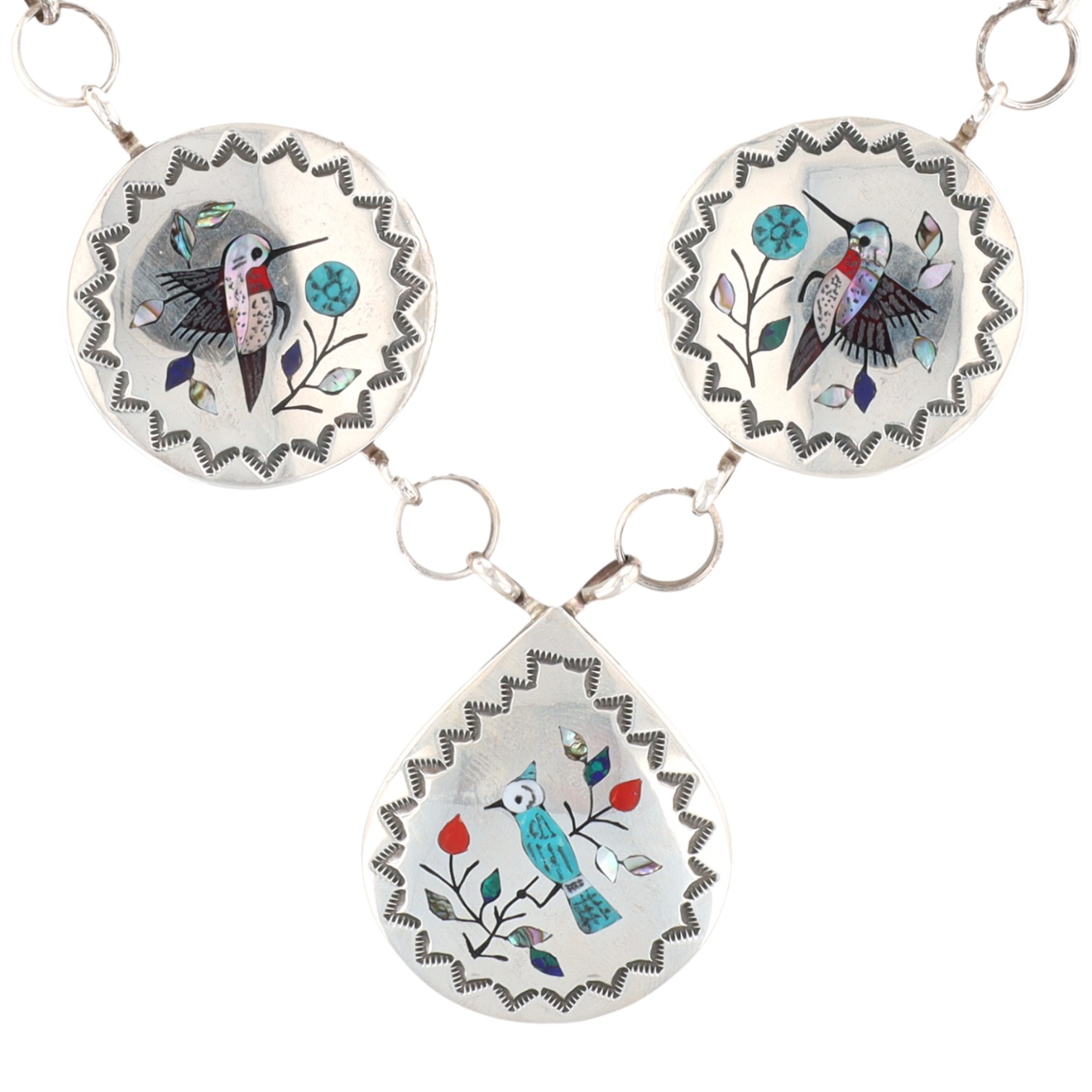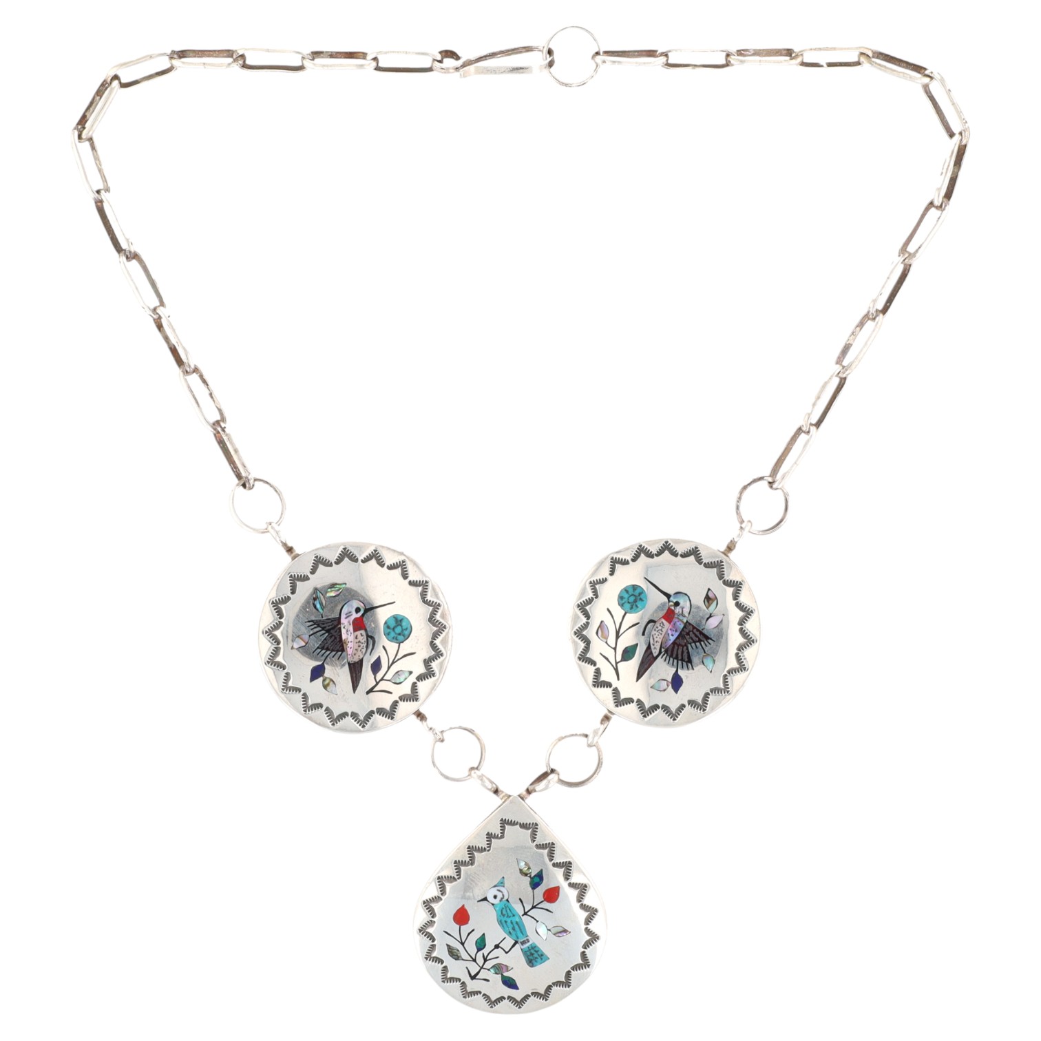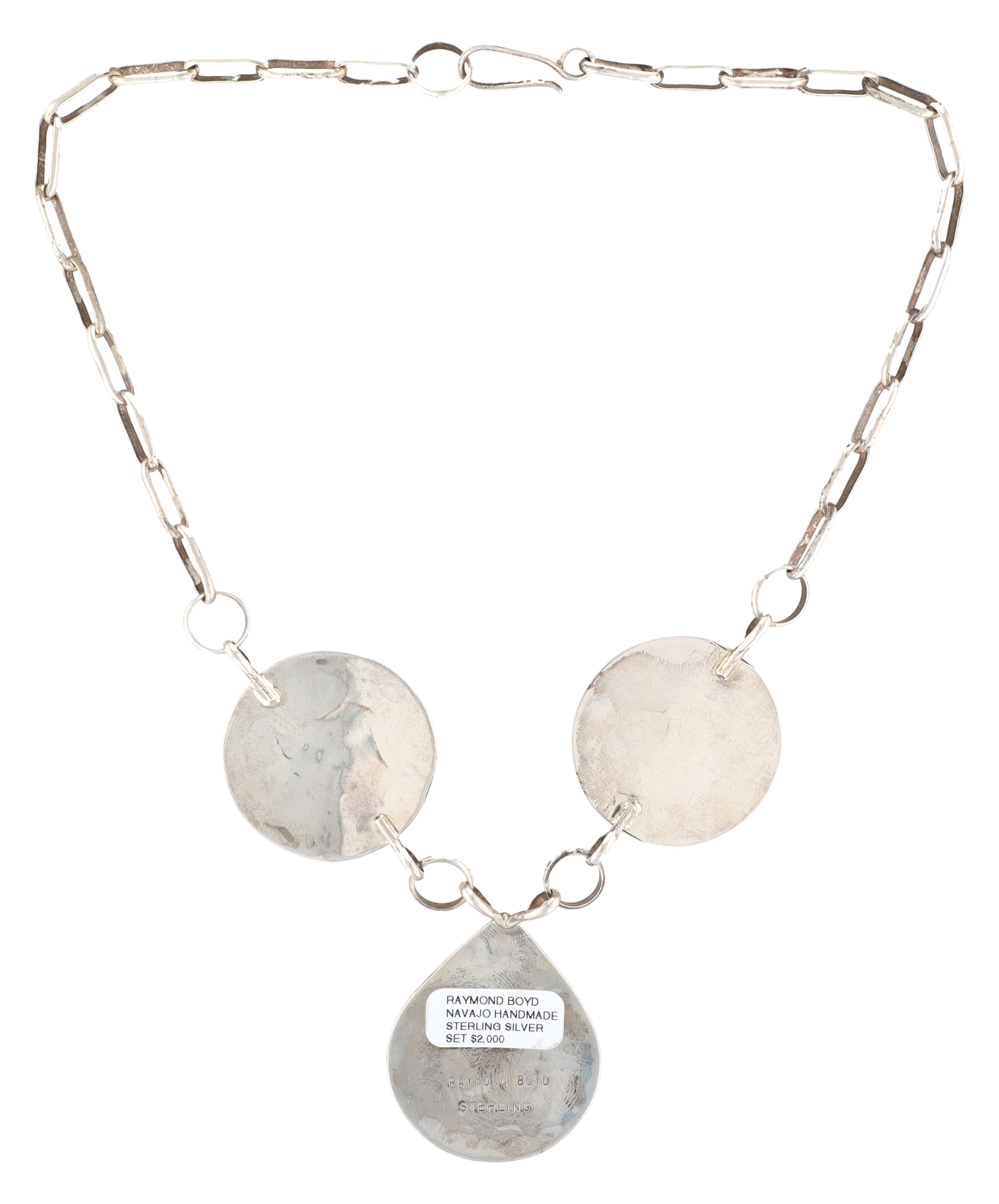 A sterling silver necklace by Raymond Boyd, featuring a linked chain and three pendants. The two circular and one central teardrop-shaped pendants display intricate mosaic inlay depicting hummingbirds and stylized floral motifs crafted from various colored materials, such as abalone, jet, coral, turquoise, and mother of pearl. The reverse of the teardrop pendant is stamped "RAYMOND BOYD" and "STERLING." An adhesive label identifies the item as "NAVAJO HANDMADE" by "RAYMOND BOYD."