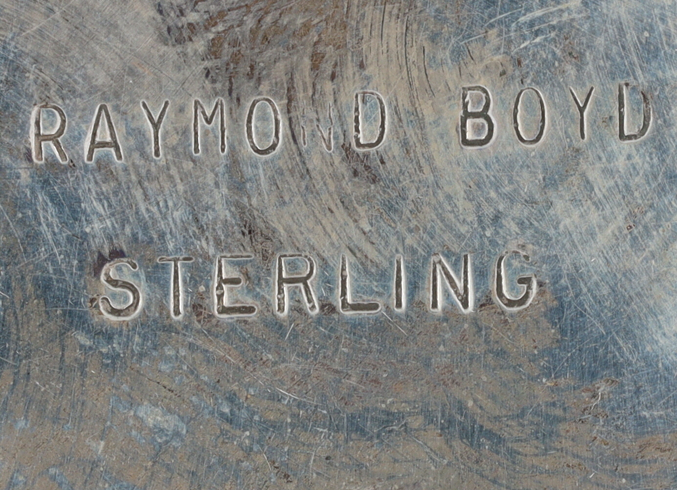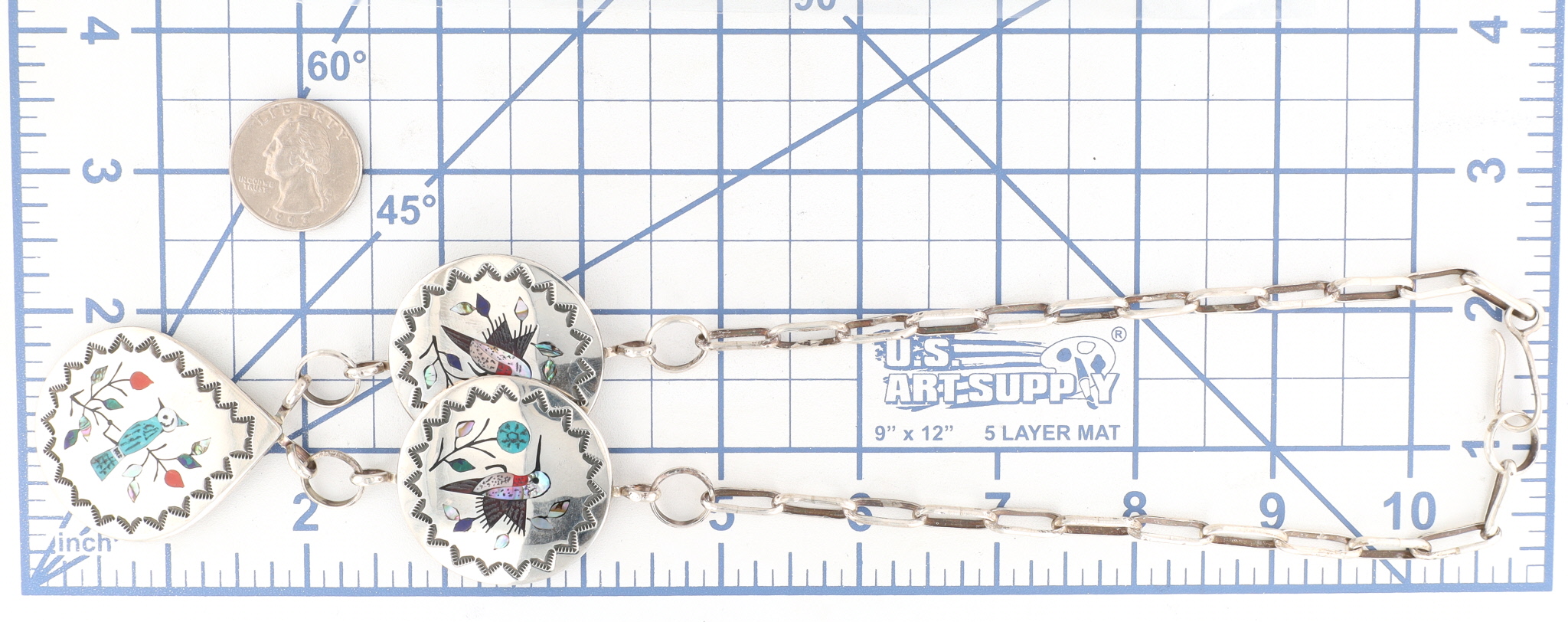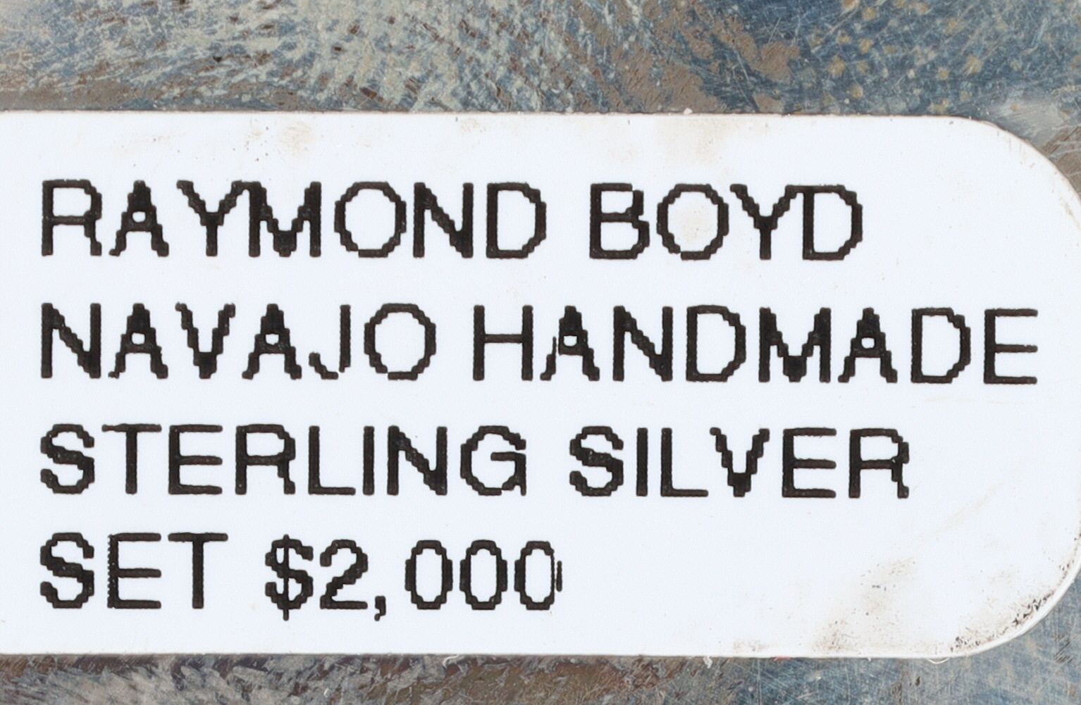 A sterling silver necklace by Raymond Boyd, featuring a linked chain and three pendants. The two circular and one central teardrop-shaped pendants display intricate mosaic inlay depicting hummingbirds and stylized floral motifs crafted from various colored materials, such as abalone, jet, coral, turquoise, and mother of pearl. The reverse of the teardrop pendant is stamped "RAYMOND BOYD" and "STERLING." An adhesive label identifies the item as "NAVAJO HANDMADE" by "RAYMOND BOYD."