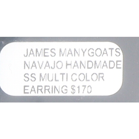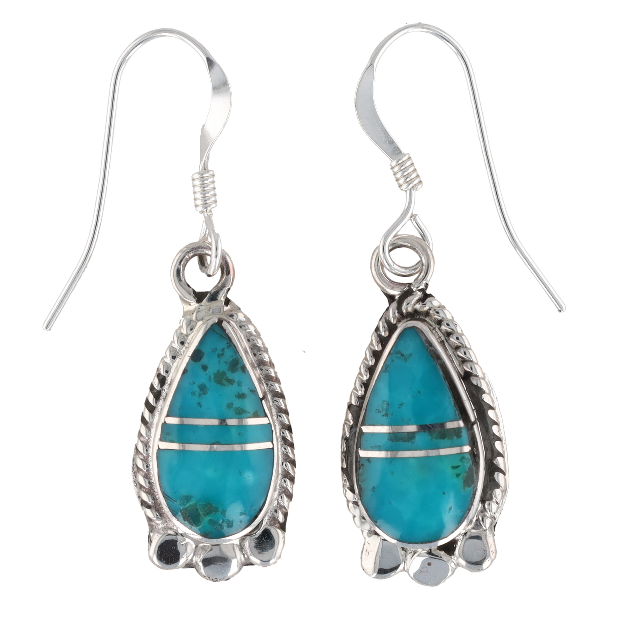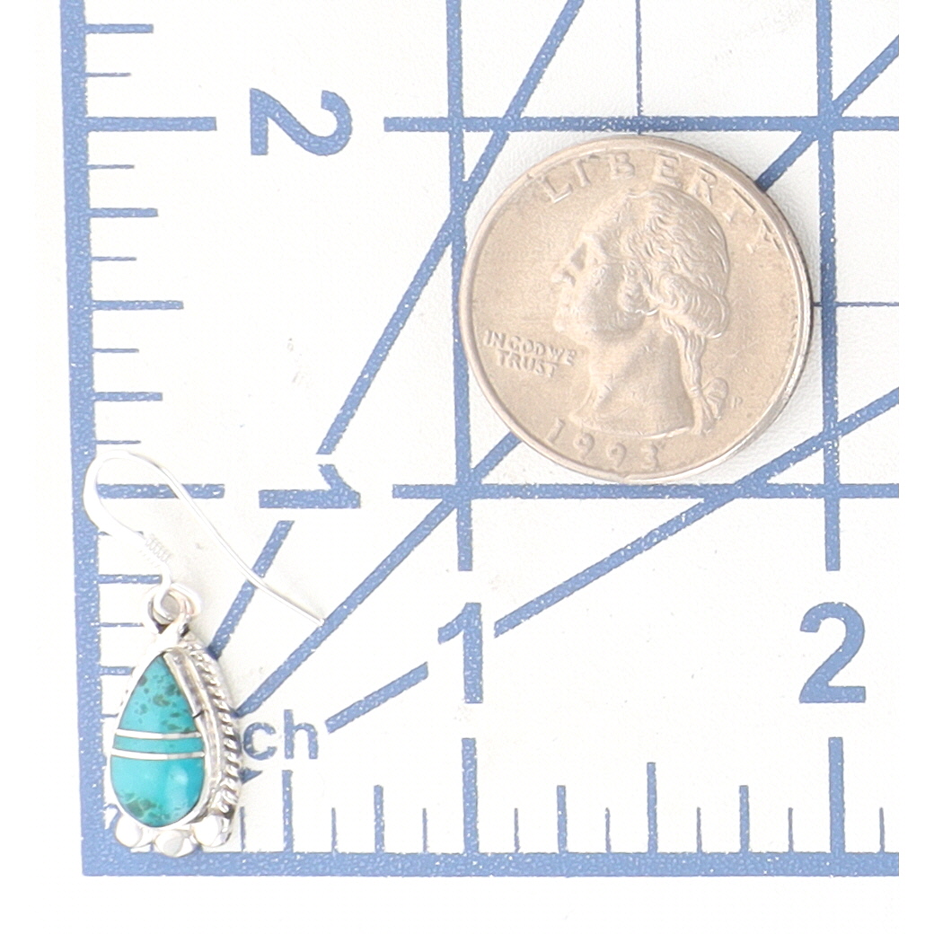 A pair of Navajo sterling silver and turquoise inlay dangle earrings by James Manygoats. Each earring features a teardrop-shaped drop crafted with mosaic or channel inlay of vibrant blue-green turquoise, interrupted by two thin, horizontal bands of a lighter, possibly silver or shell, material. Each inlaid stone is set within a silver-tone metal bezel adorned with a rope-twist border, and the base of each drop terminates in three small, decorative silver-tone spheres. The earrings are suspended from simple, curved ear hooks. No hallmarks are visible on the pieces themselves. Accompanied by a label stating ‘JAMES MANYGOATS NAVAJO HANDMADE SS MULTI COLOR EARRING’.