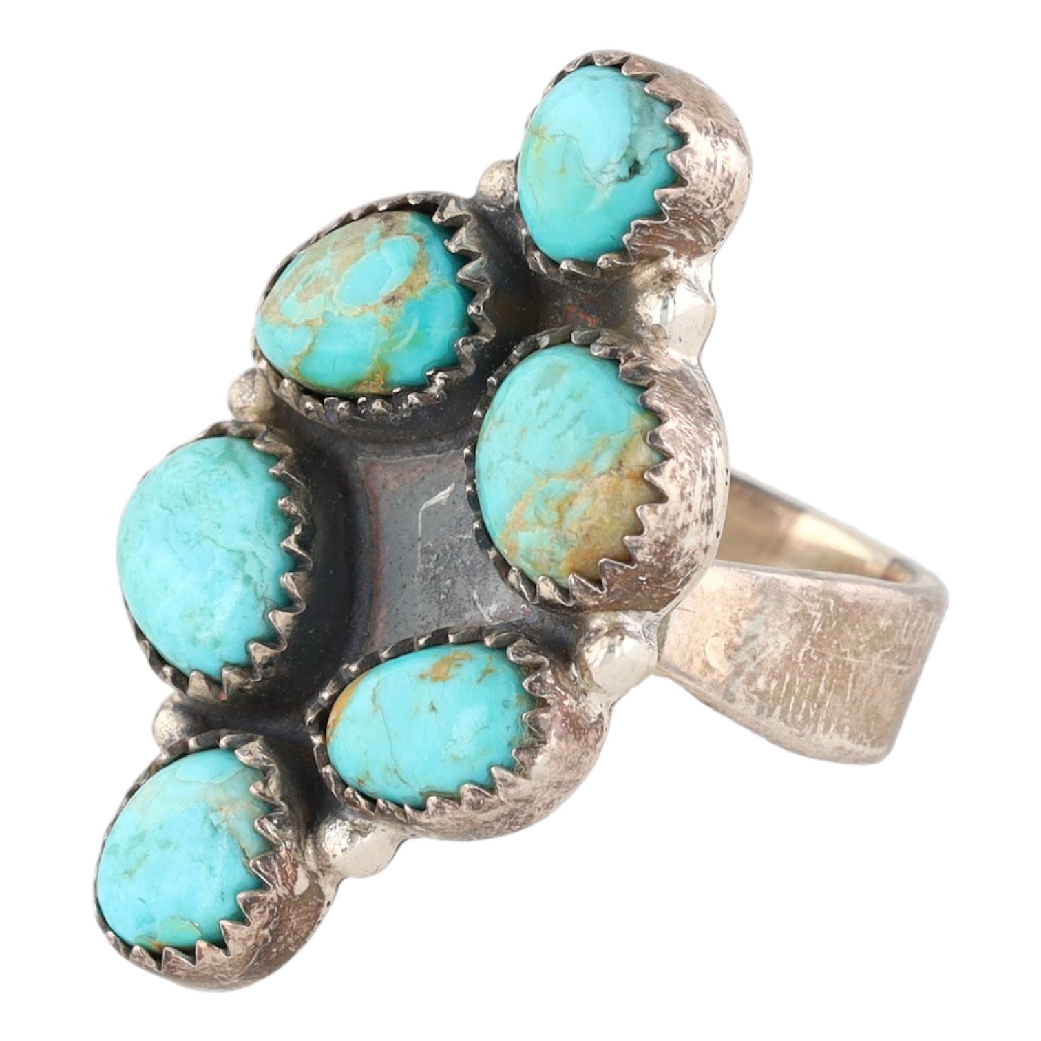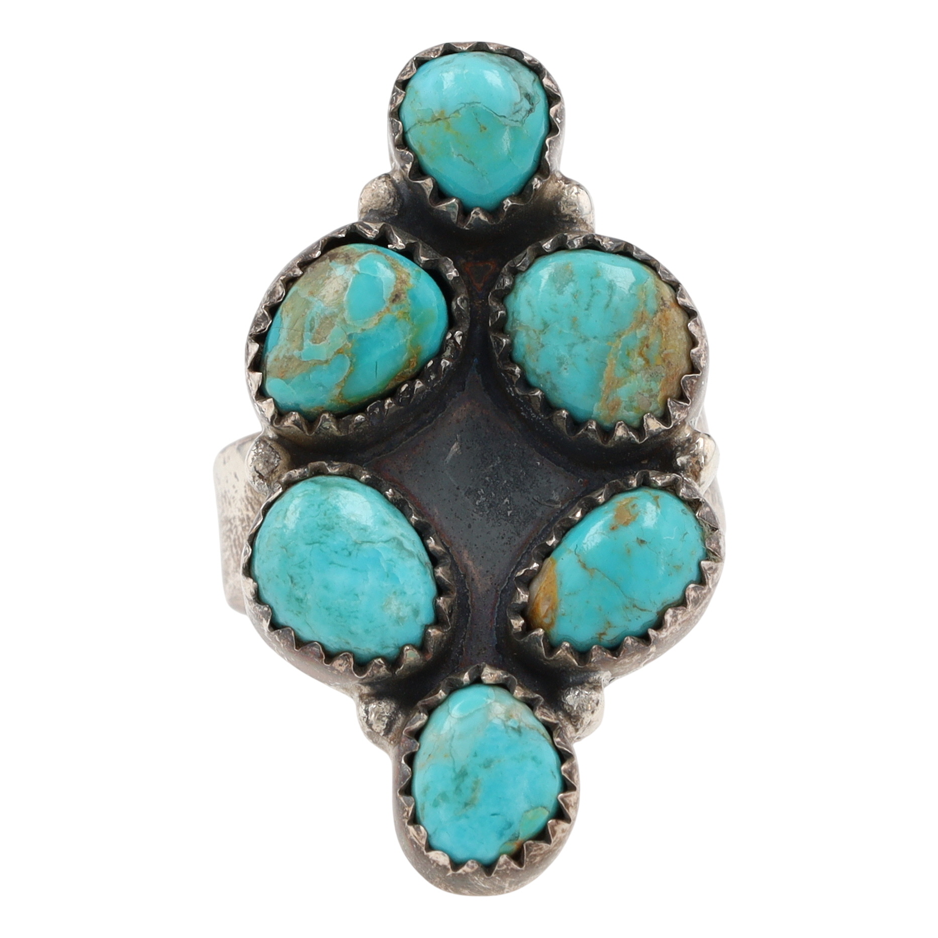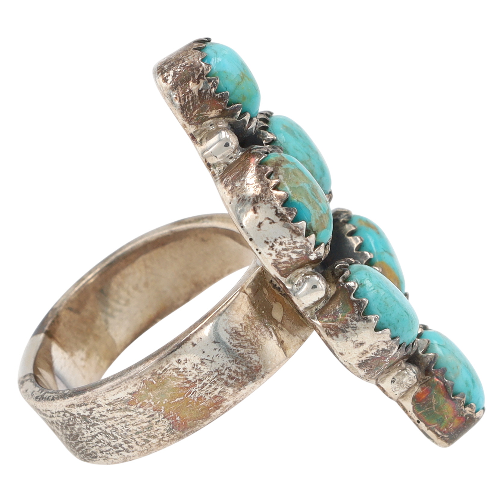 A HaDa Collection sterling silver finger ring featuring a prominent, elongated cluster design set with six oval to pear-shaped Kingman turquoise cabochons. The stones display varied blue-green hues with natural matrixing and are individually bezel-set with serrated edges, surrounding a central, darkened open area. The silver-toned metal, confirmed as "sterling" by an internal stamp, exhibits a textured finish on the band and a dark patina in recessed areas. The reverse of the setting is also marked with "HaDa" in a script font.