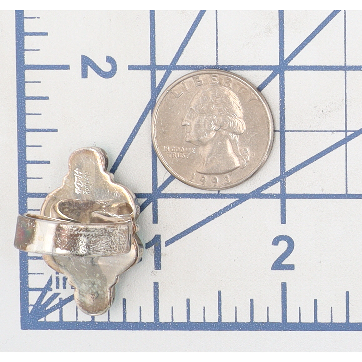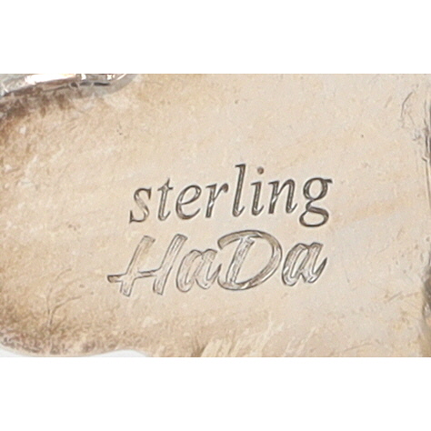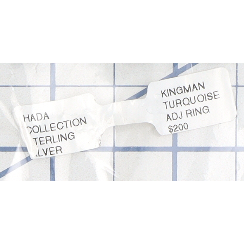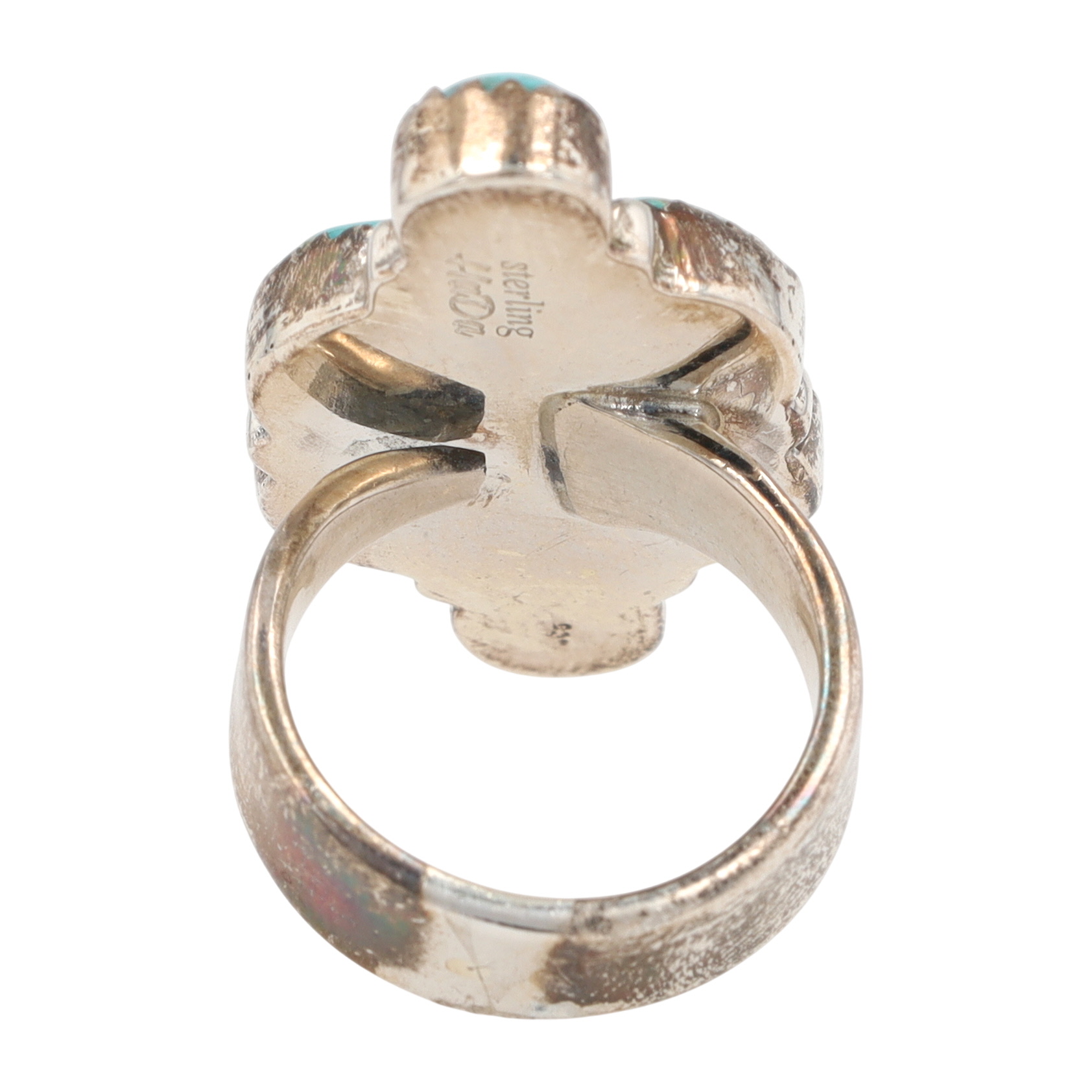 A HaDa Collection sterling silver finger ring featuring a prominent, elongated cluster design set with six oval to pear-shaped Kingman turquoise cabochons. The stones display varied blue-green hues with natural matrixing and are individually bezel-set with serrated edges, surrounding a central, darkened open area. The silver-toned metal, confirmed as "sterling" by an internal stamp, exhibits a textured finish on the band and a dark patina in recessed areas. The reverse of the setting is also marked with "HaDa" in a script font.